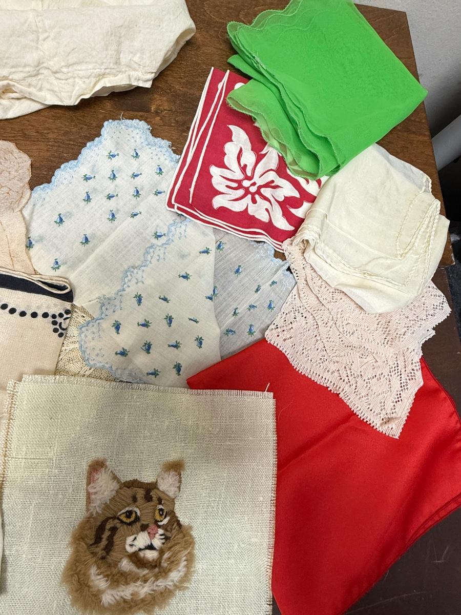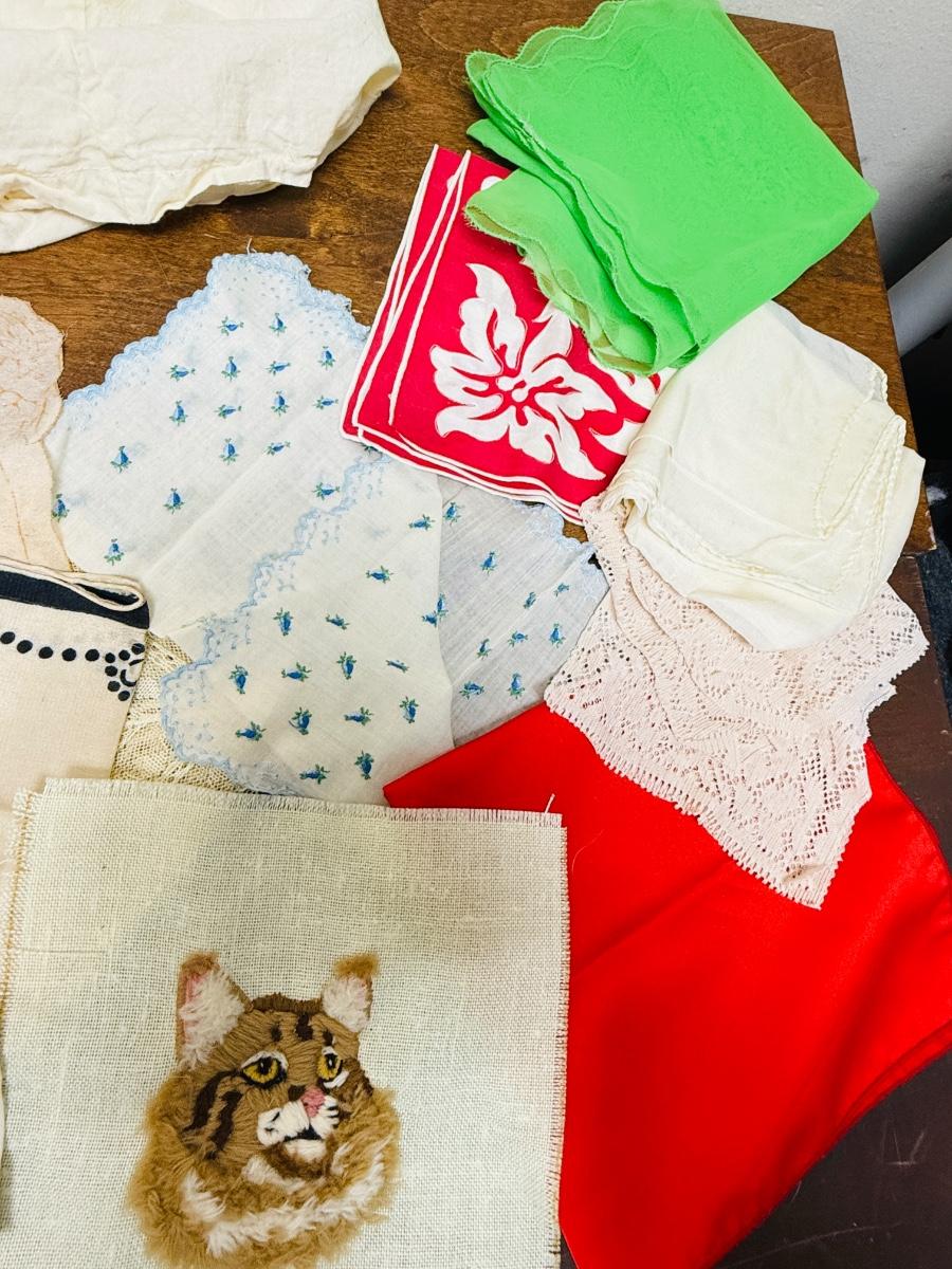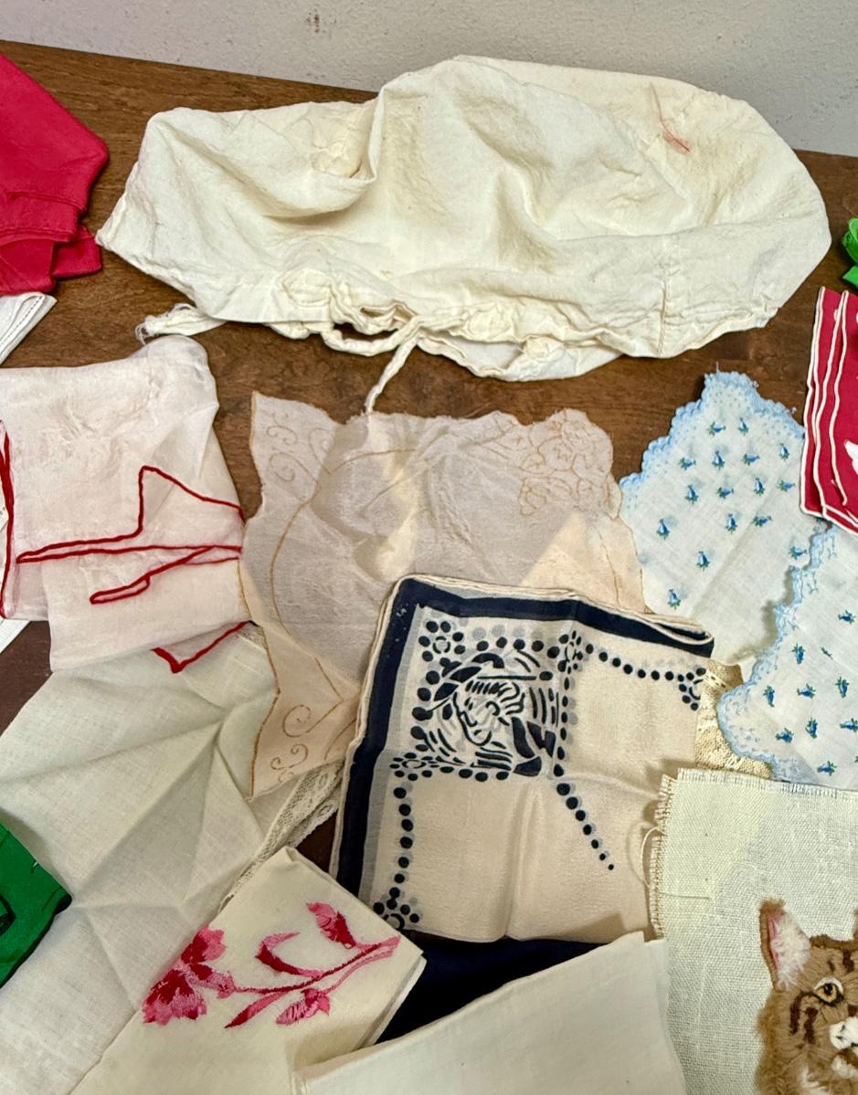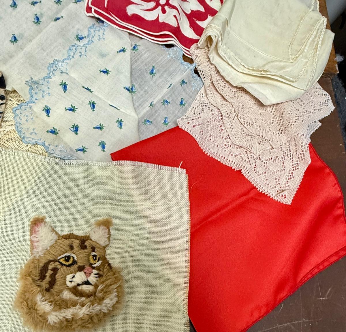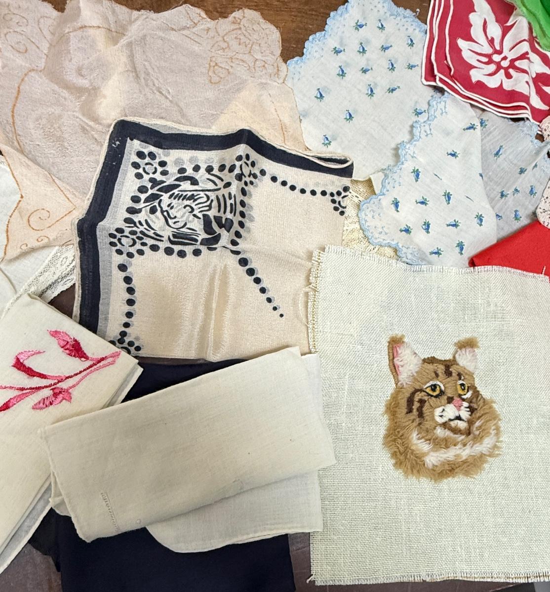 Vintage Handkerchief Lot with Granny Hat & stitched Cat on Fabric