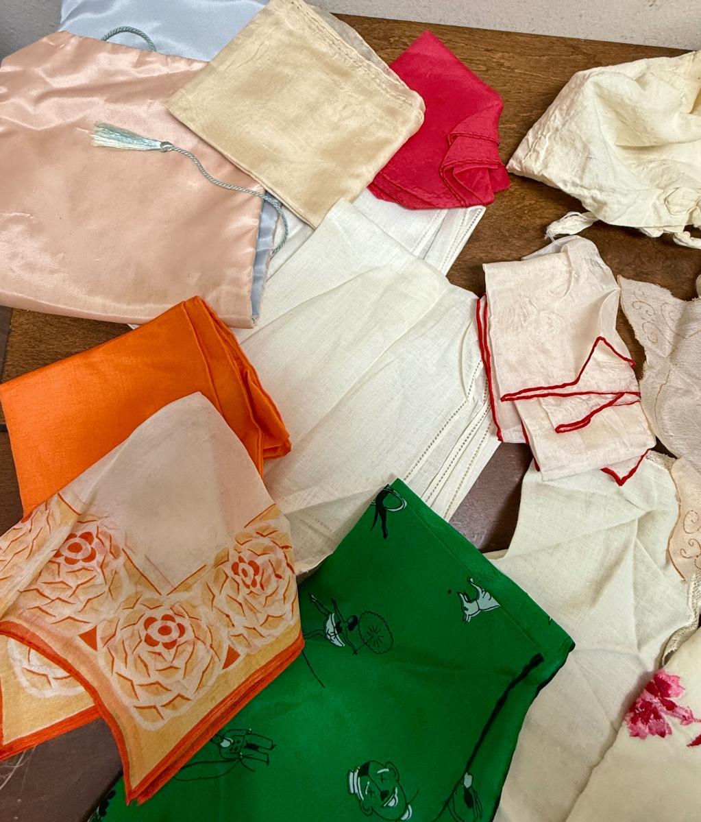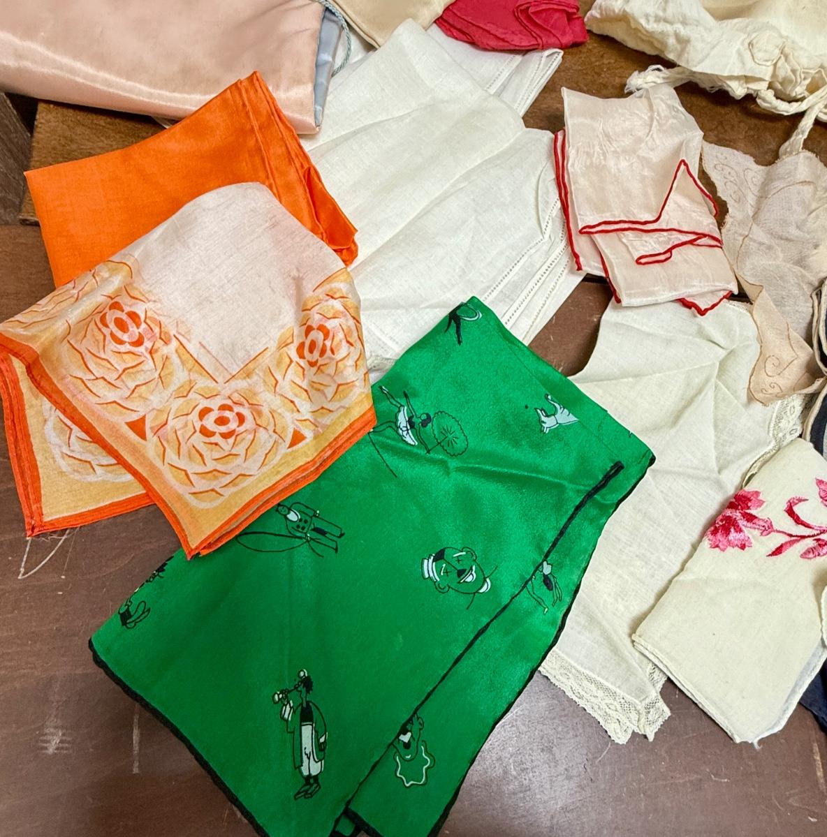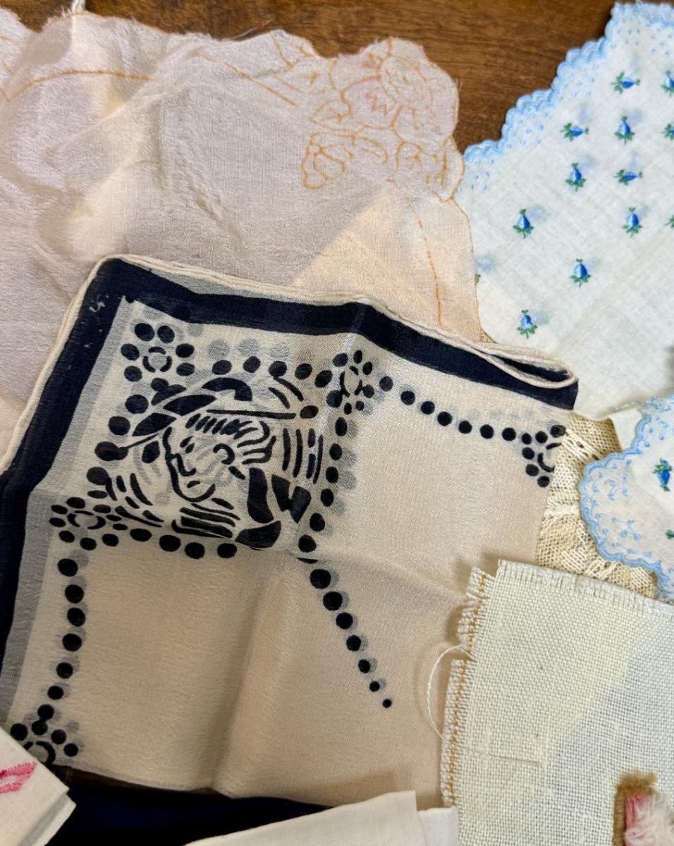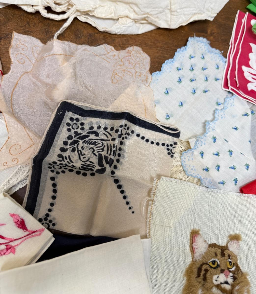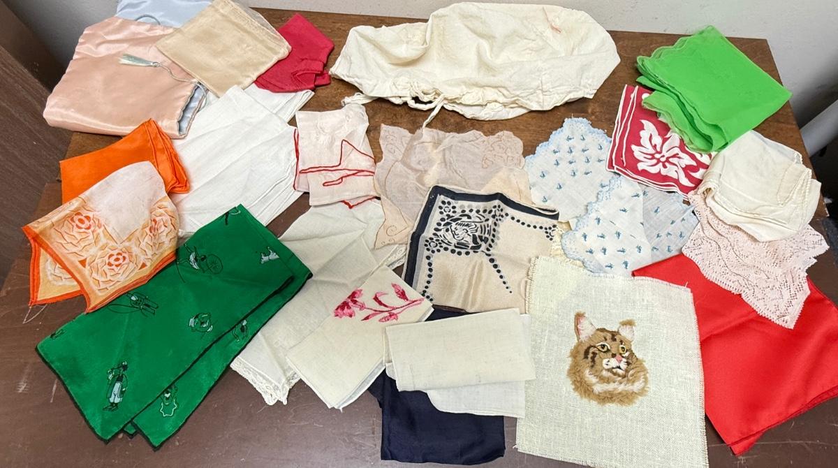 Vintage Handkerchief Lot with Granny Hat & stitched Cat on Fabric
