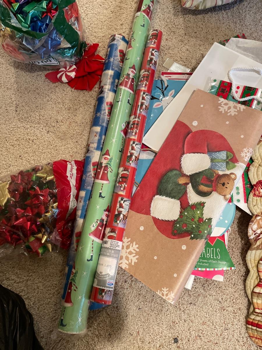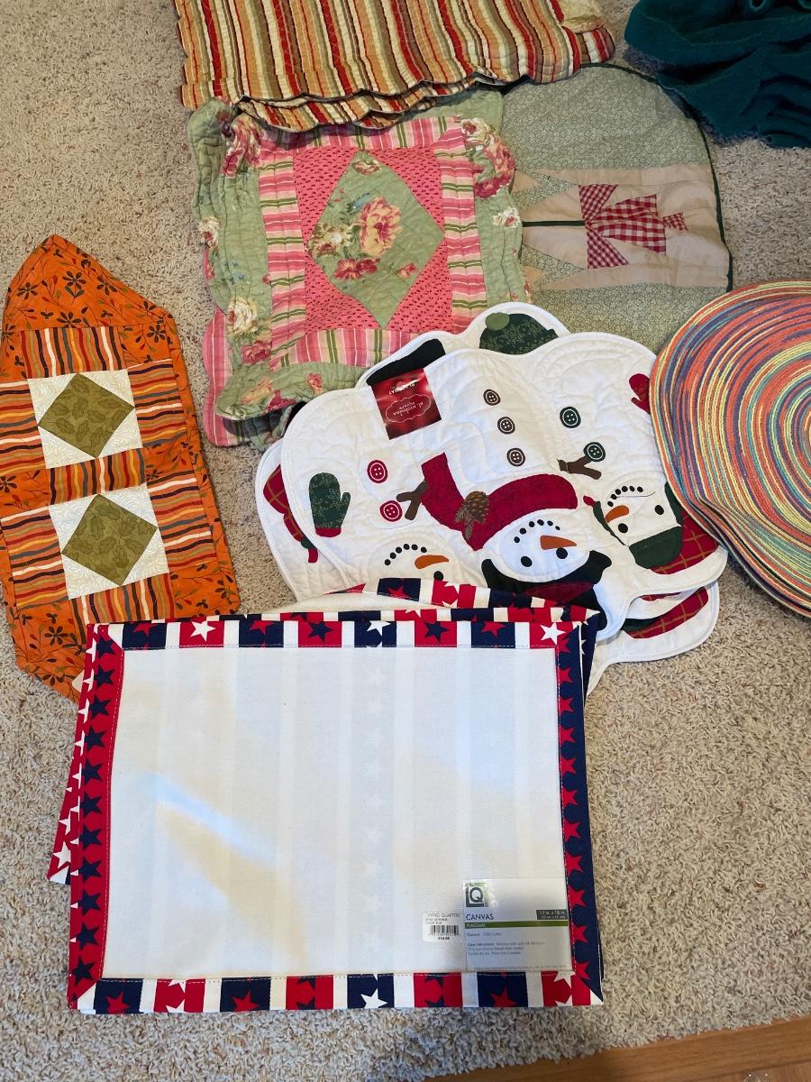 Two rolls of wrapping paper, a new and package some of the placemats have tags still on them
