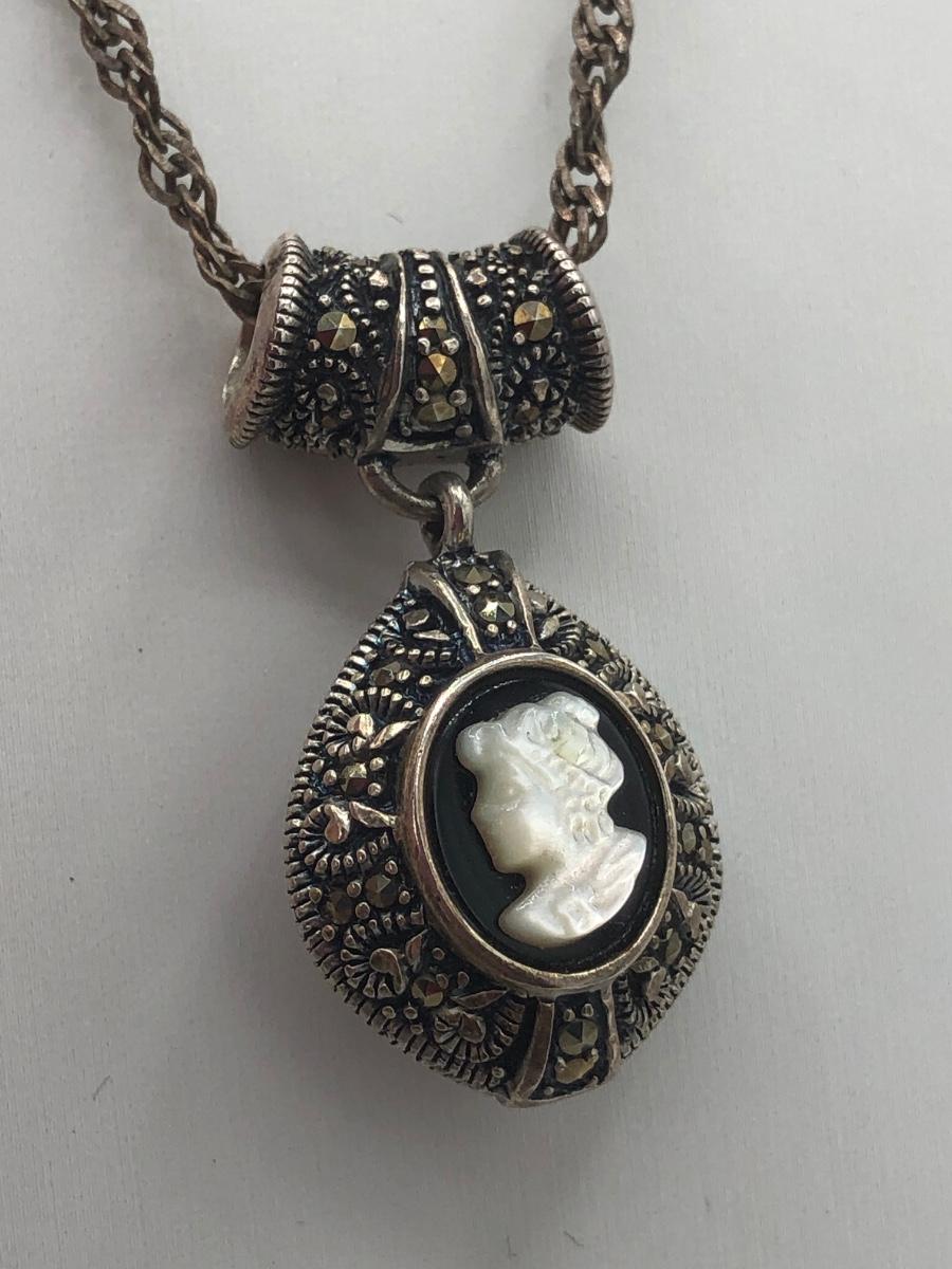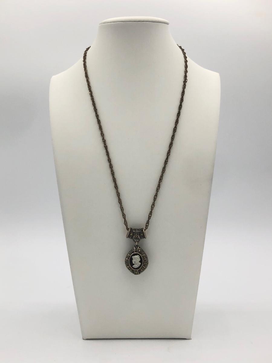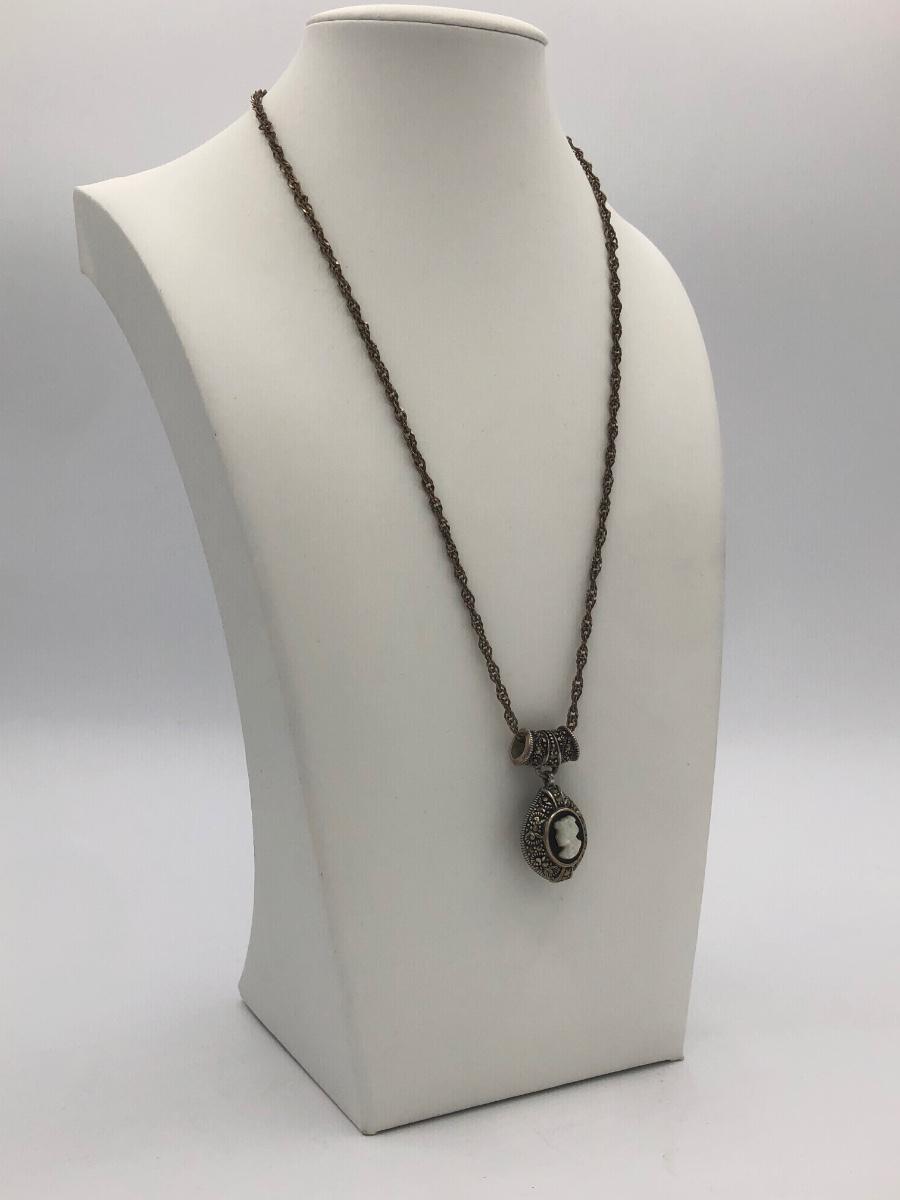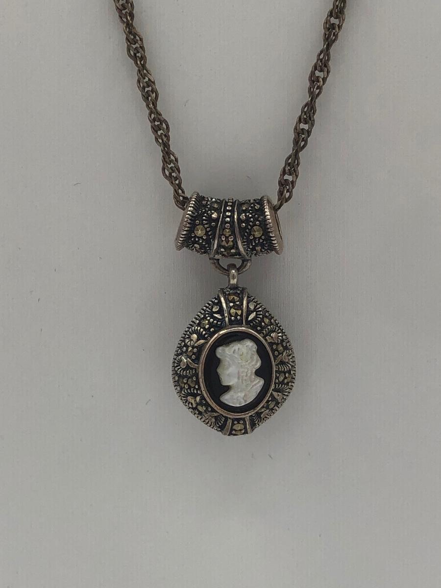LOT 1J: Vintage Sterling Silver & Marcasite Cameo Slide Pendant on 20” Milor Italy925 Chain (20gtw)