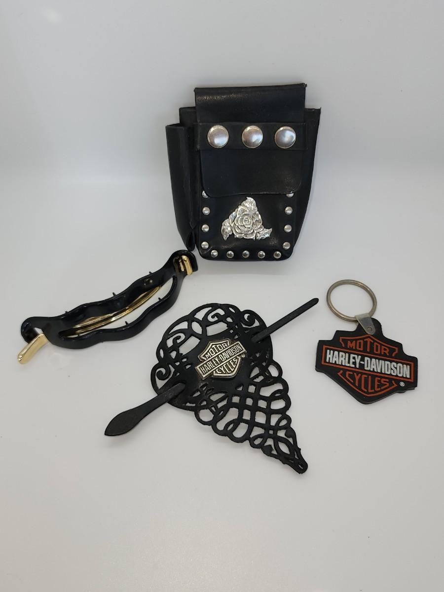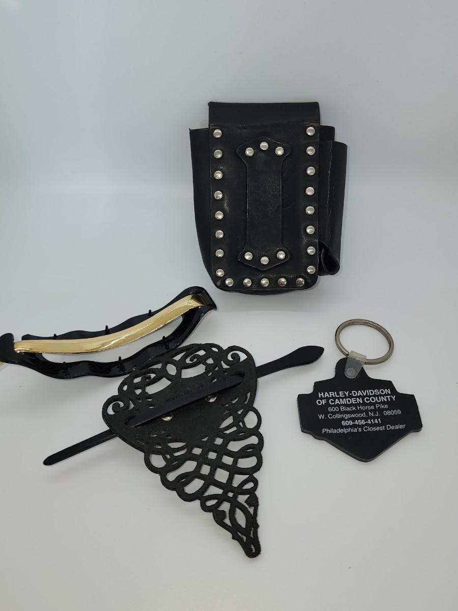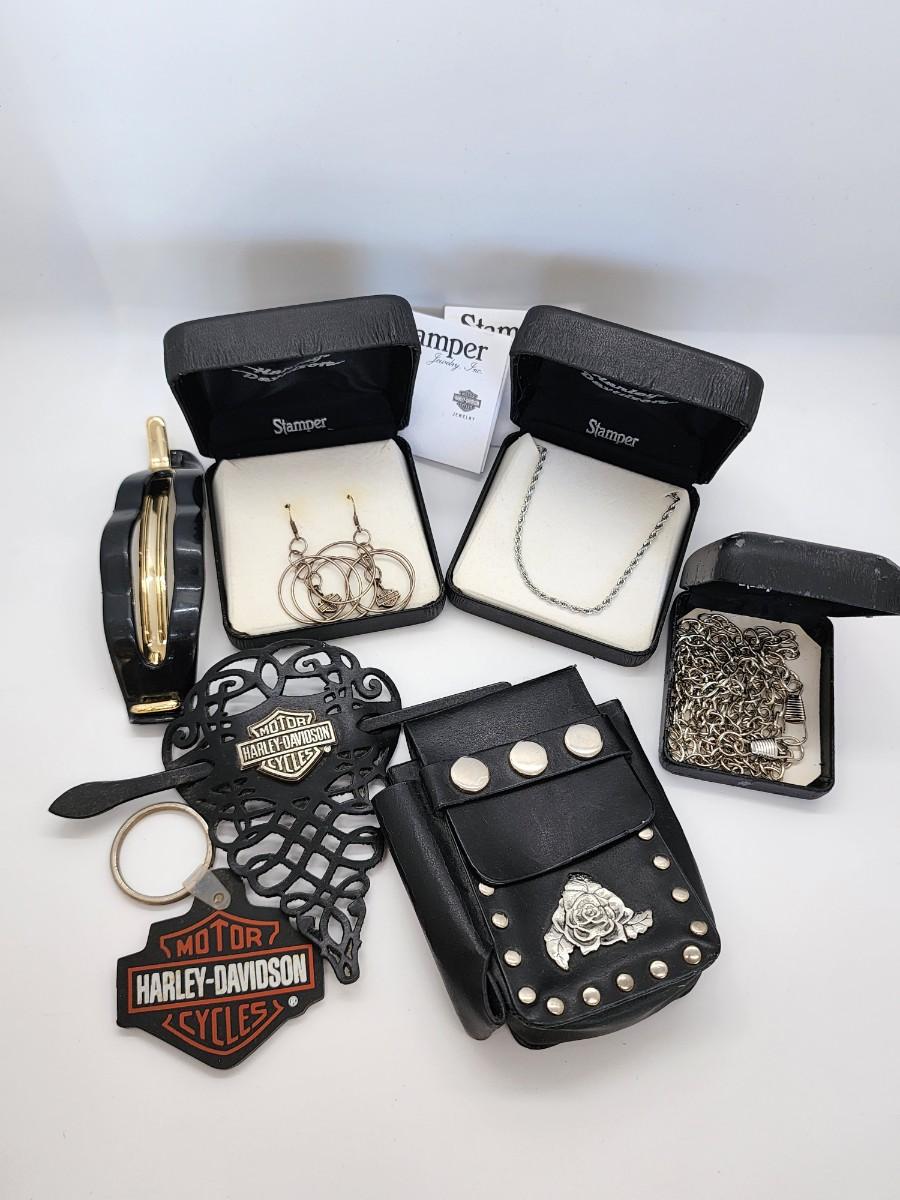 2" L earrings- 30" L necklace and 48" L wallet chain. Leather cigarette case regular size One long barette does not say Harley