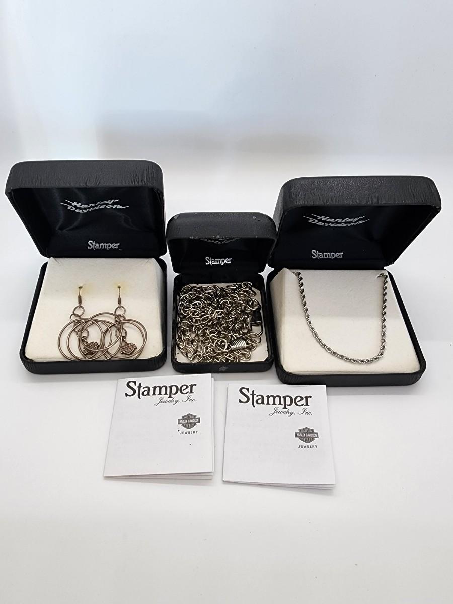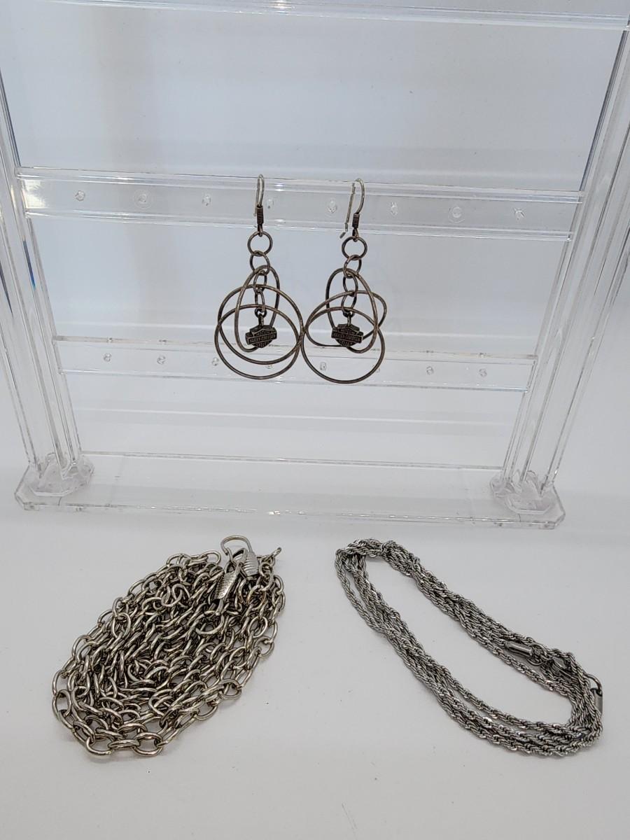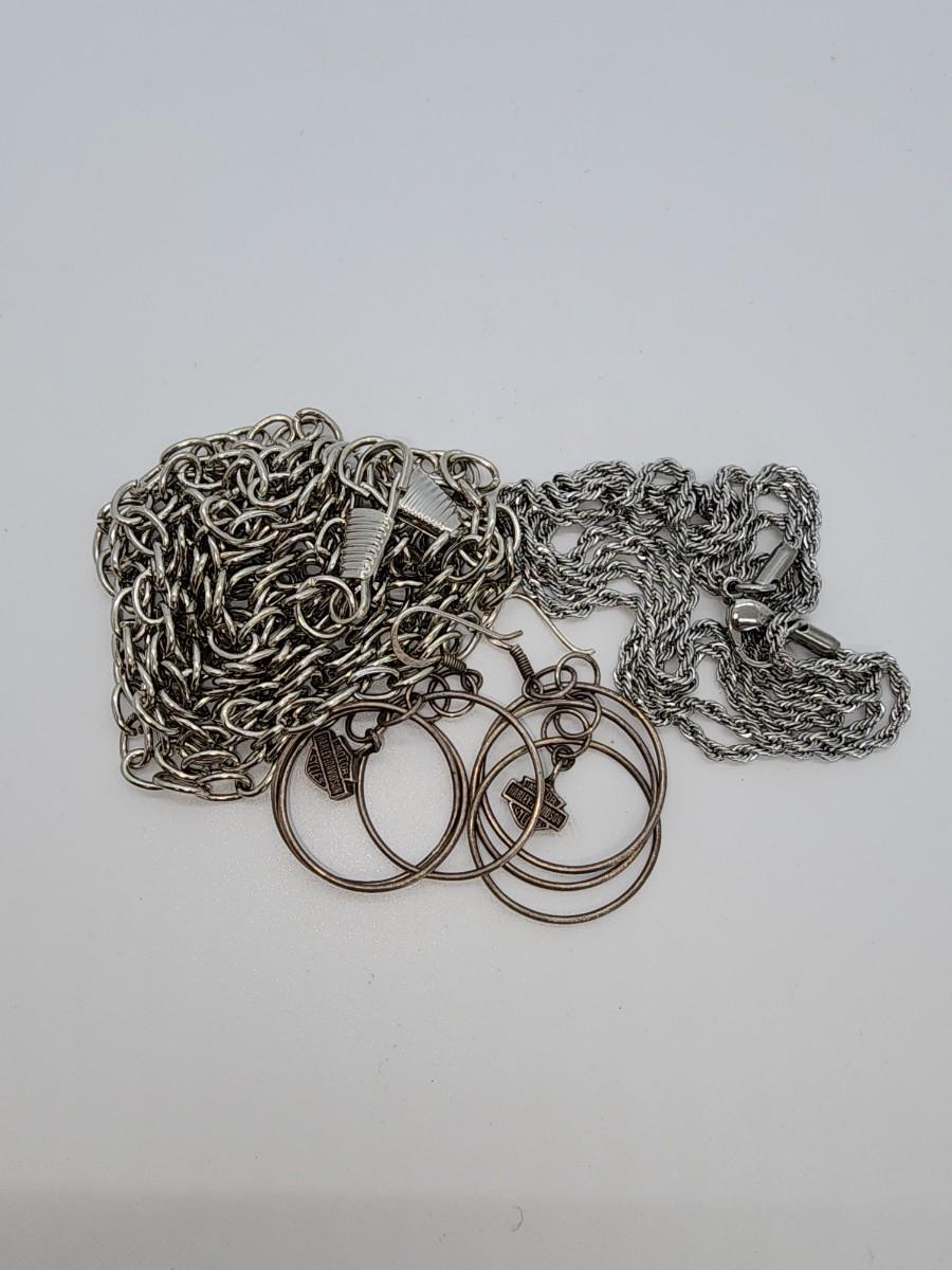 2" L earrings- 30" L necklace and 48" L wallet chain. Leather cigarette case regular size One long barette does not say Harley