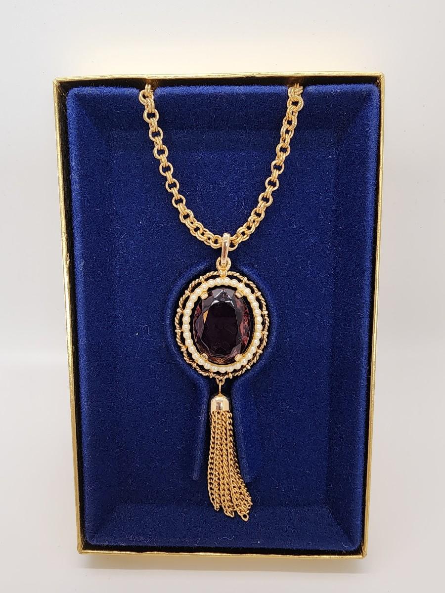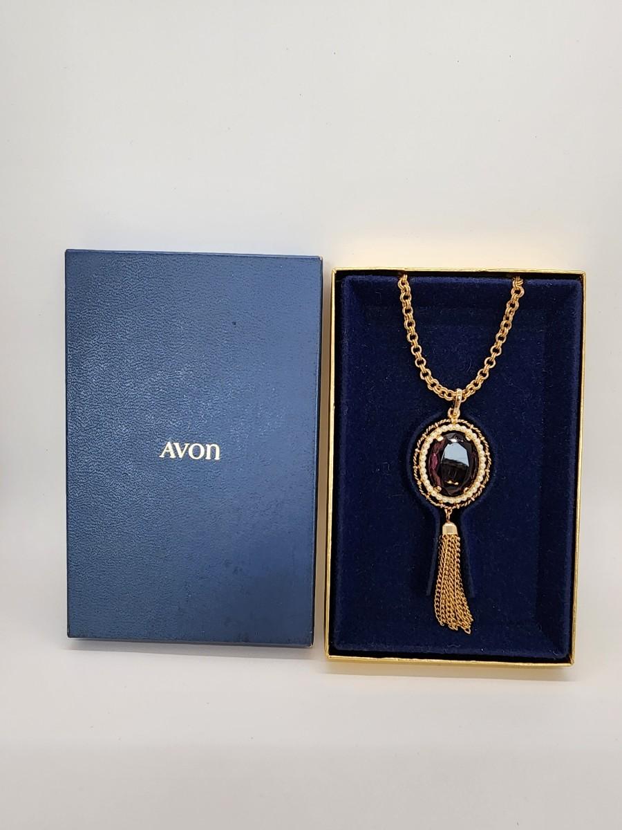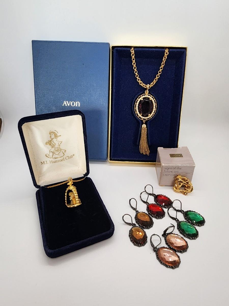 Lot 116: Vintage New old stock Avon Tassel Necklace, Hummel Necklace, Avon Pin and 4 pair new earrings in gift box