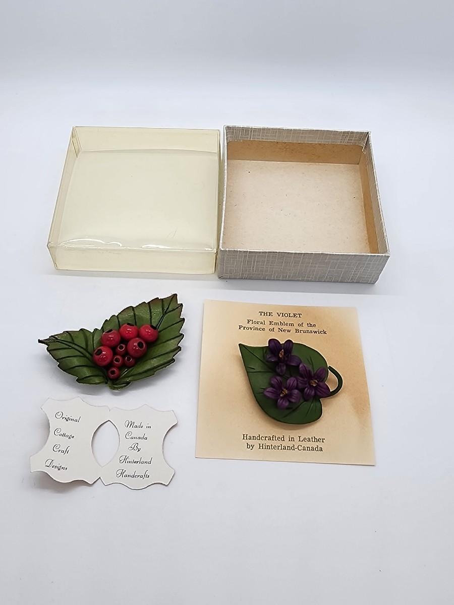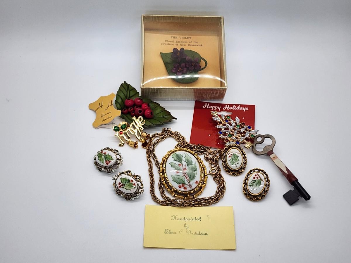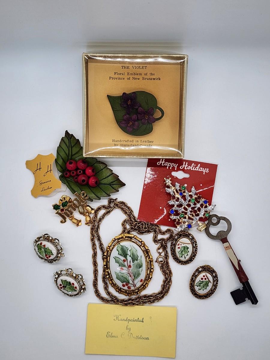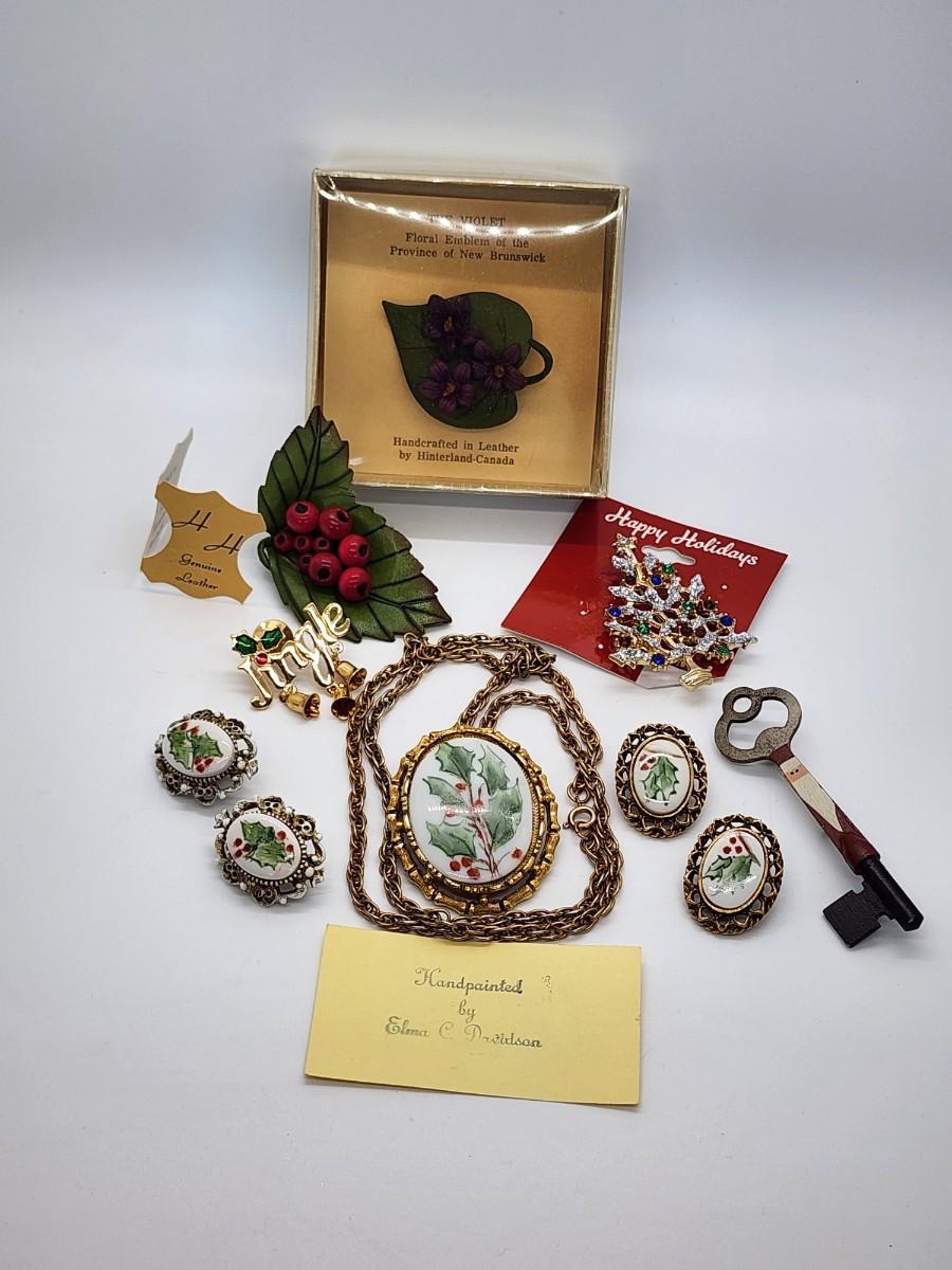 Lot 126: Christmas lot- handpainted Ceramic jewelry, handcrafted Leather brooches and more!