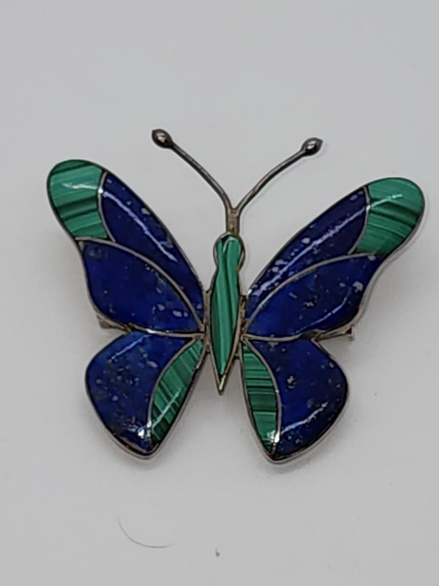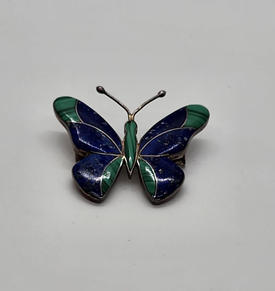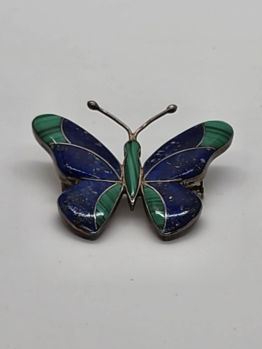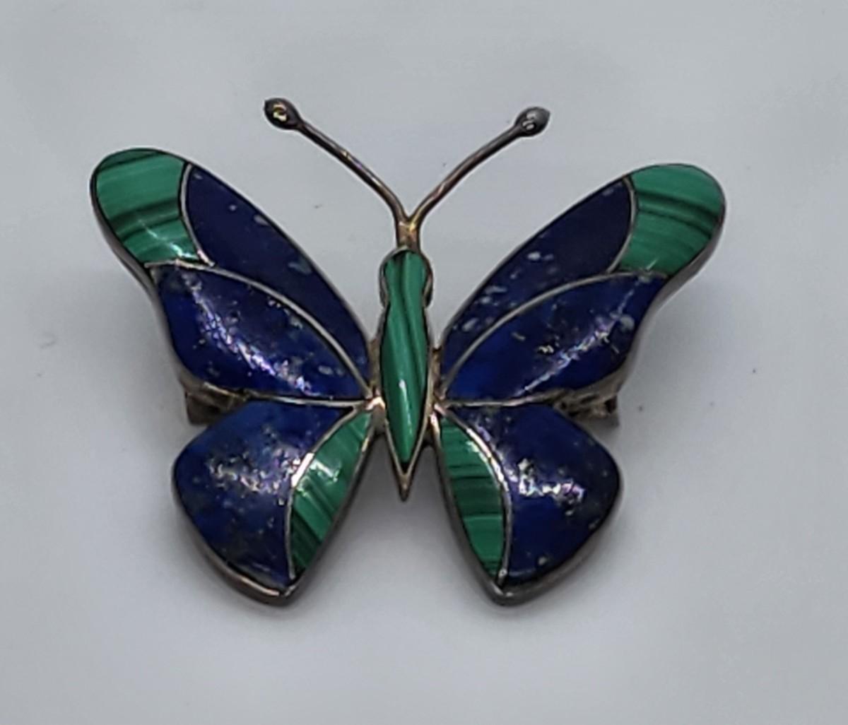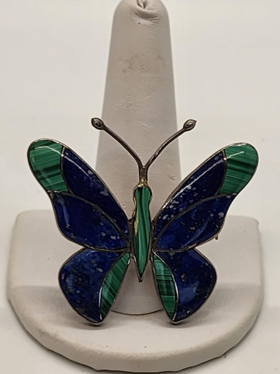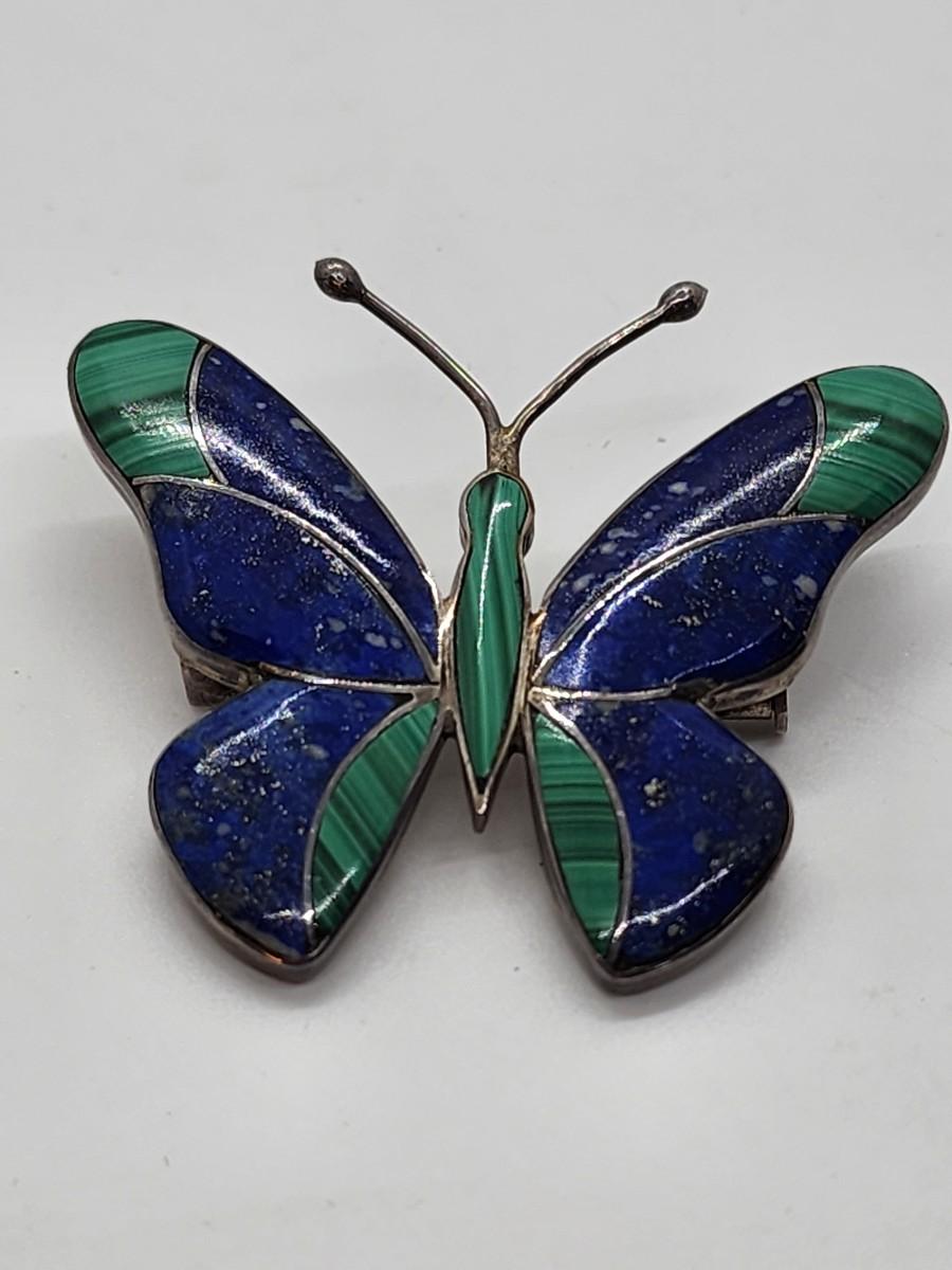 Lot 141: Fine Sterling Silver 950 Blue Lapis Lazuli and Malachite Butterfly Brooch with trombone clasp