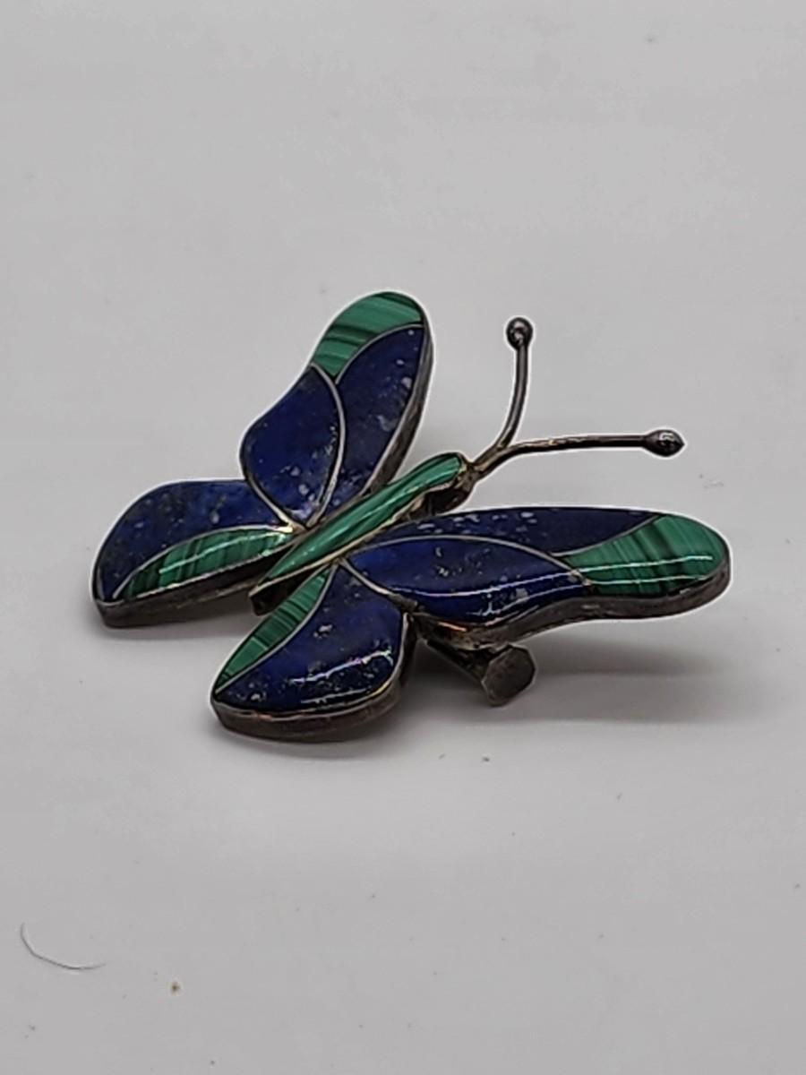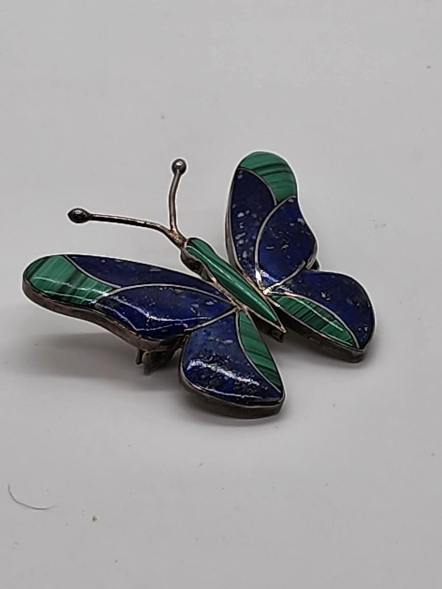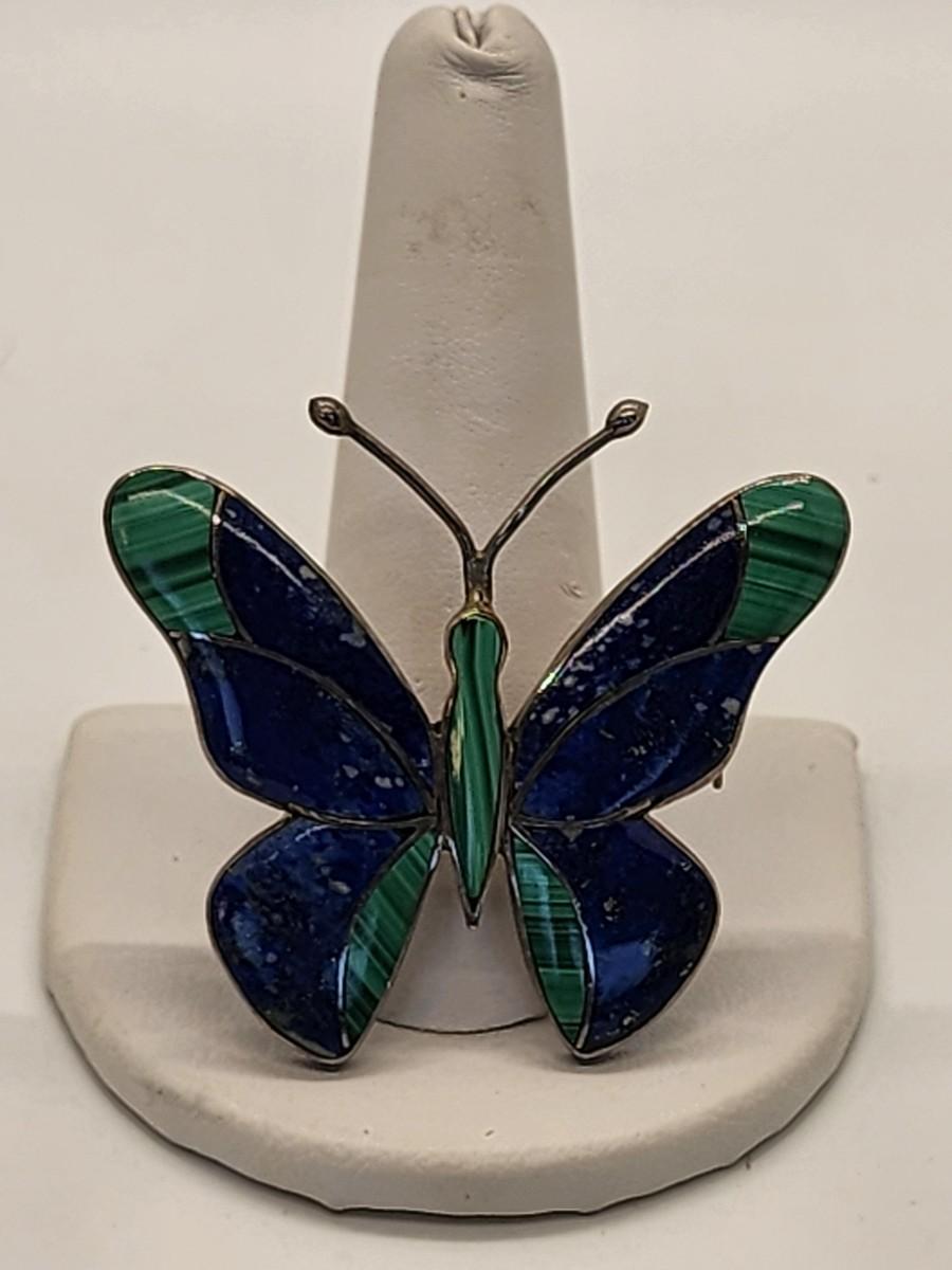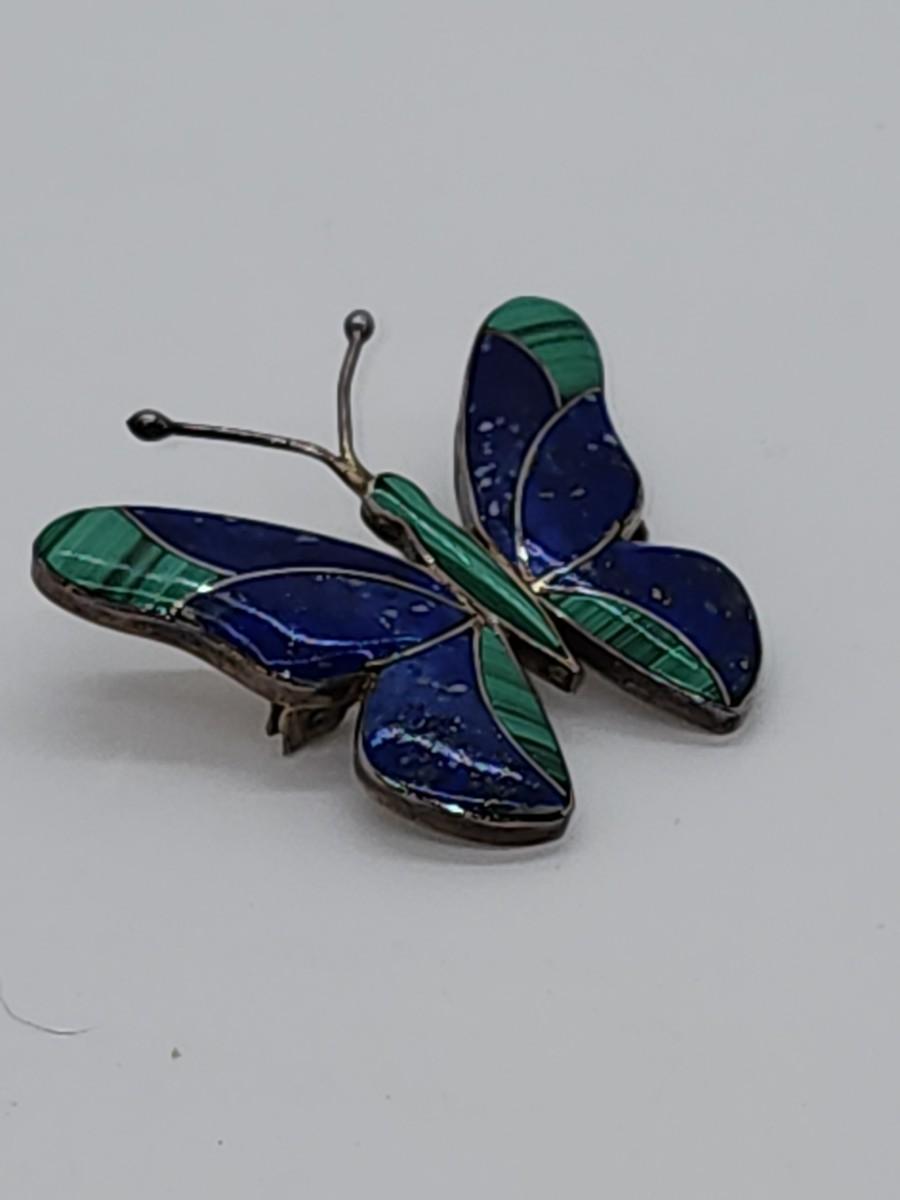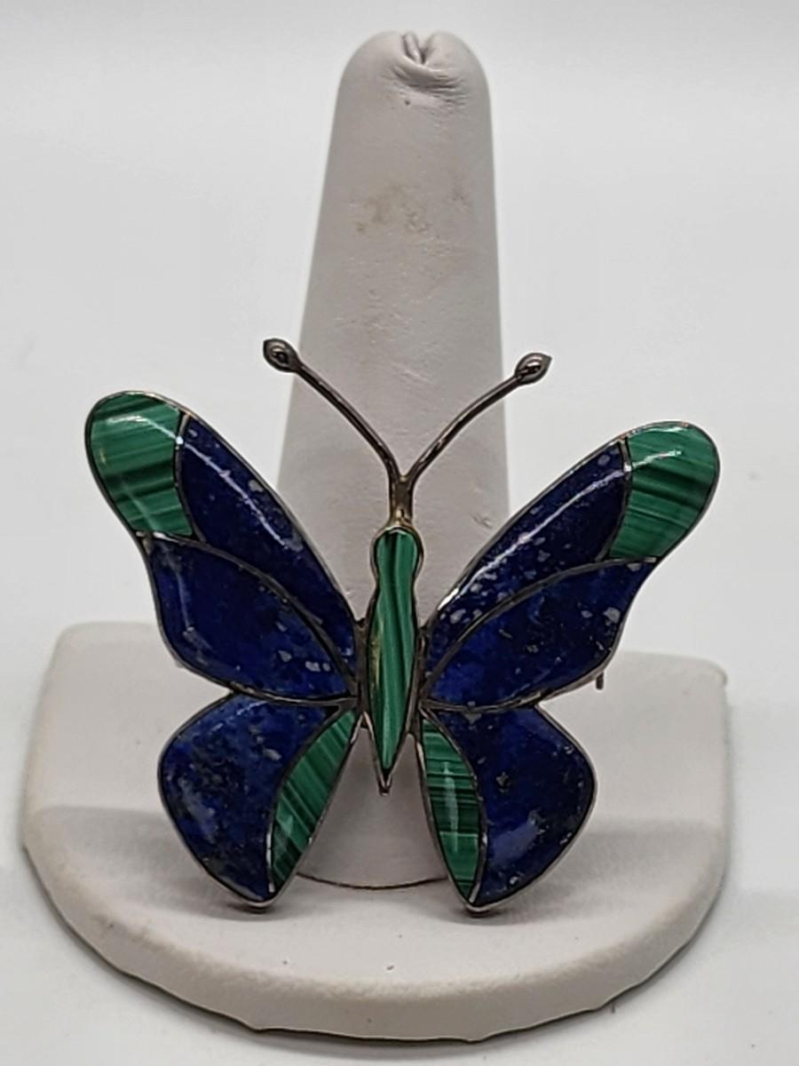 Lot 141: Fine Sterling Silver 950 Blue Lapis Lazuli and Malachite Butterfly Brooch with trombone clasp