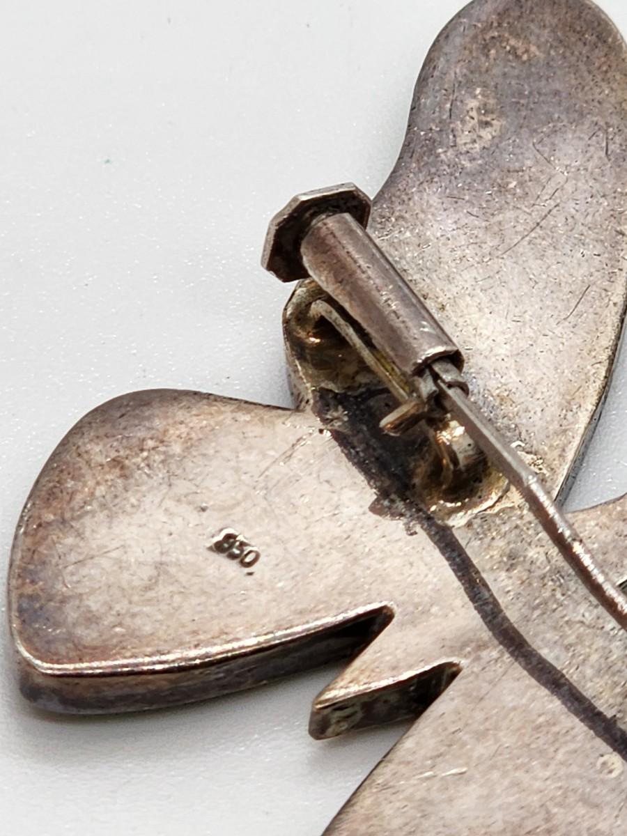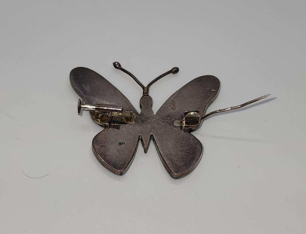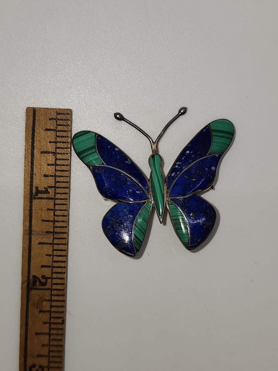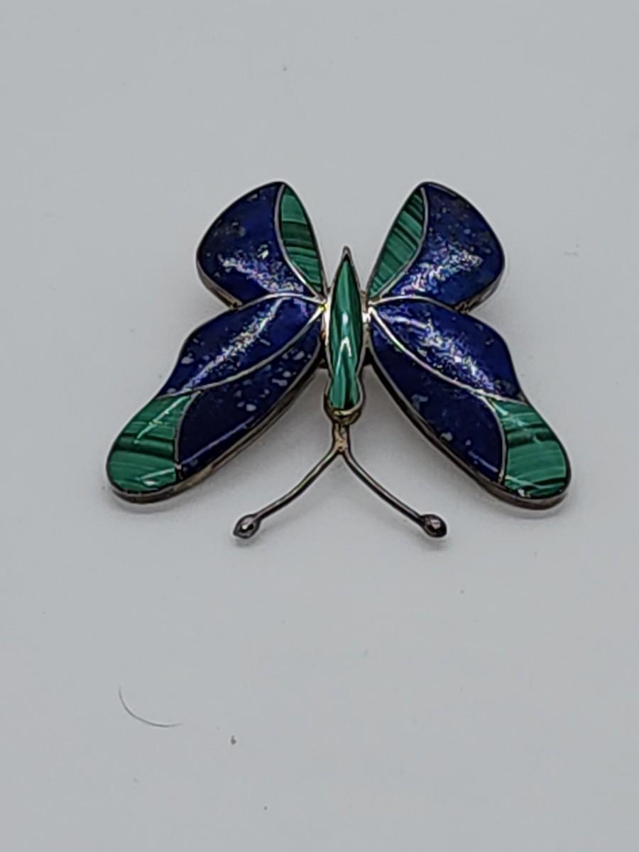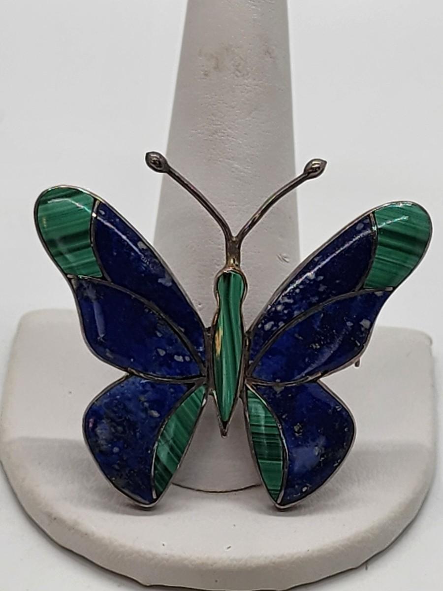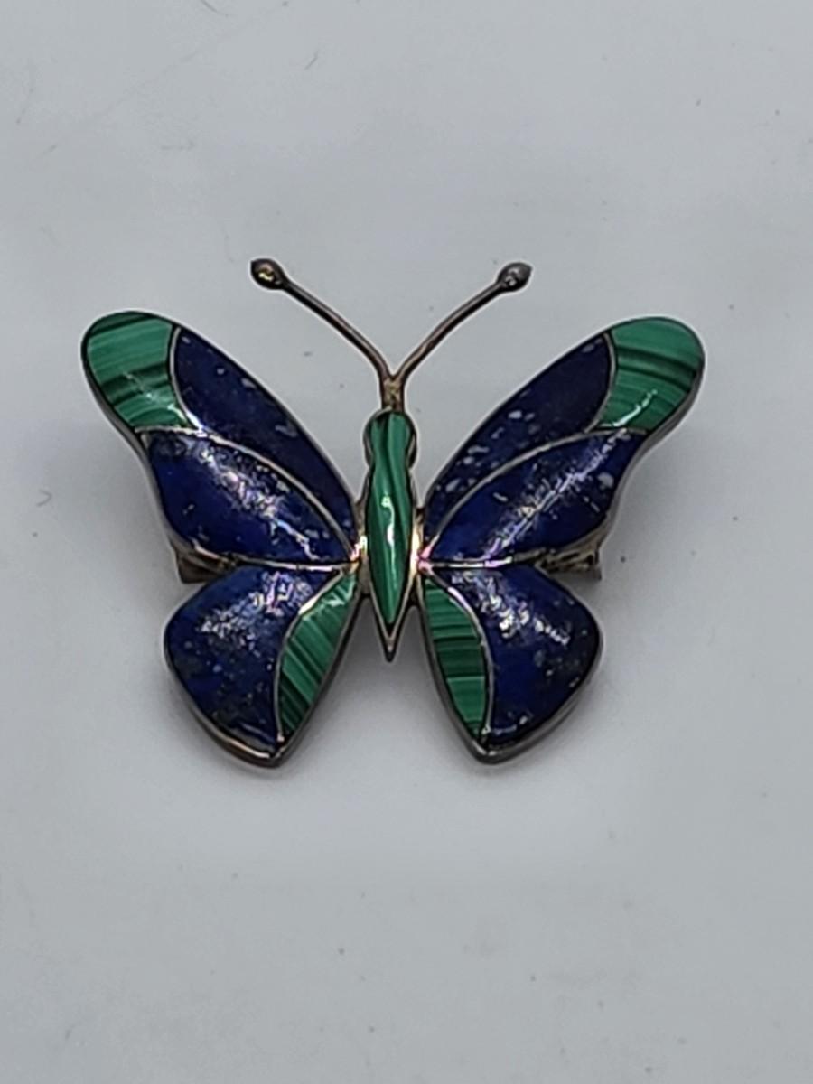 Lot 141: Fine Sterling Silver 950 Blue Lapis Lazuli and Malachite Butterfly Brooch with trombone clasp