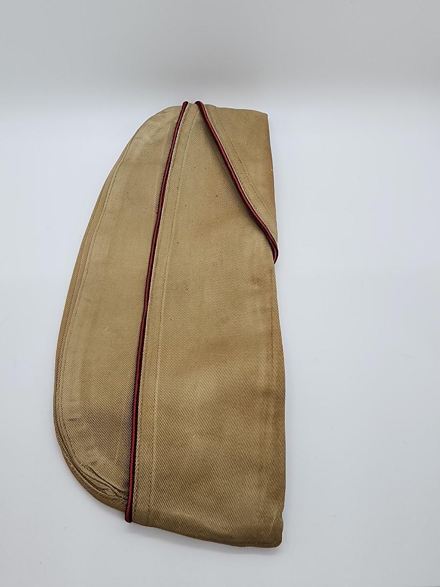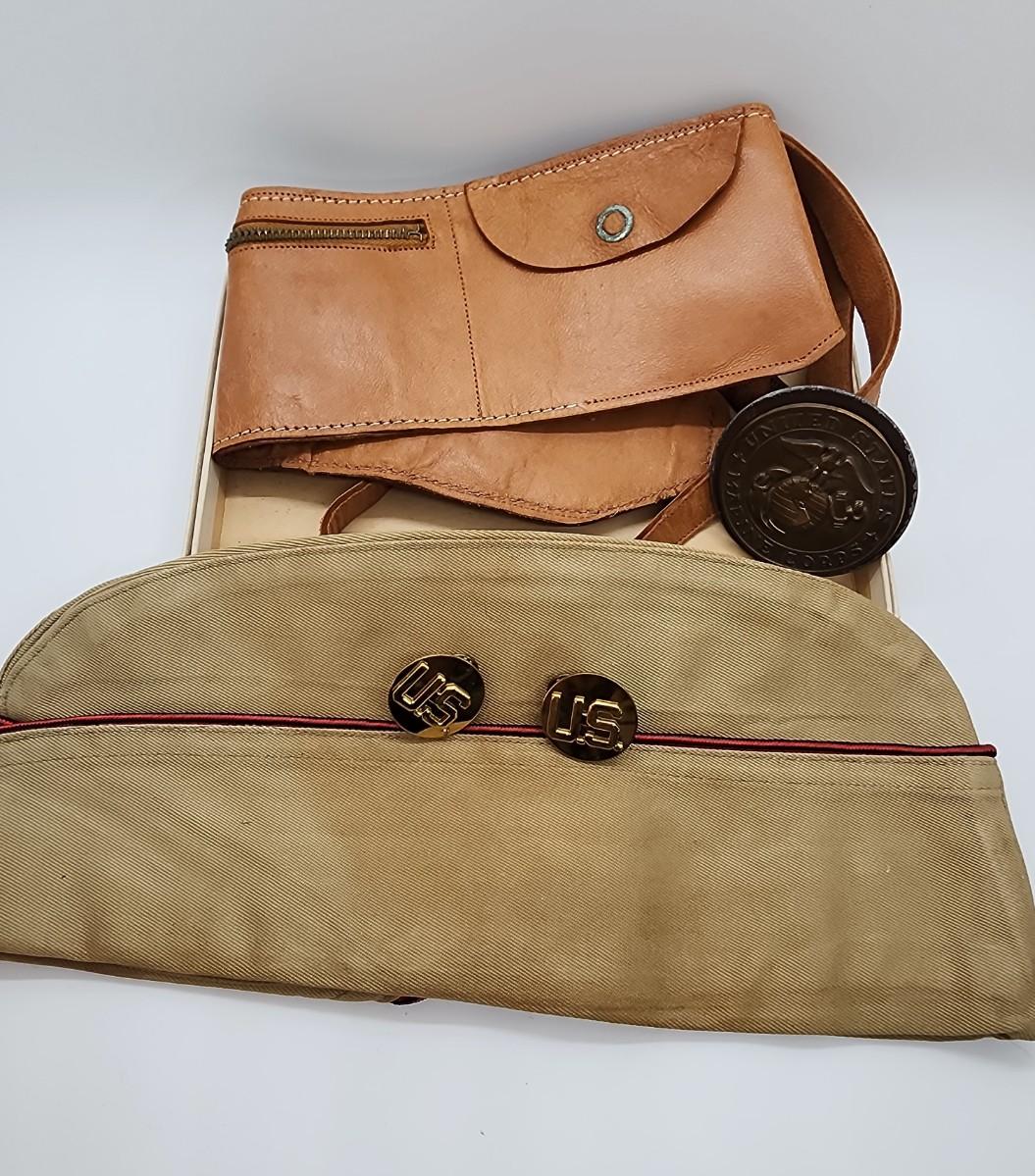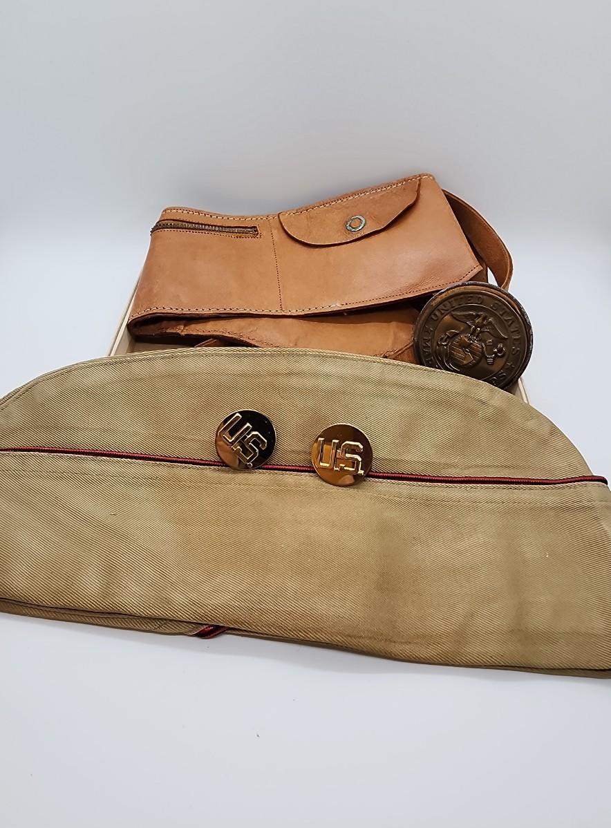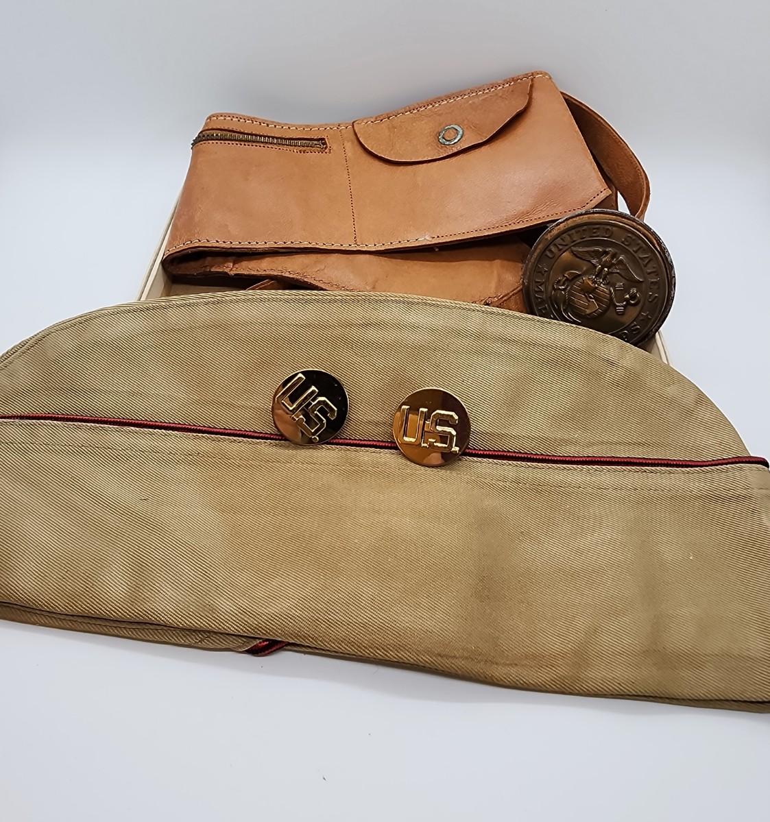 Lot 57: Military LOT Garrison Cap- Leather Money belt 44"L in original box- hubcap? and pair of US Brass Collar Pins
