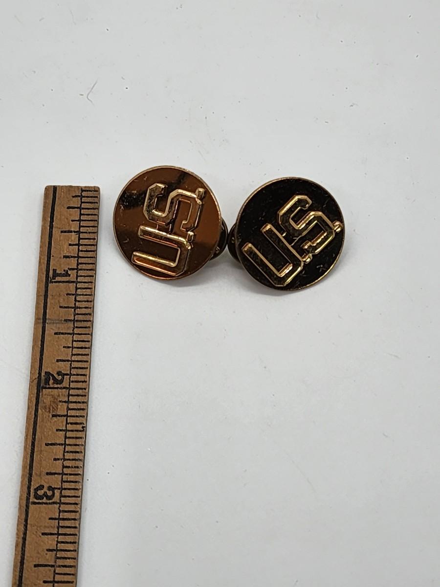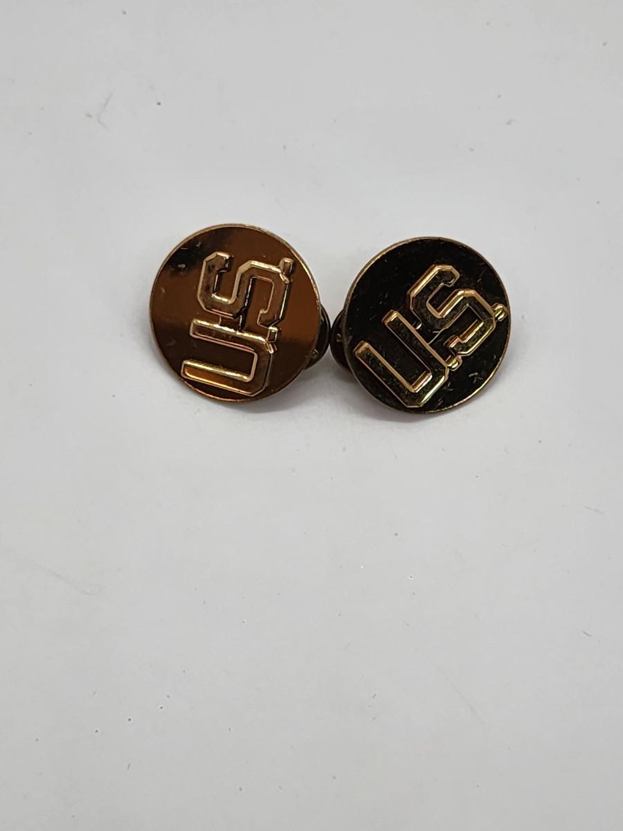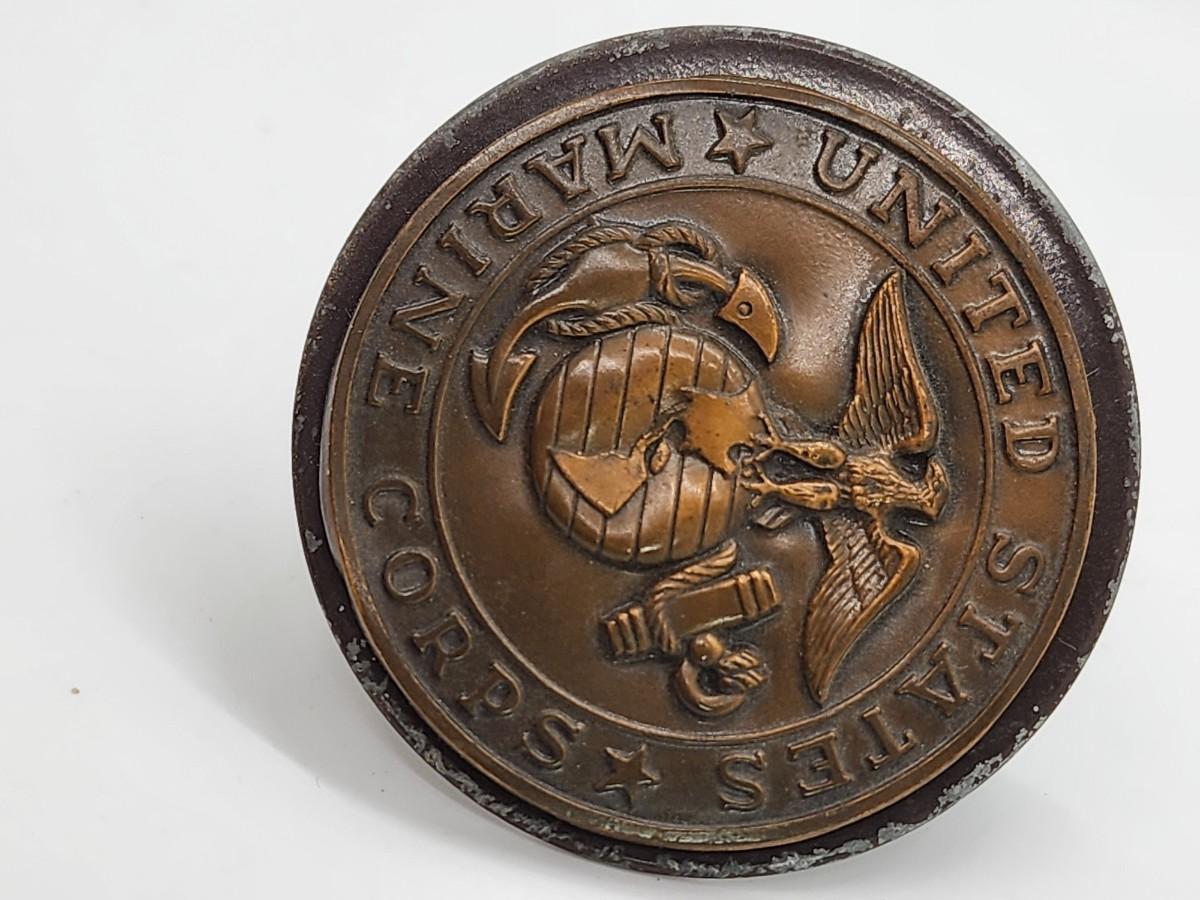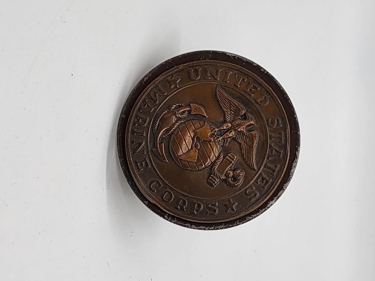 Lot 57: Military LOT Garrison Cap- Leather Money belt 44"L in original box- hubcap? and pair of US Brass Collar Pins