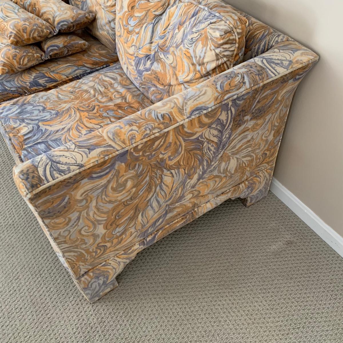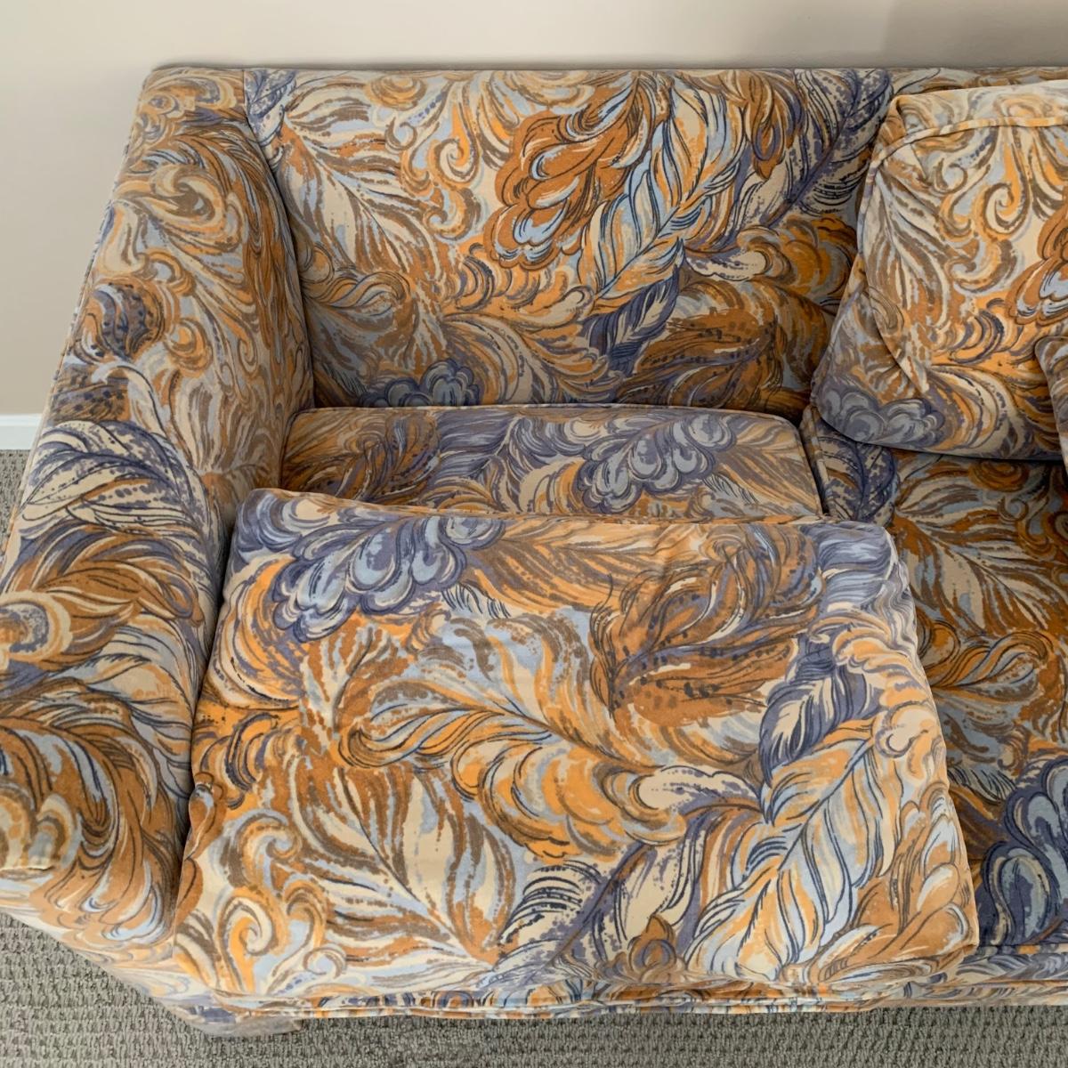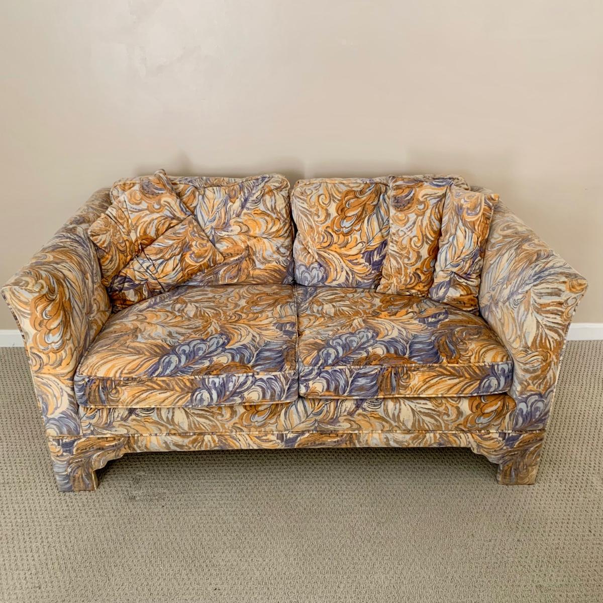 LOT 1 L: 2 Matching Orange & Blue 1970's Style Feather Print Velveteen Loveseats