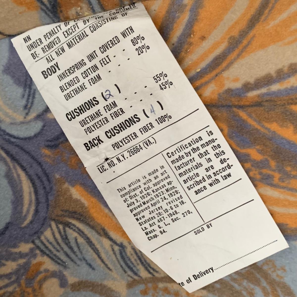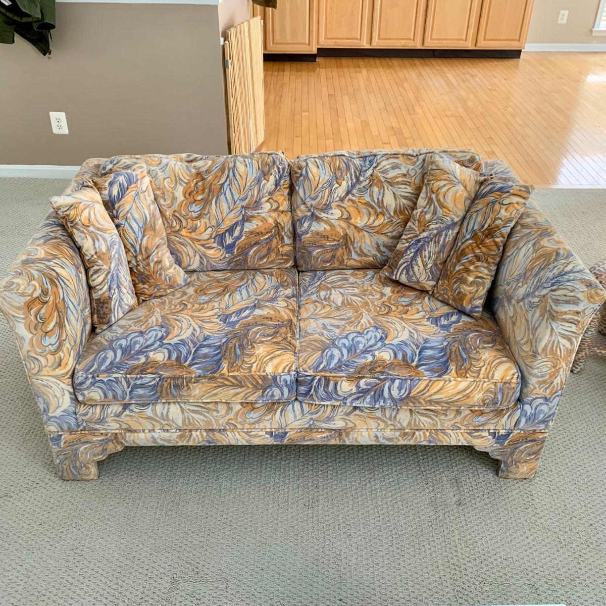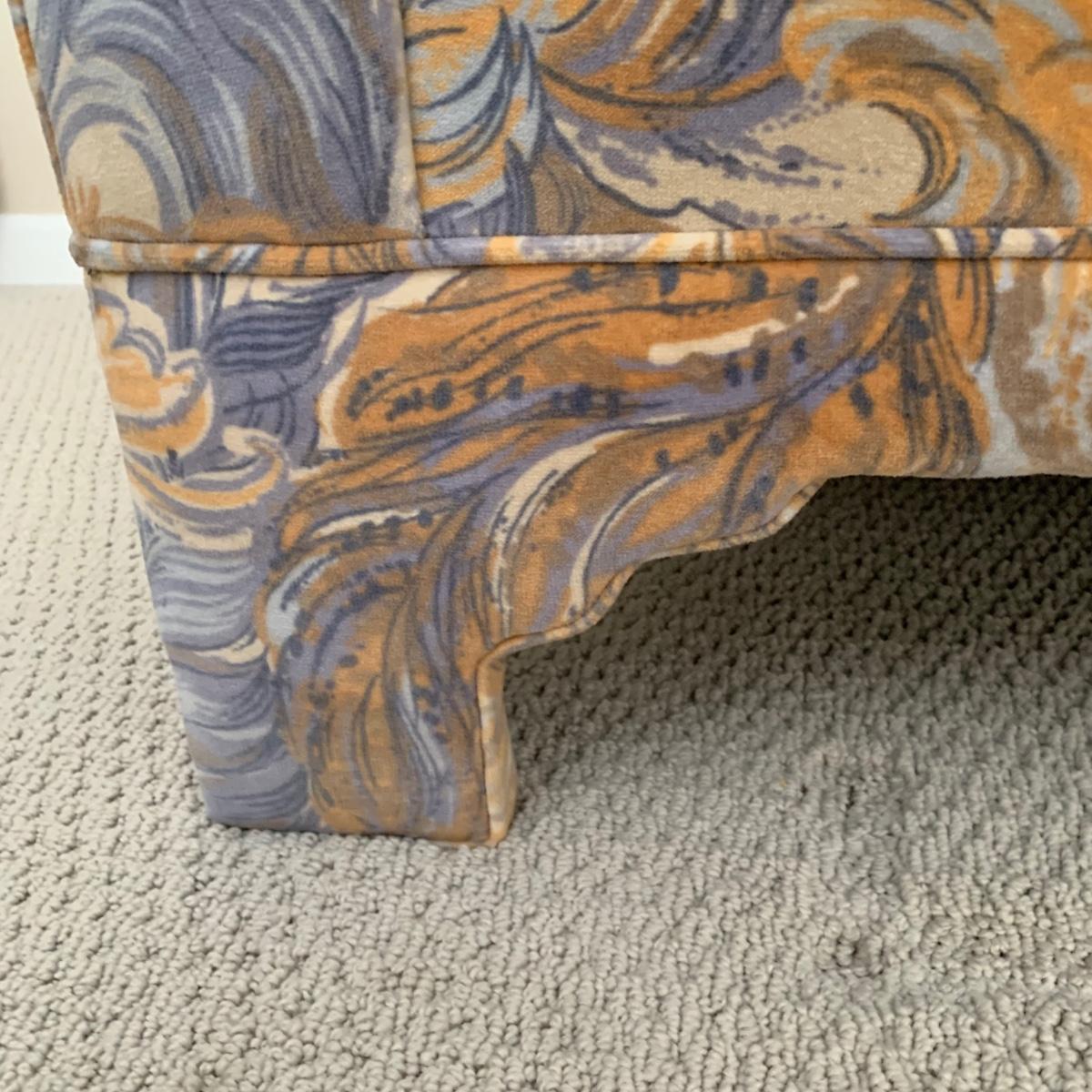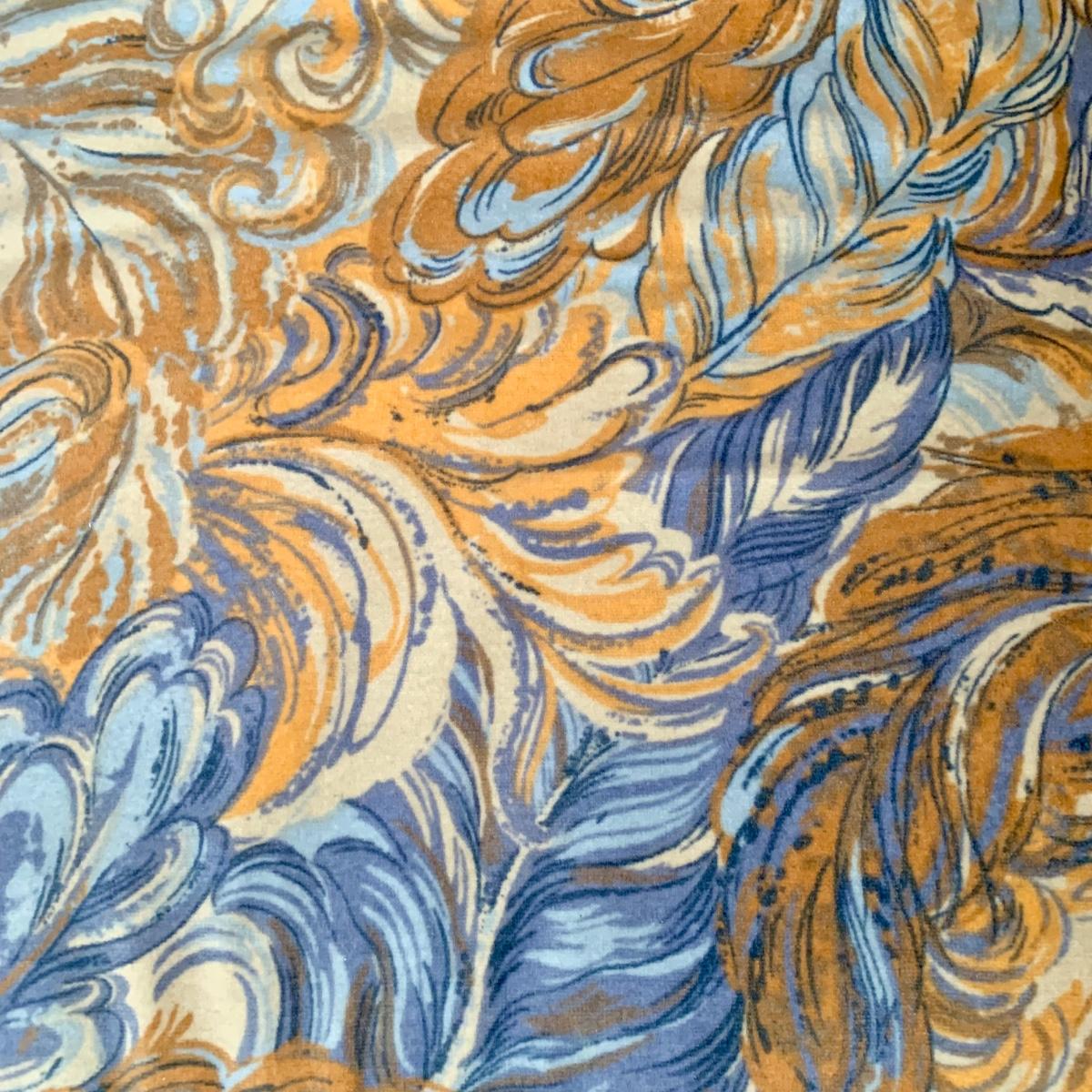 LOT 1 L: 2 Matching Orange & Blue 1970's Style Feather Print Velveteen Loveseats