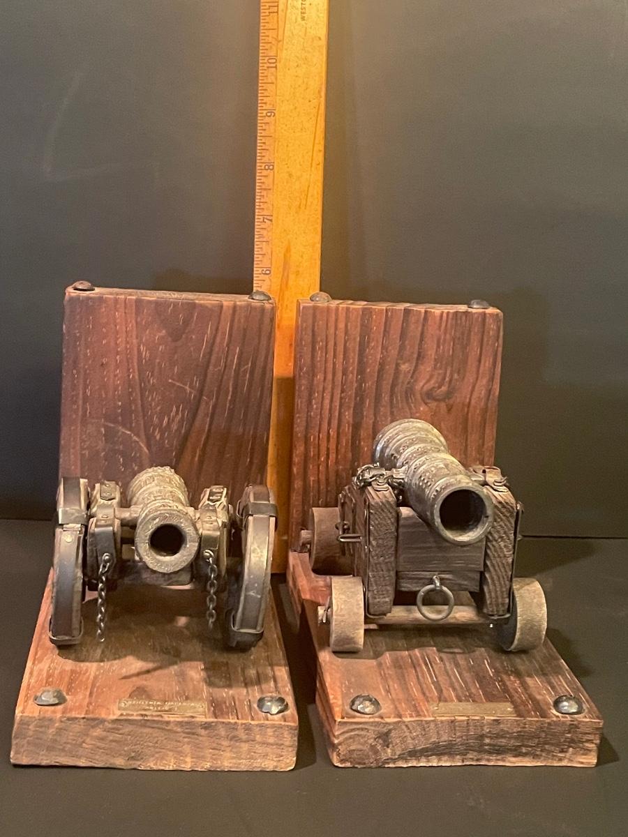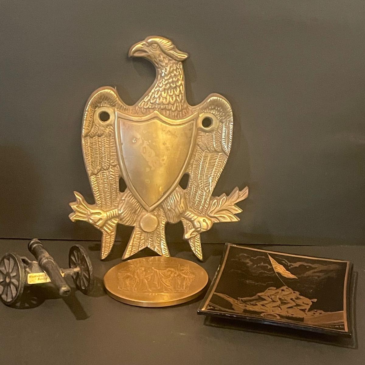 LOT; 1 Rustic Wooden Bookends with Cannon Repllcas, Brass Eagle Medallion, Stars and Stripes Drinking Glasses, Variety of Coffee Table Books and much more
