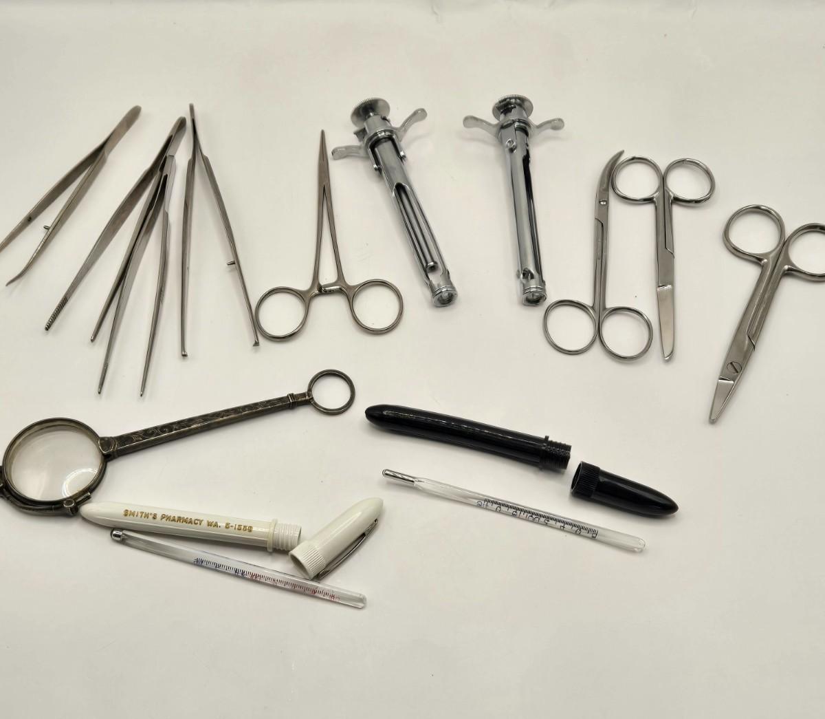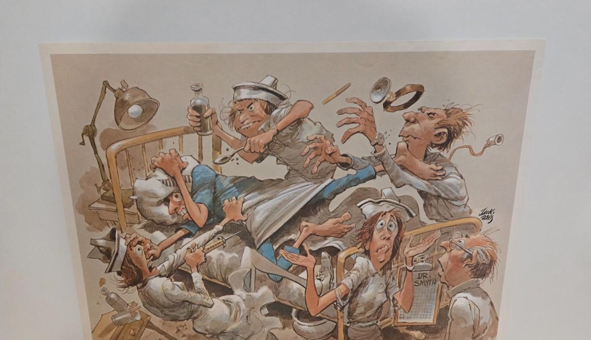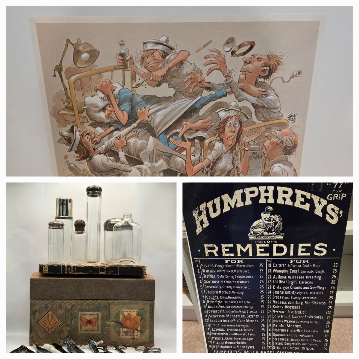 LOT 1: Caricature by Jack Davis of a Chaotic Hospital Scene, Vintage Humphreys' Remedies Sign, The Philadelphia Medical & Physical Journal, and Vintage Doctor Glass Containers & Tools
