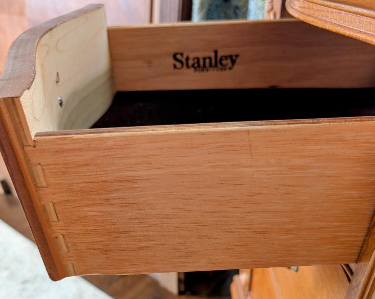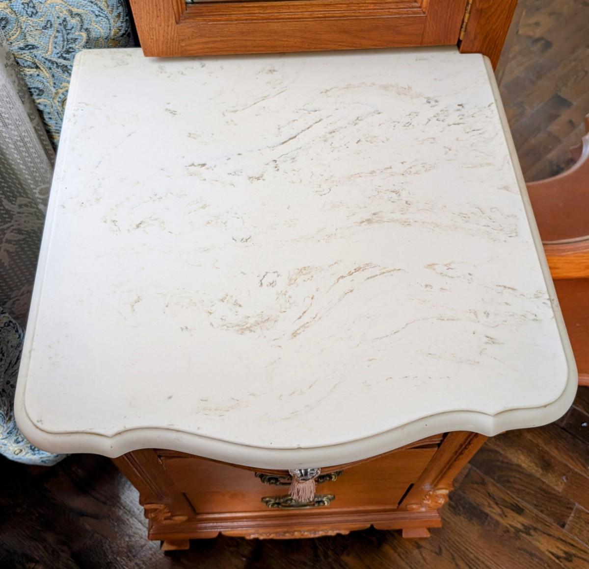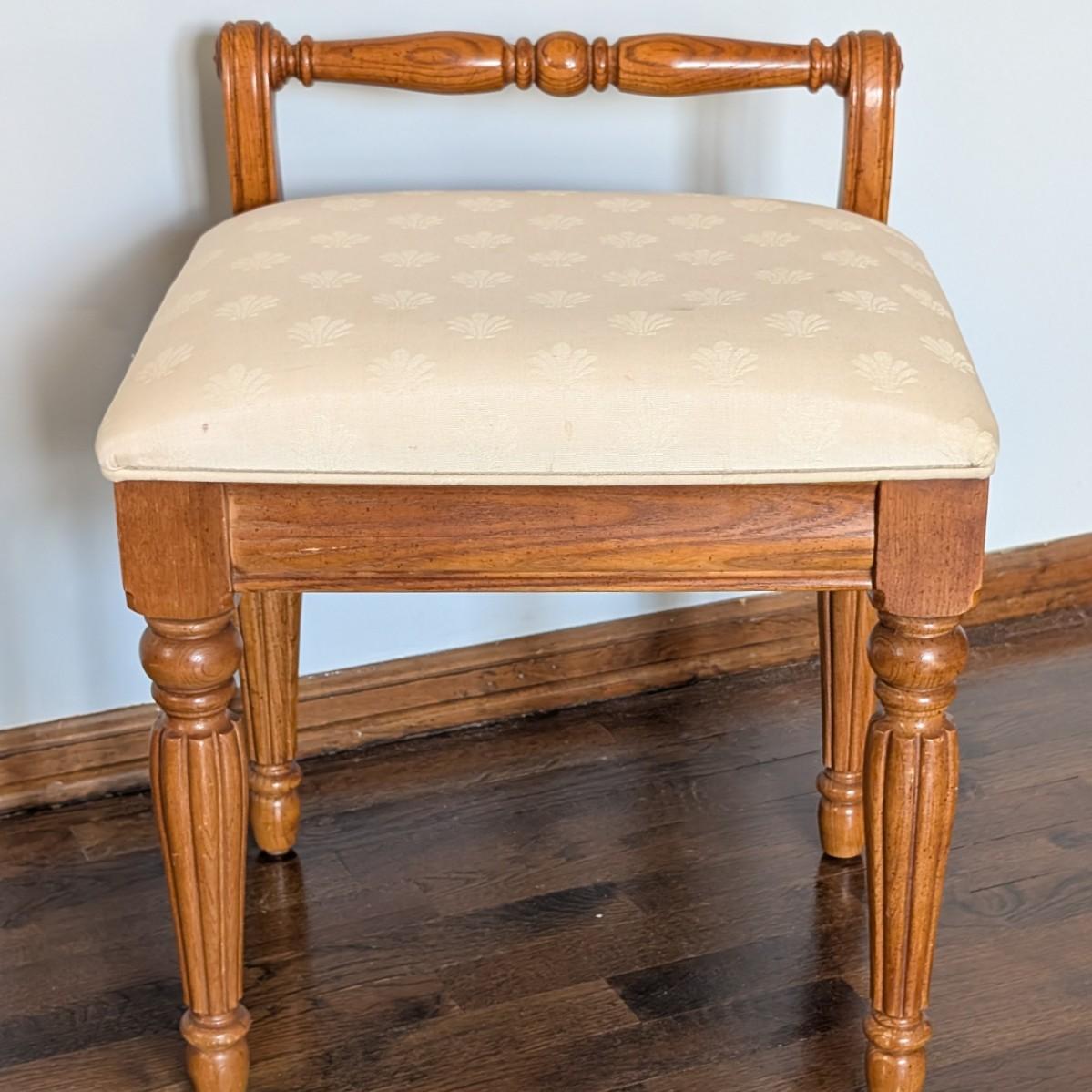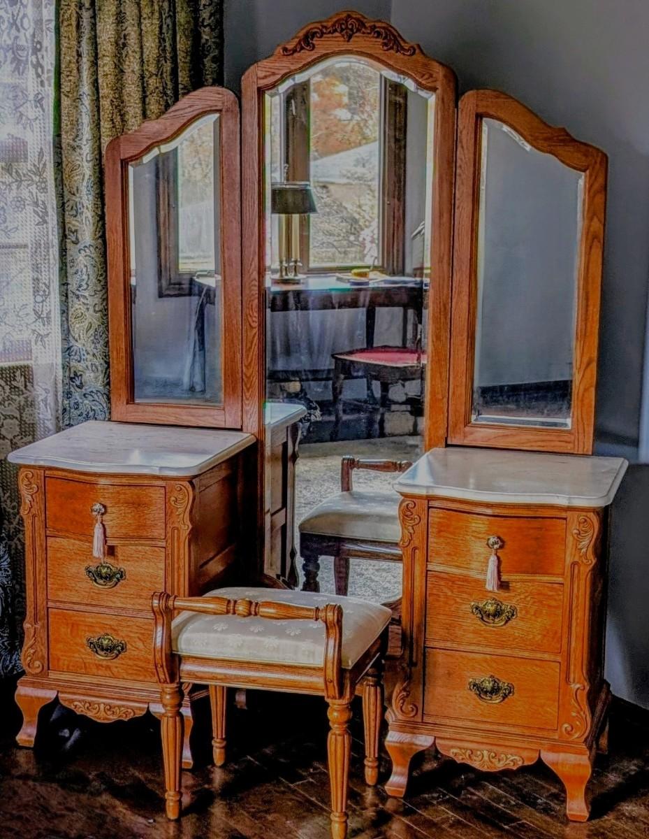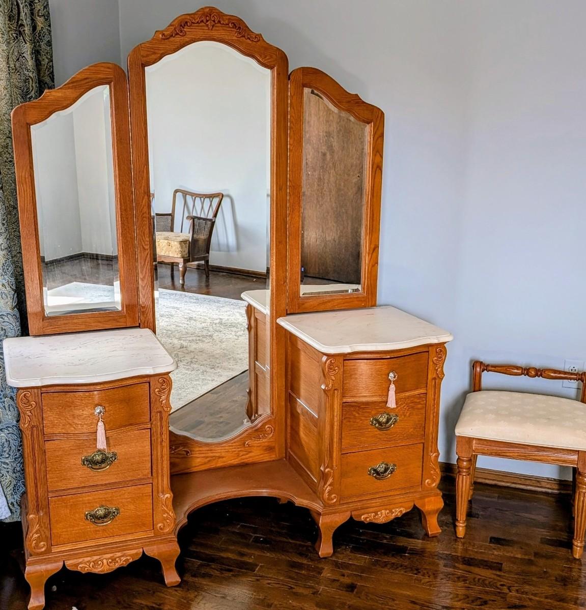 LOT 1Y: 1980s Stanley Furniture Edwardian Style Marble Top Vanity w/ Tri-Fold Mirror & Bench