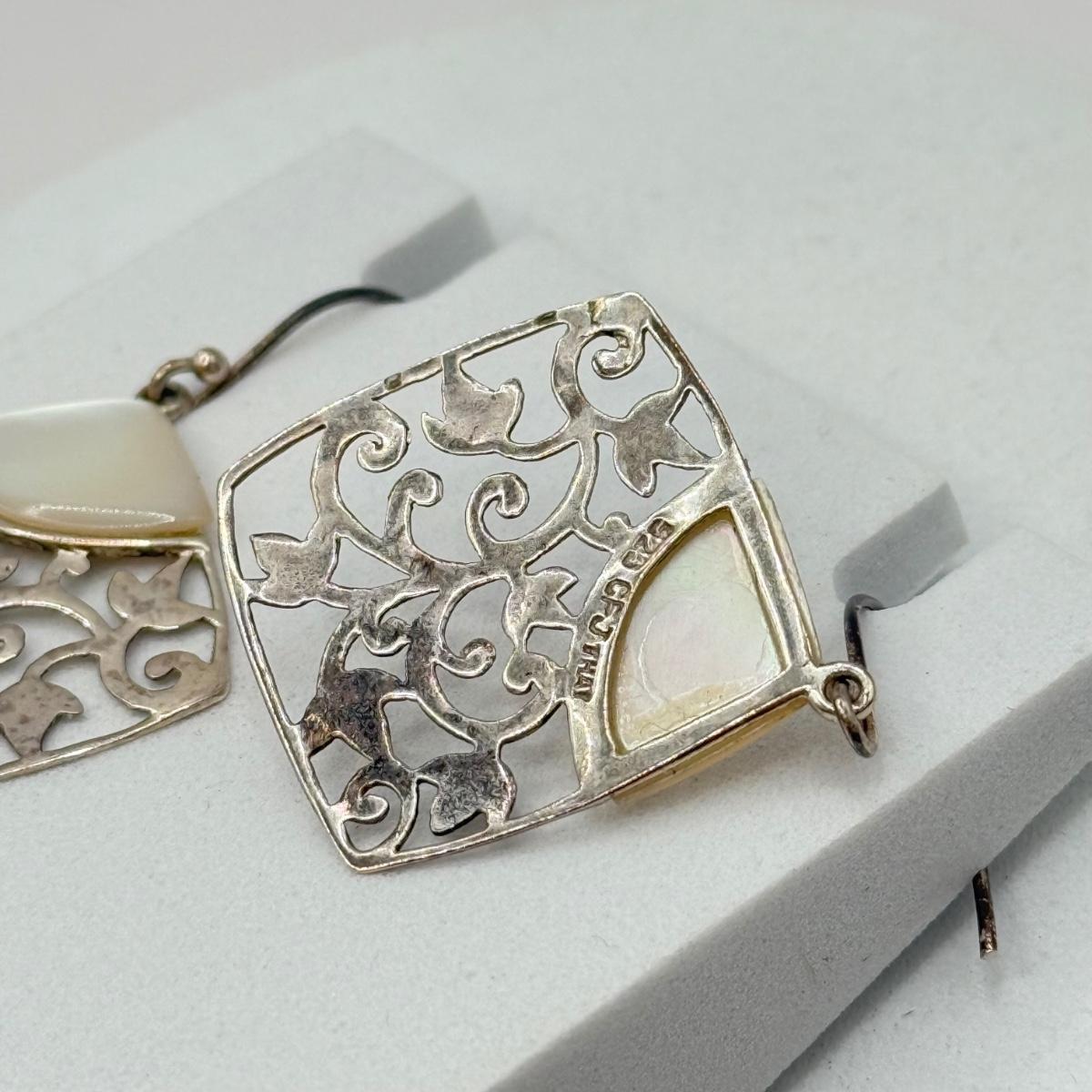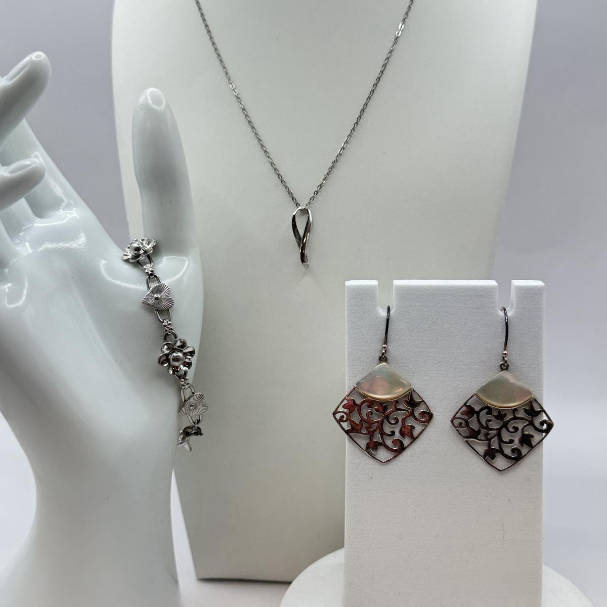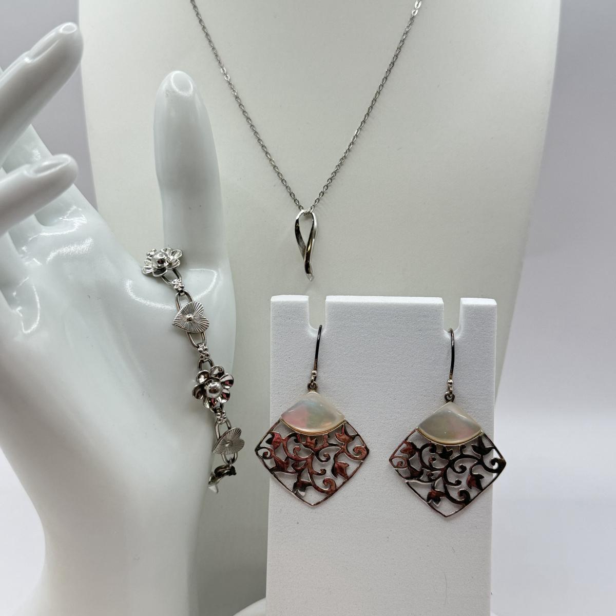 LOT 1J: Sterling Silver (925) Collection 15" Necklace w/Pendant, Mother of Pearl Earrings, Heart & Flower Bracelet