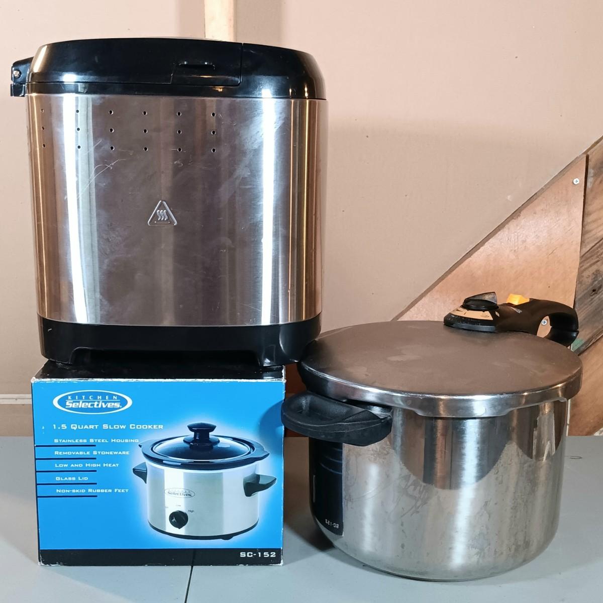 LOT 1: KitchenSelectives 1.5qt Slow Cooker, Hamilton Beach Artisan Bread Maker & Fagor Duo Pressure Cooker
