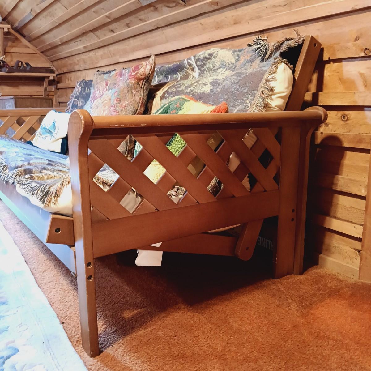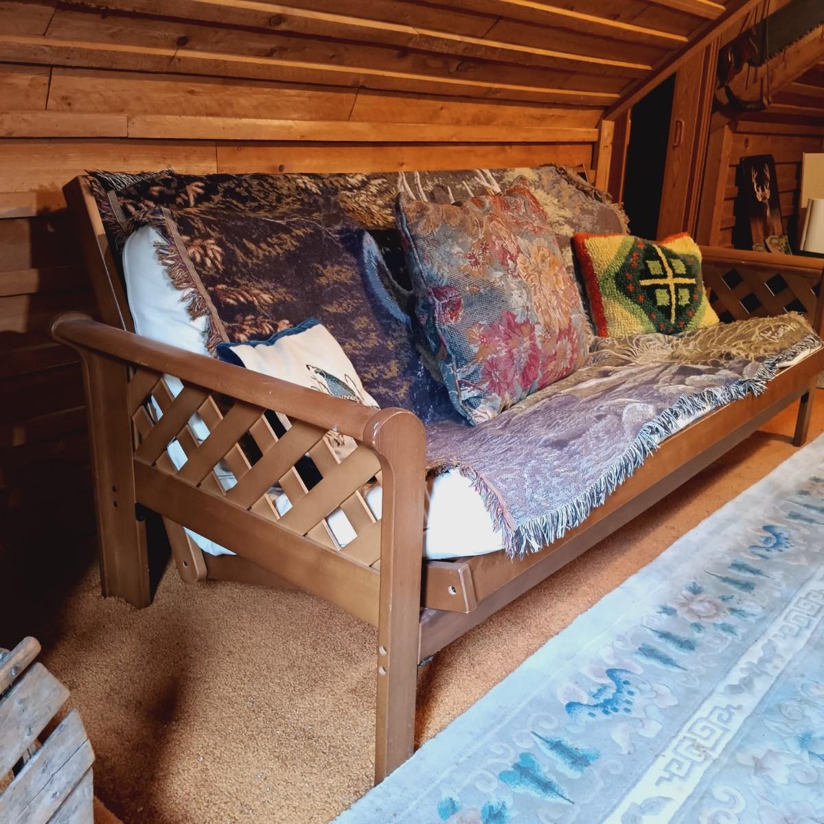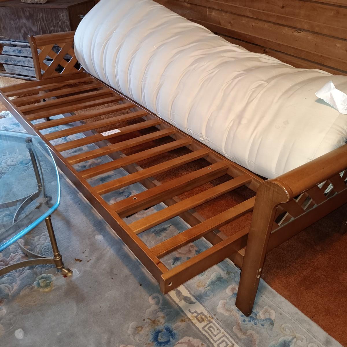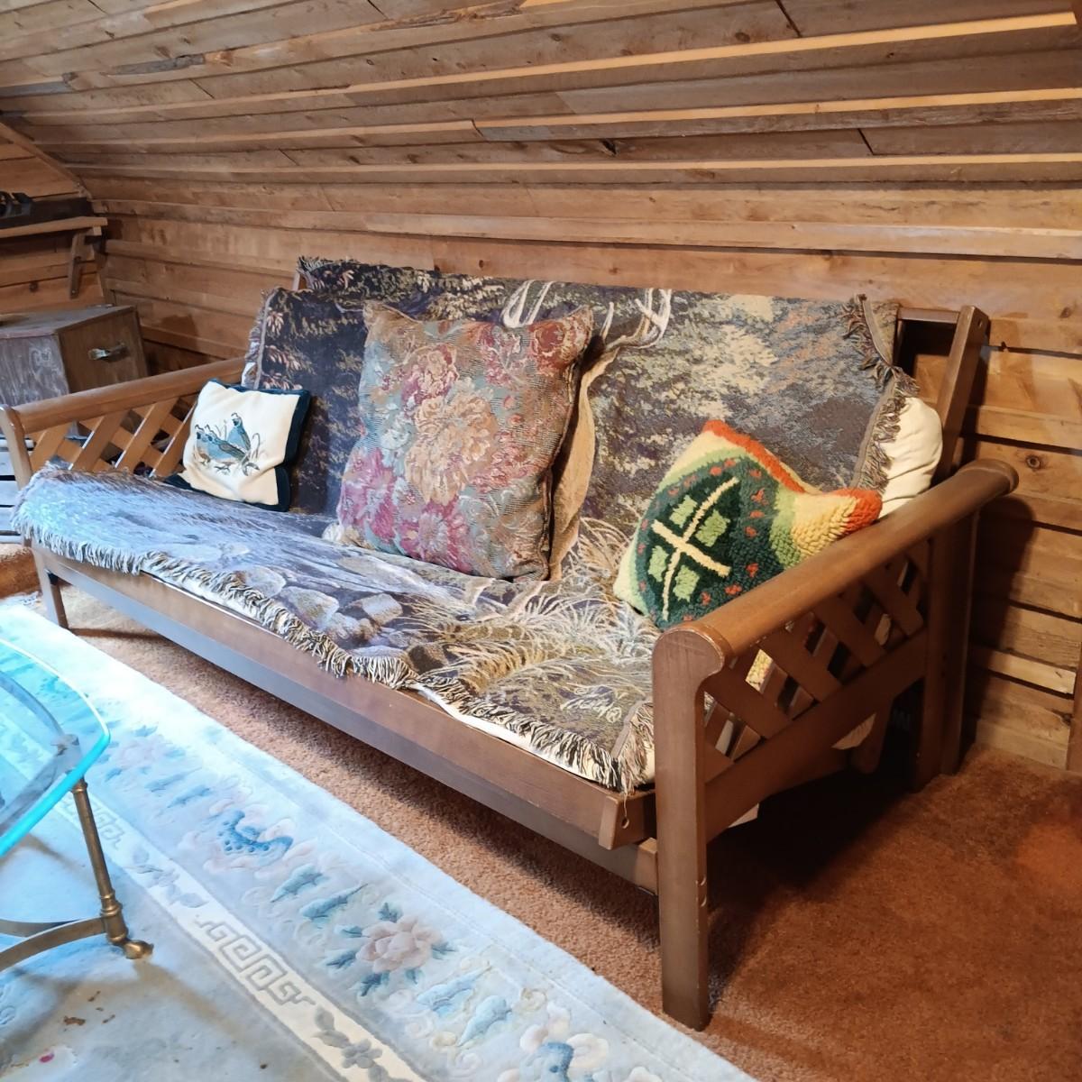 LOT 1: Wooden Futon with Lattice Arms and Outdoor Inspired Covering and Pillows
