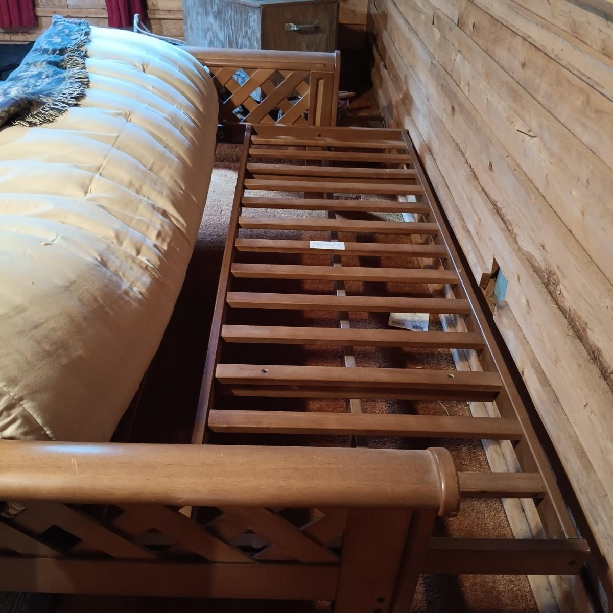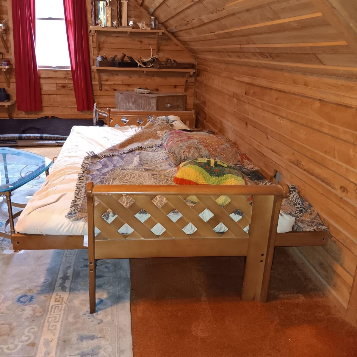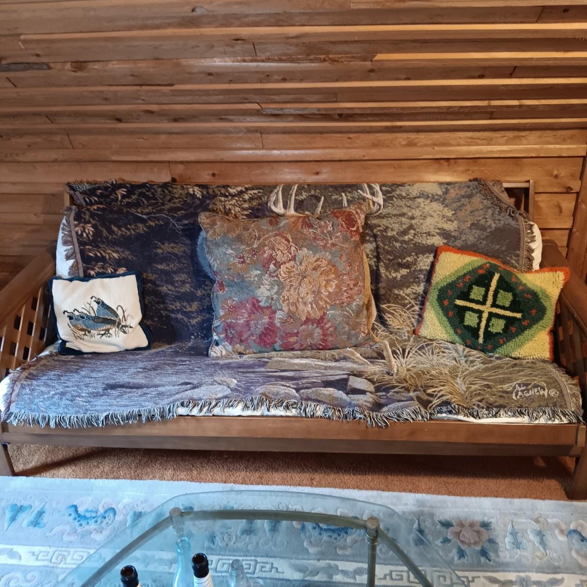 LOT 1: Wooden Futon with Lattice Arms and Outdoor Inspired Covering and Pillows