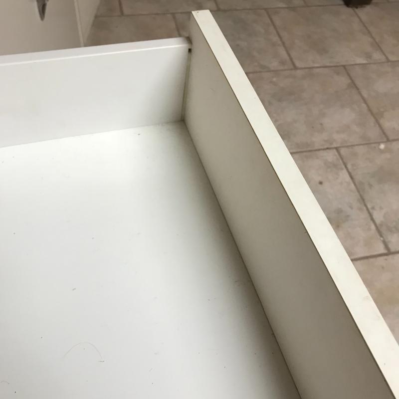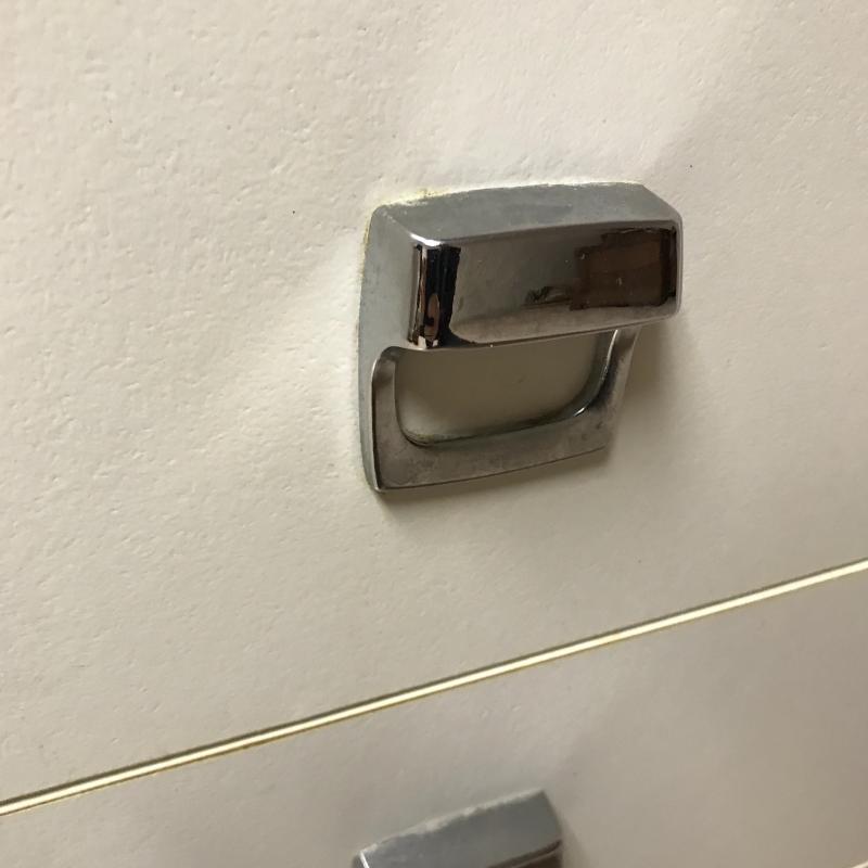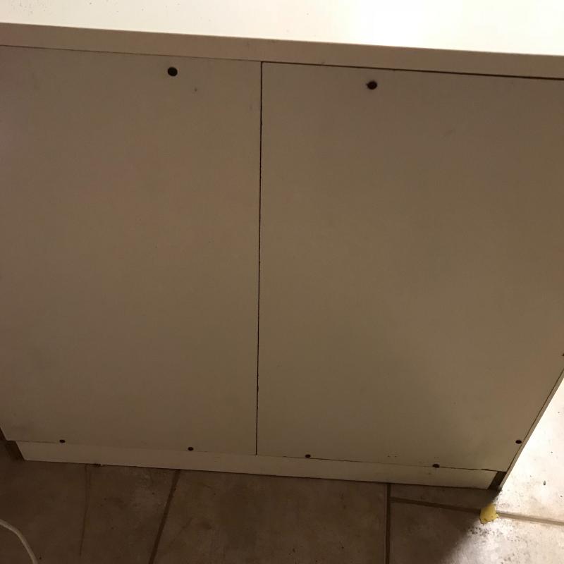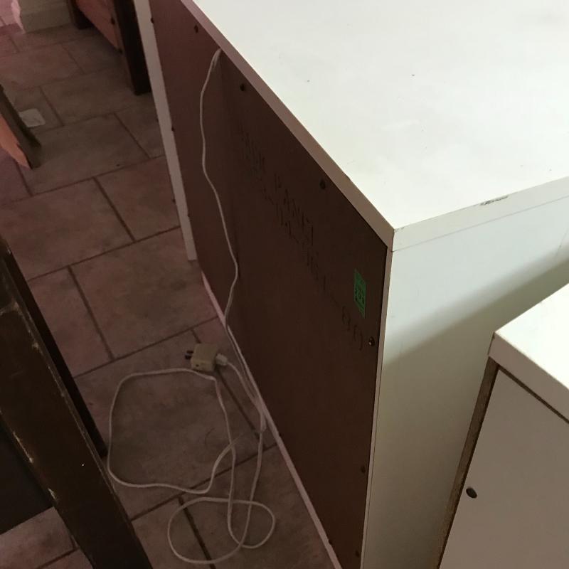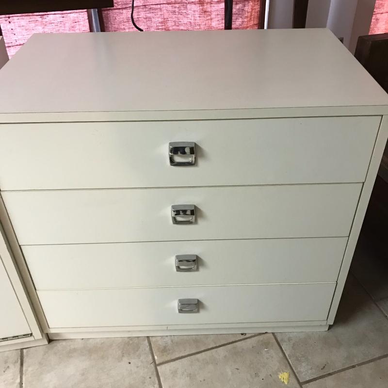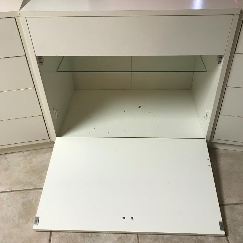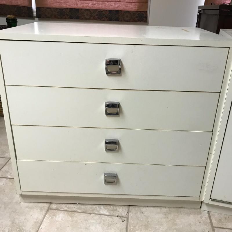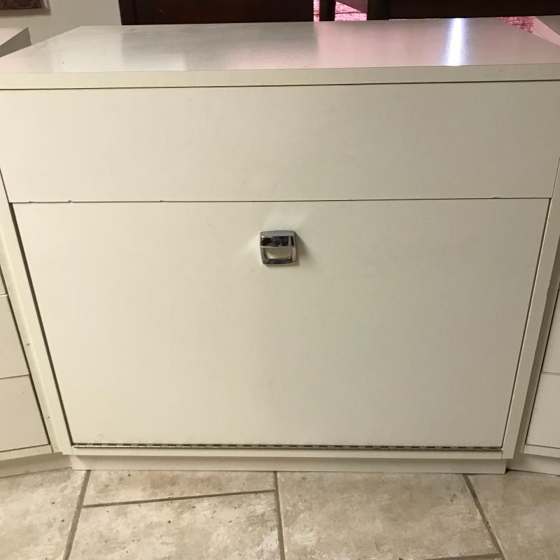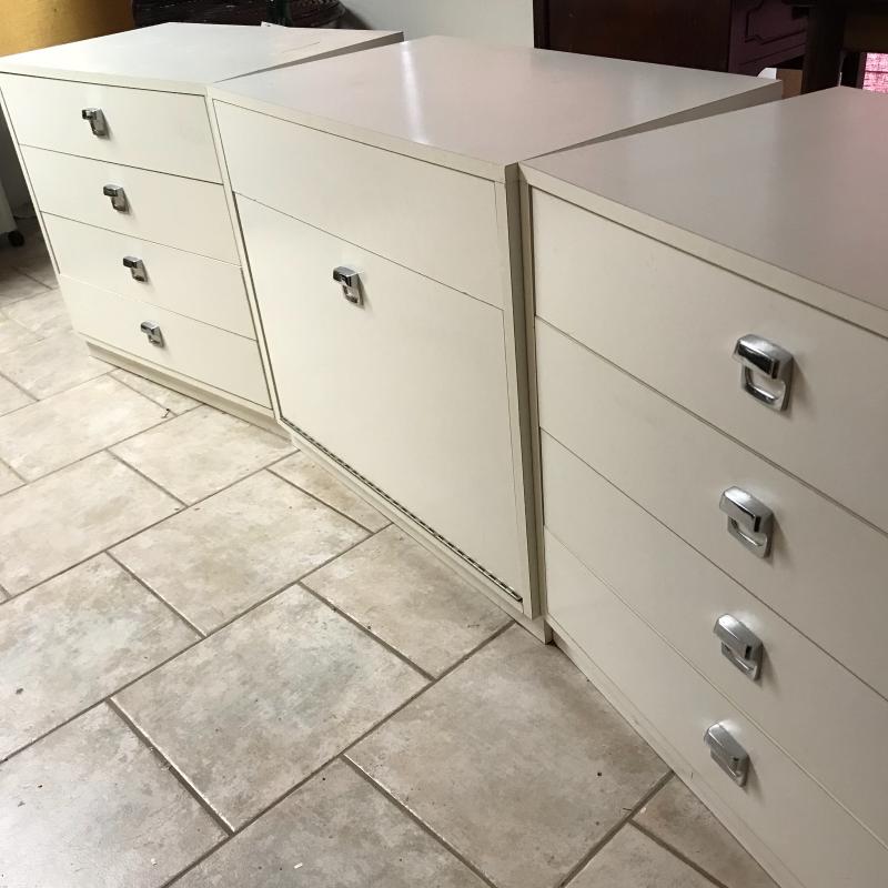 Lot includes three cabinets perfect for a craft room or art studio. Two are matching with four drawers that open easily, and one opens to reveal a glass shelf and built-in light. Laminate finish for easy cleaning. 30” x 18” x 27” h. See pics. Loca pickup only.