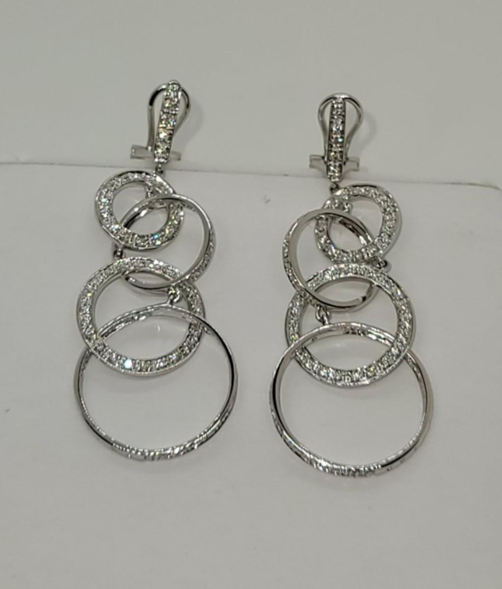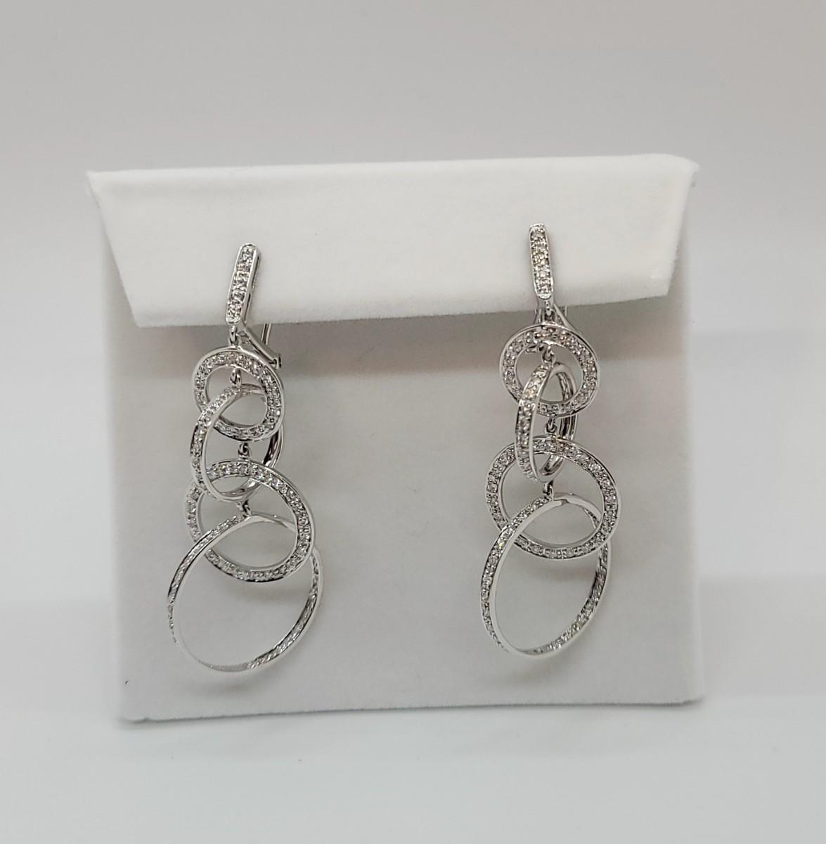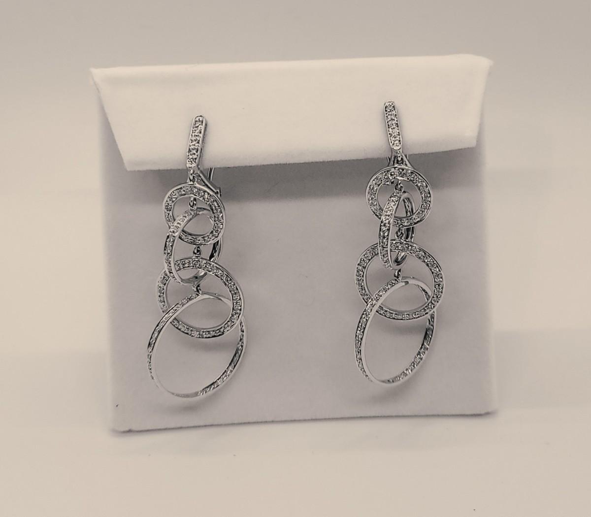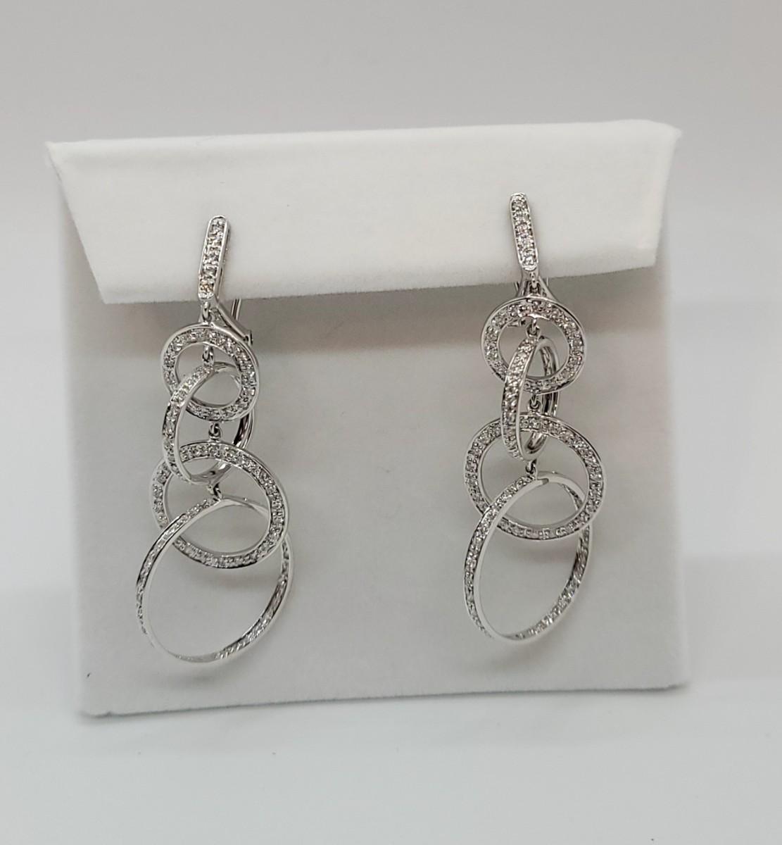 These elegant pierced earrings feature four linked circles accented with pave-set diamonds. Sparkle with every movement of these swingy interlocking circle drop earrings, gorgeously adorned with round-cut diamonds. 14K white gold alternating circles facing front and sideways hang down, all decorated with diamonds!