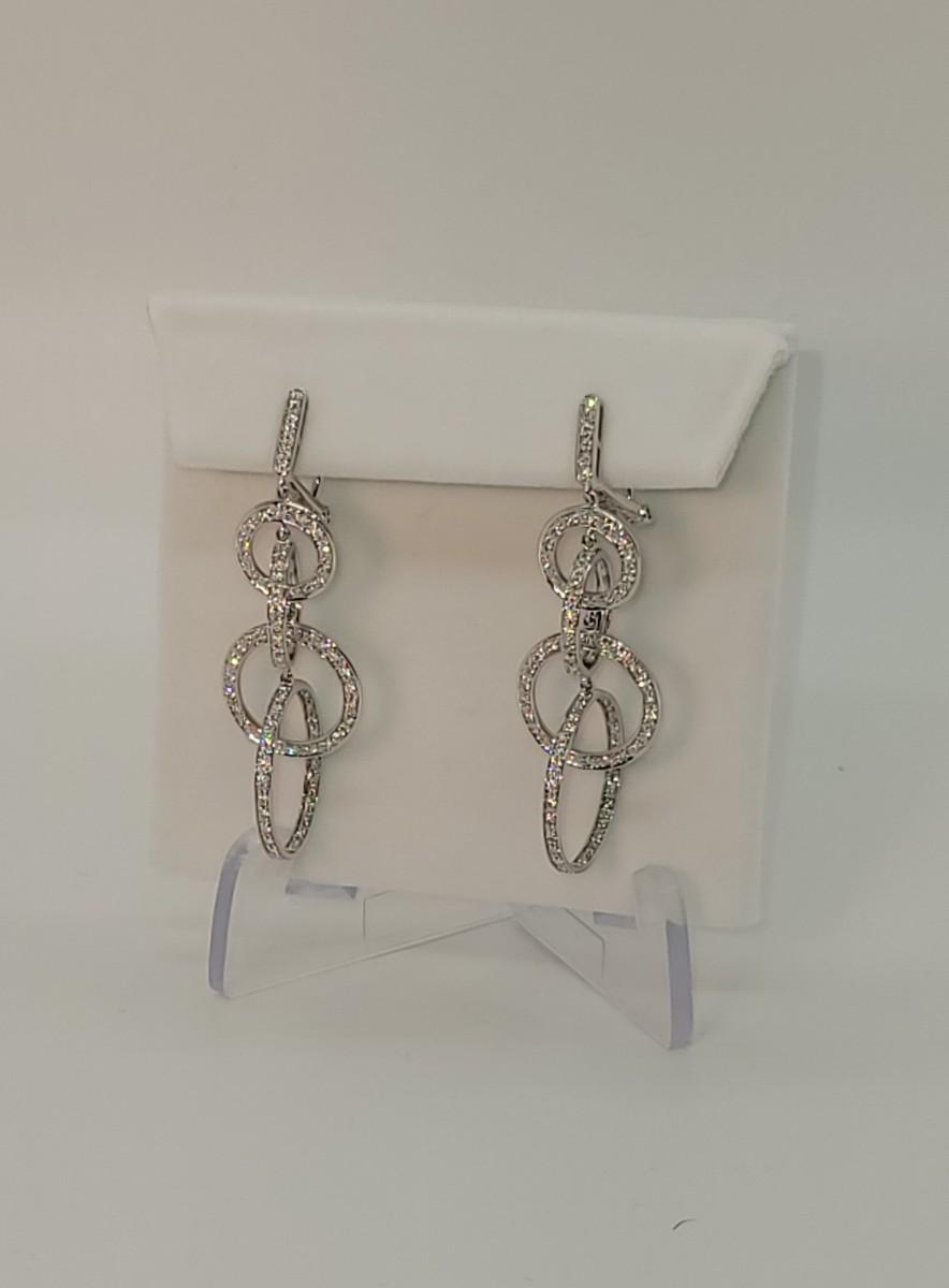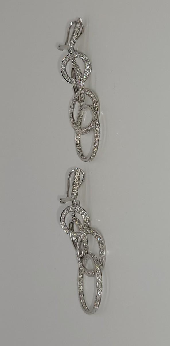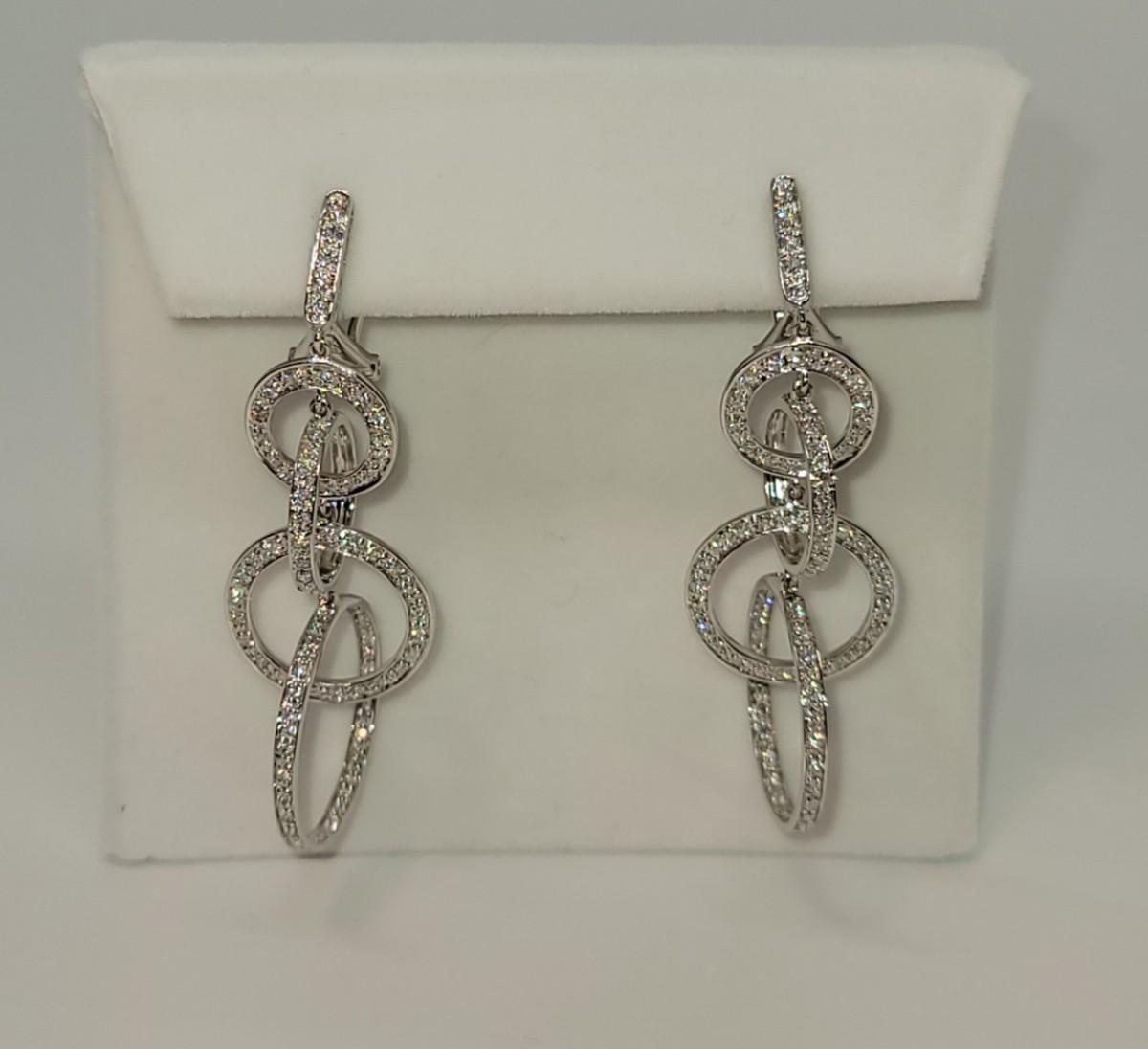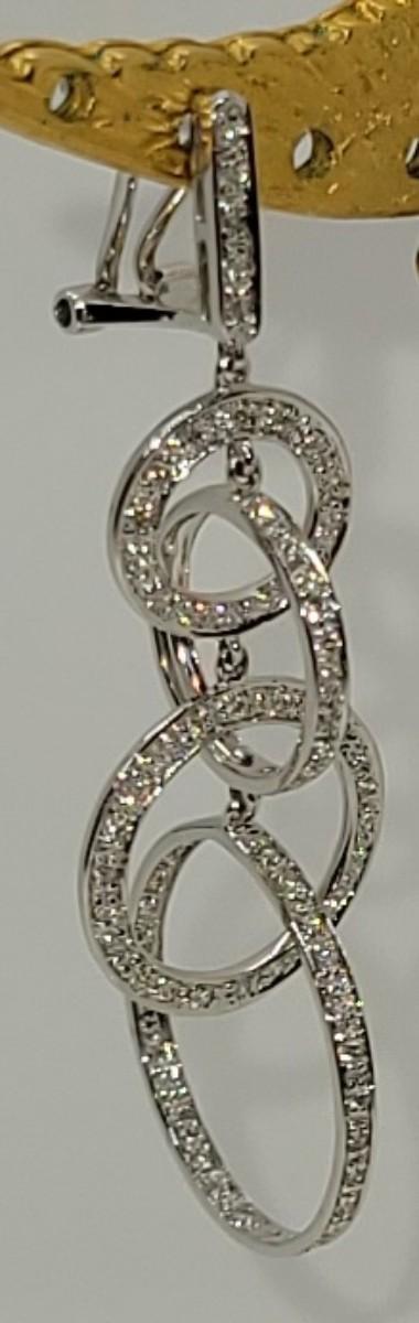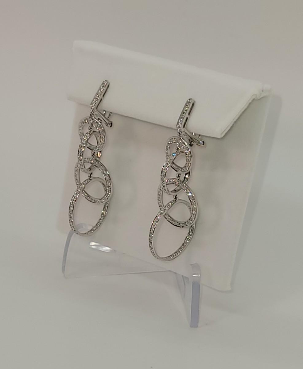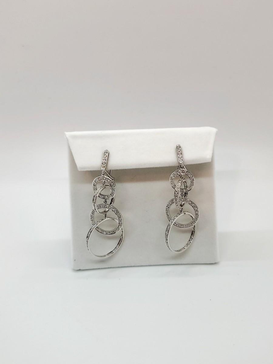 These elegant pierced earrings feature four linked circles accented with pave-set diamonds. Sparkle with every movement of these swingy interlocking circle drop earrings, gorgeously adorned with round-cut diamonds. 14K white gold alternating circles facing front and sideways hang down, all decorated with diamonds!
