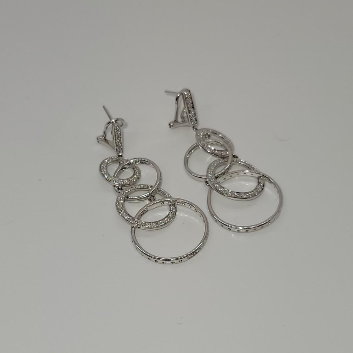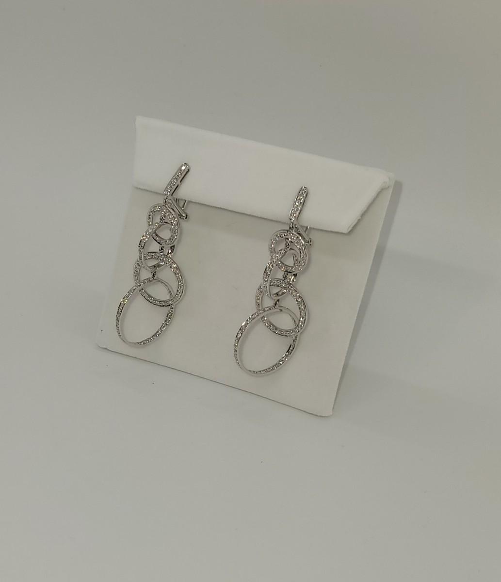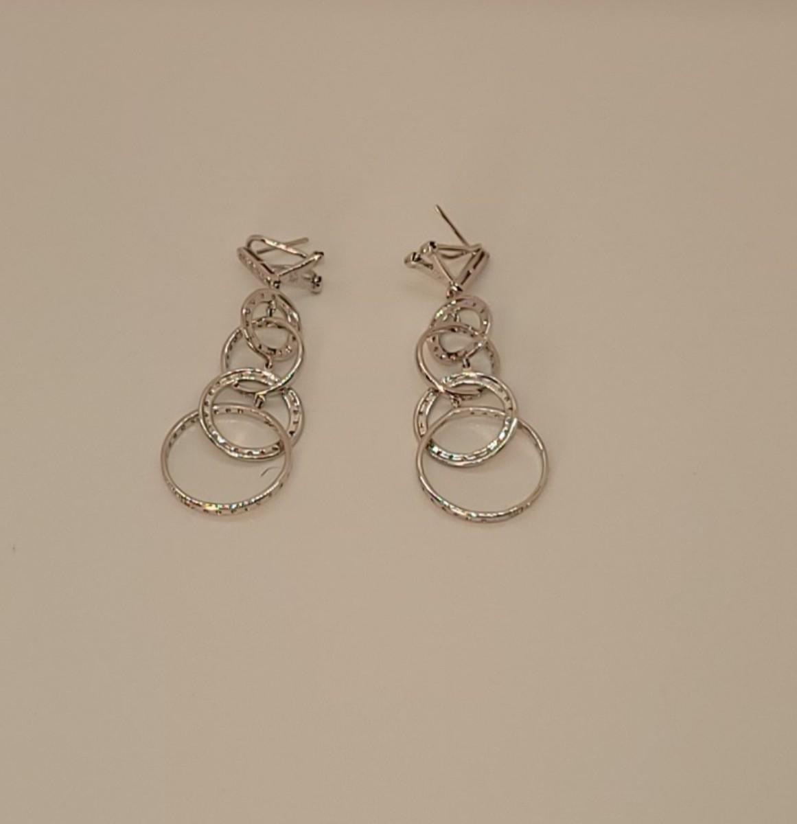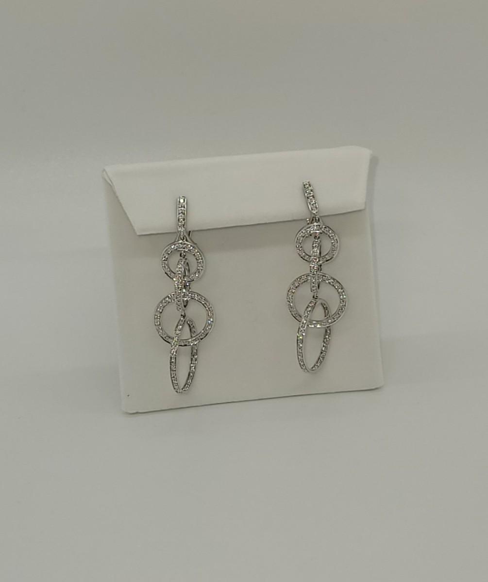 These elegant pierced earrings feature four linked circles accented with pave-set diamonds. Sparkle with every movement of these swingy interlocking circle drop earrings, gorgeously adorned with round-cut diamonds. 14K white gold alternating circles facing front and sideways hang down, all decorated with diamonds!