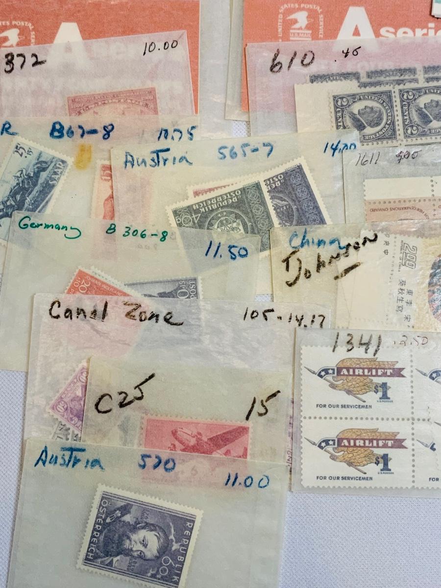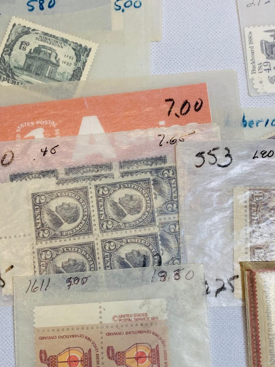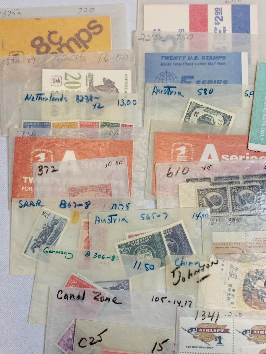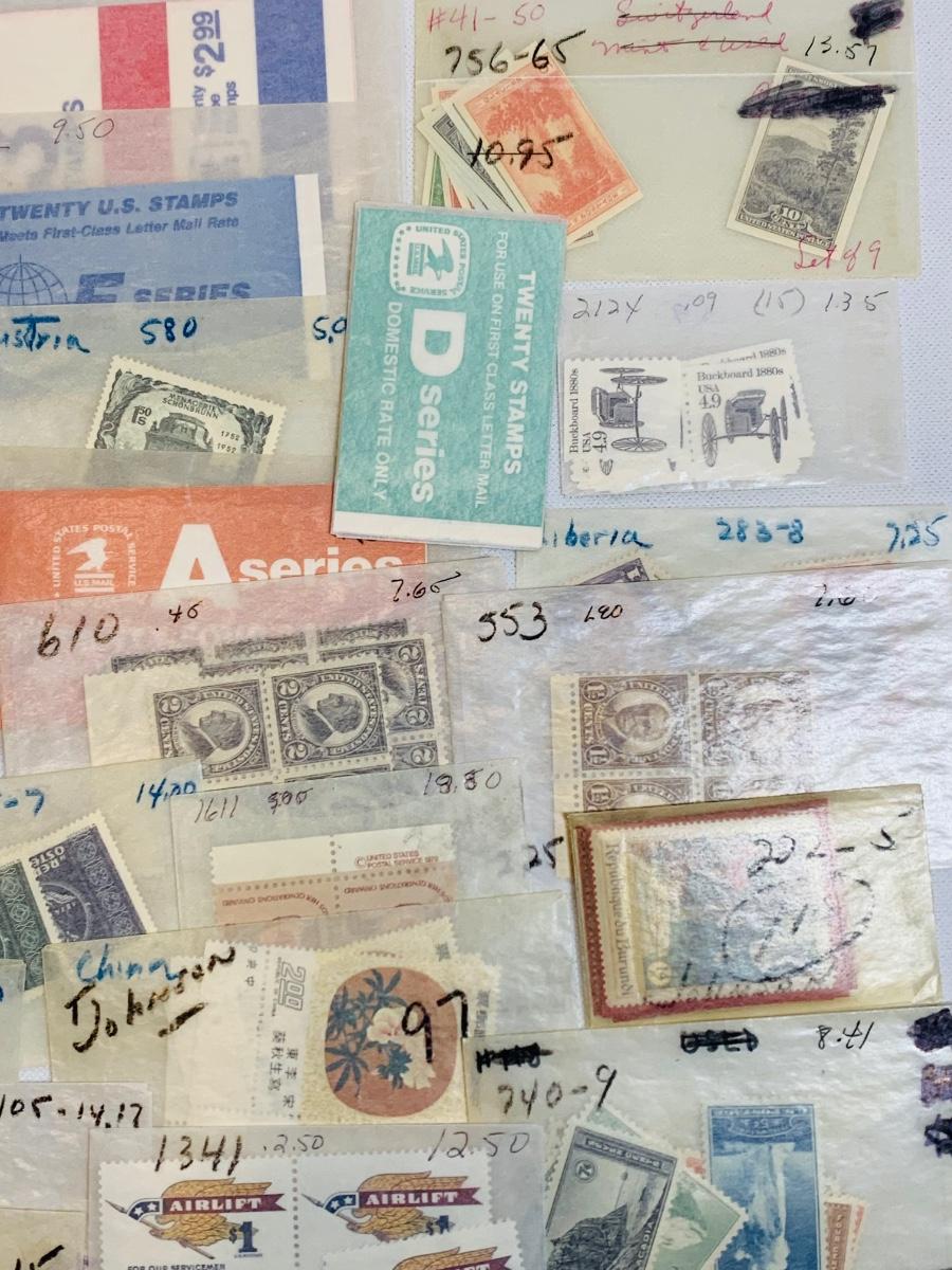 Mixed collection of vintage & newer stamps with an estimated dollar value noted on each package. These are unused, unhinged stamps This an estimated value & was not researched, there is no way of knowing the true value of the stamps without researching.