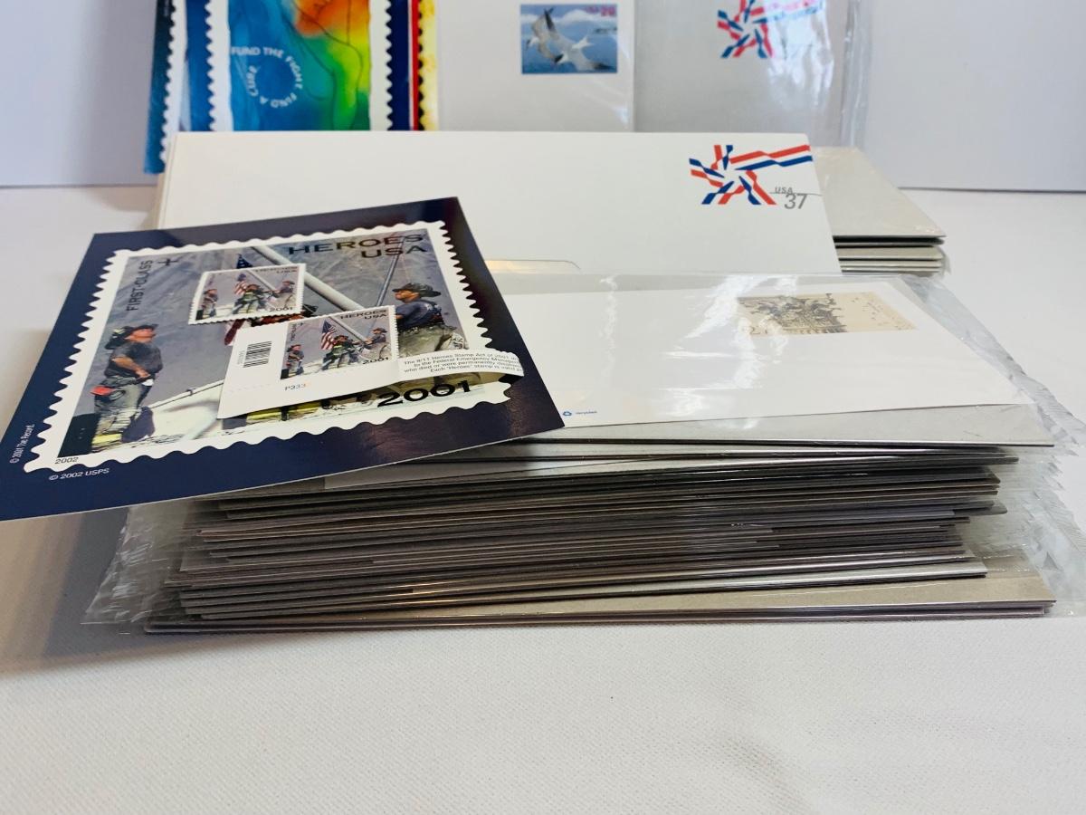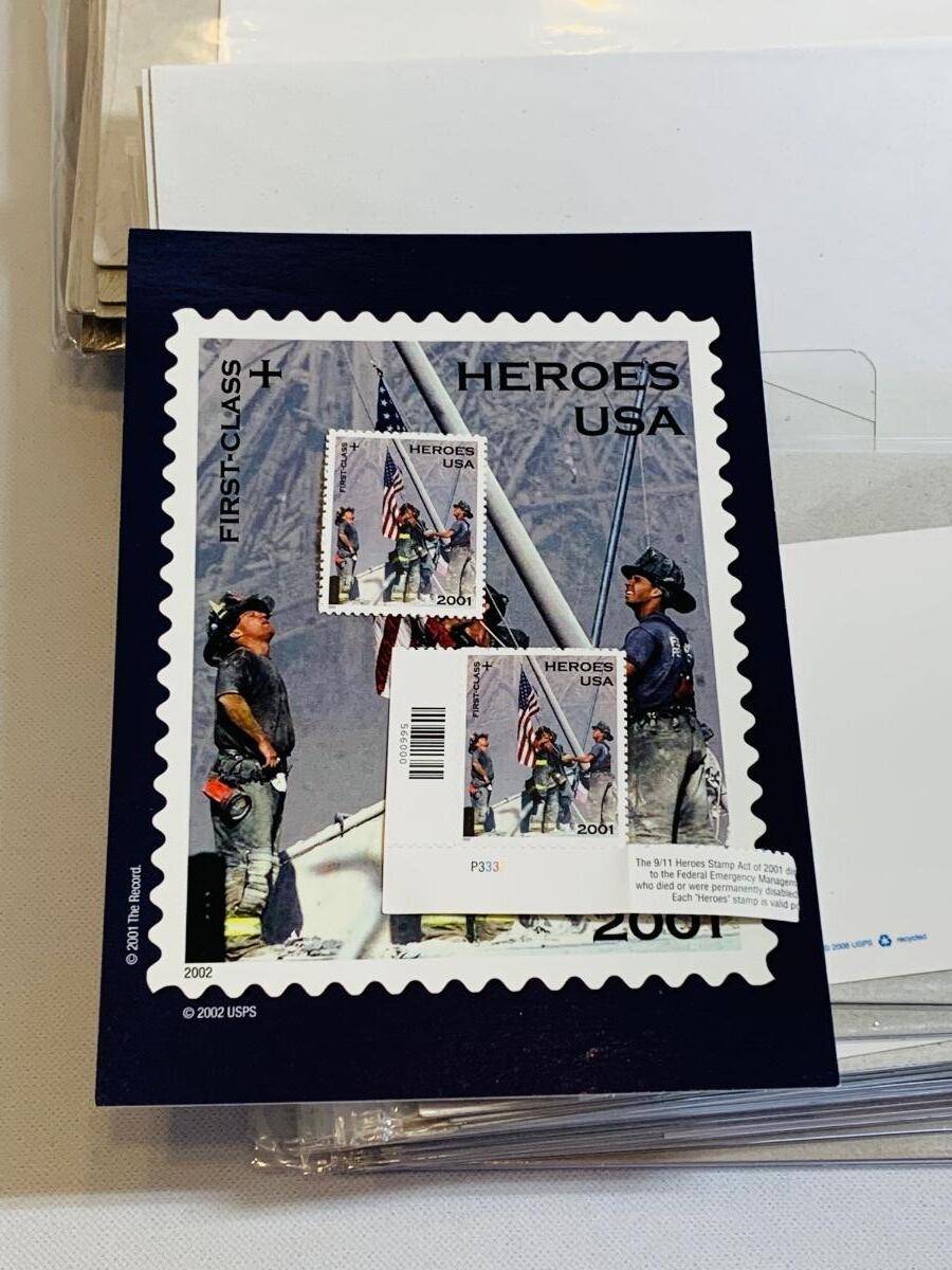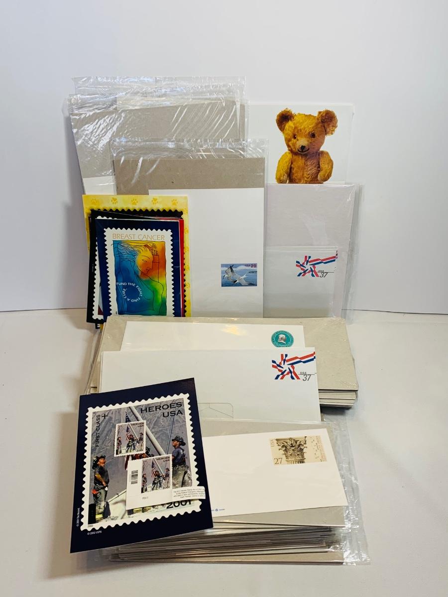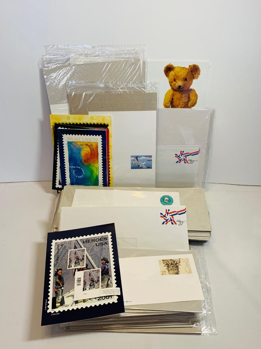 Large collection of pre paid envelopes & postcards including Hero's USA postcard and & stamp.
