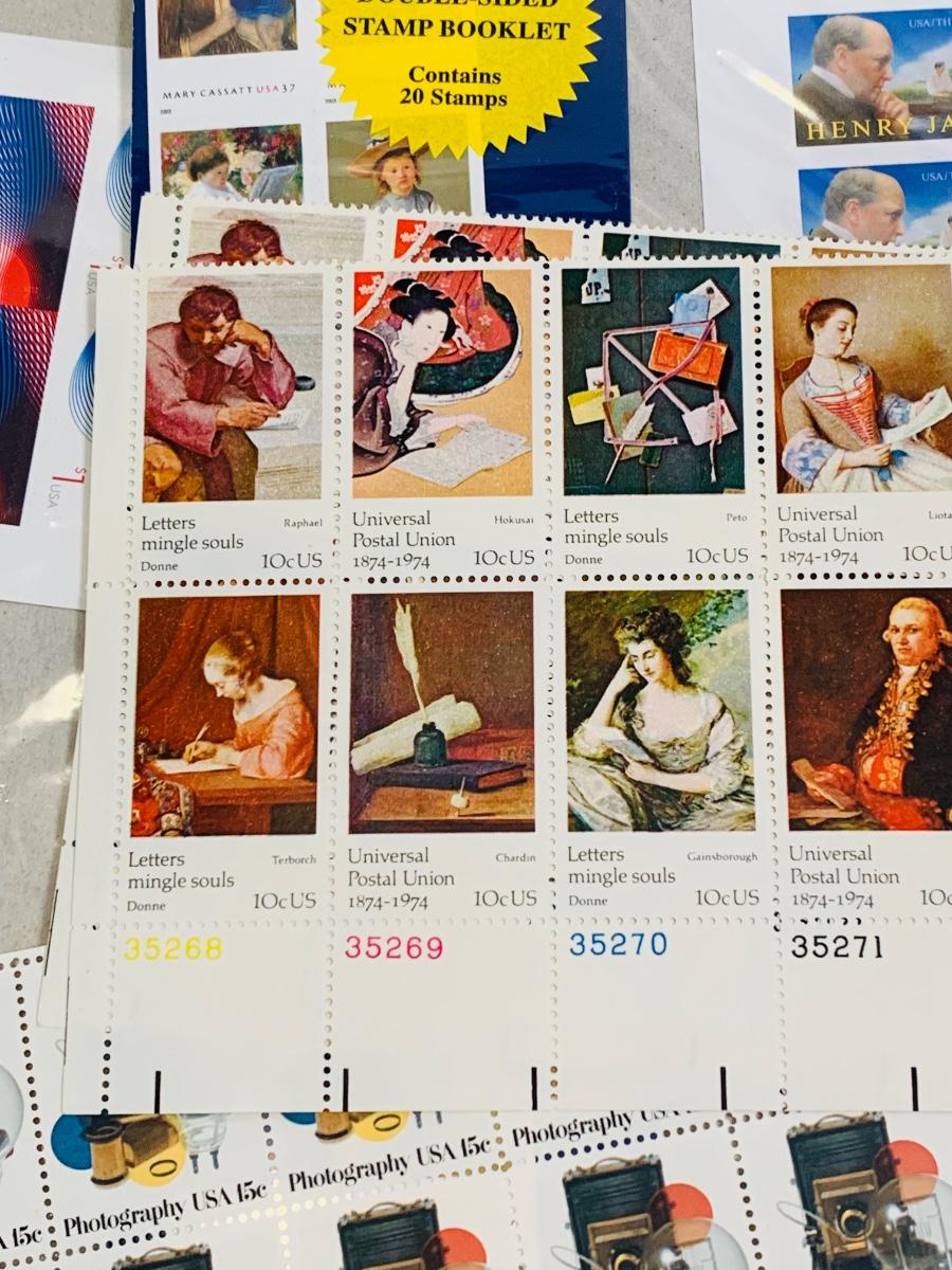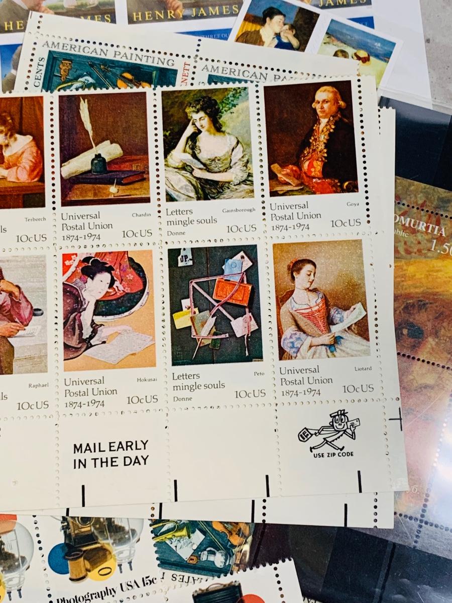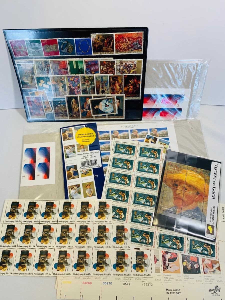 Nice collection of stamps including Patriotic Wave, painting, photography and more. Sealed, unsealed, full sheets, and loose stamps