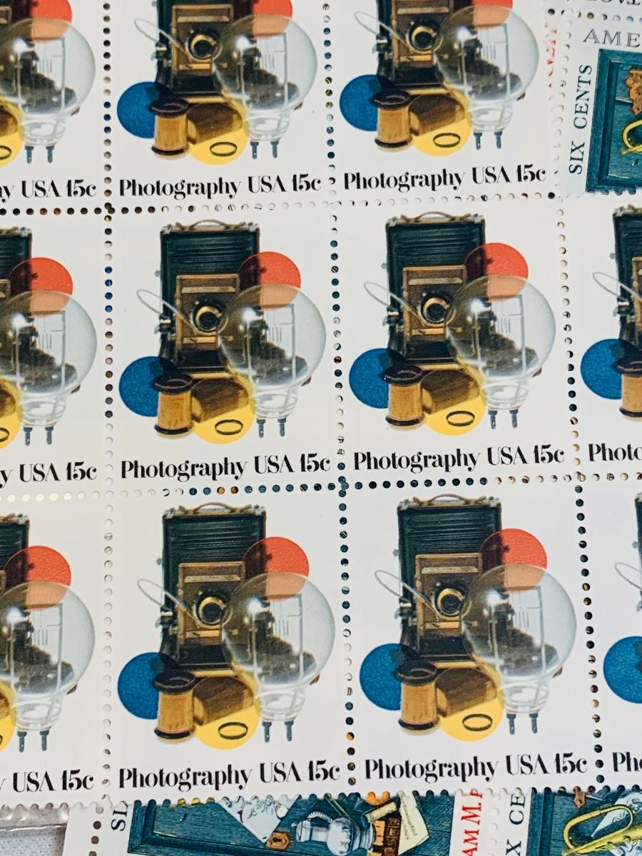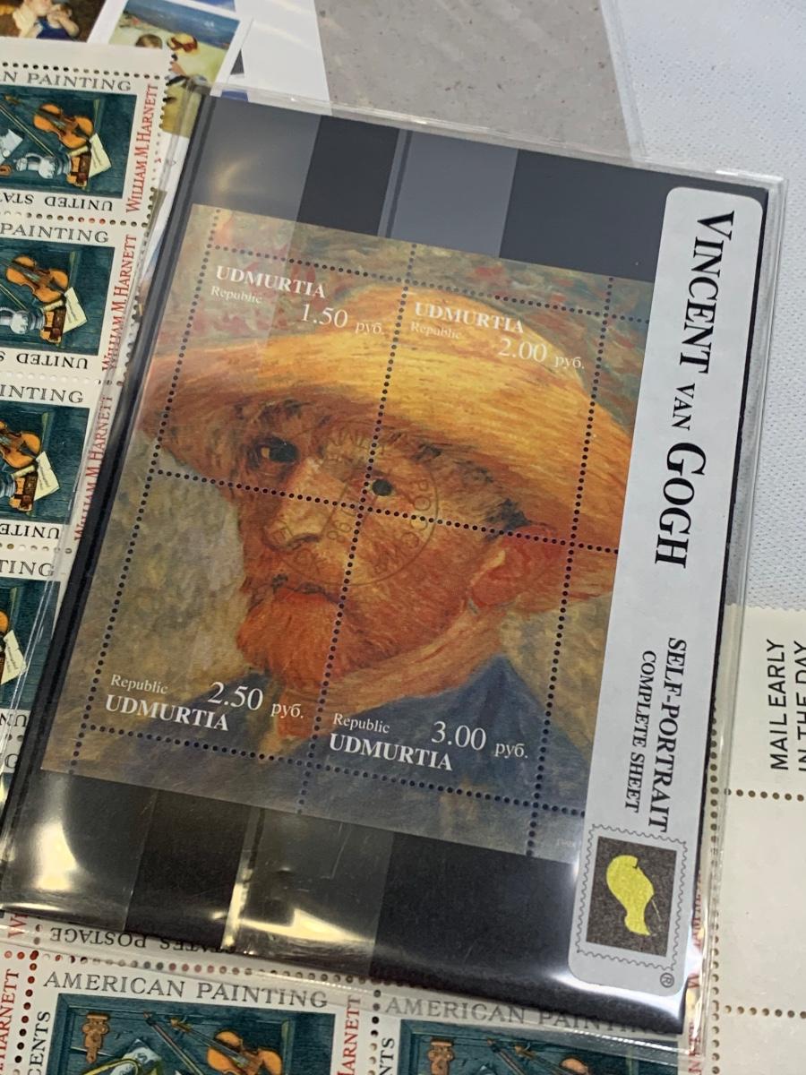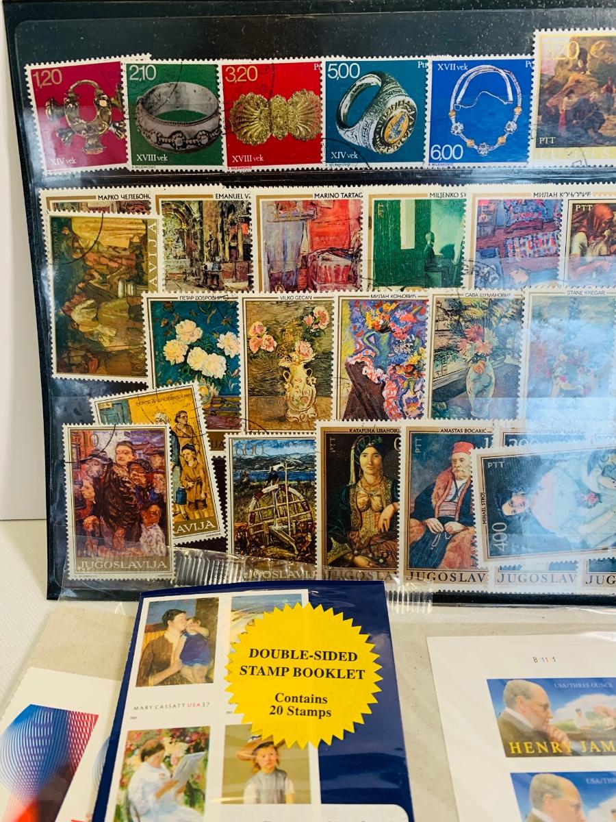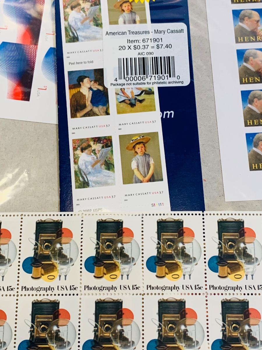 Nice collection of stamps including Patriotic Wave, painting, photography and more. Sealed, unsealed, full sheets, and loose stamps