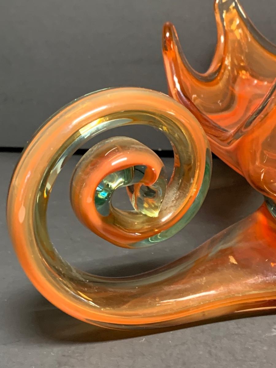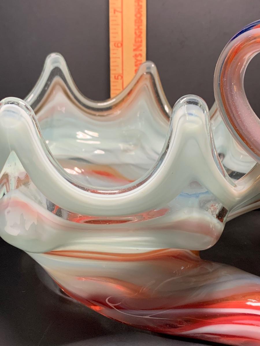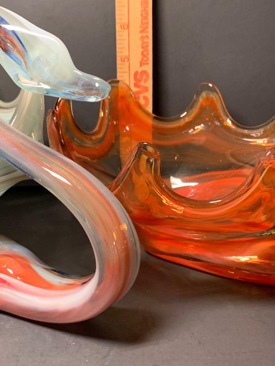Collection of 2 beautiful pieces of art glass. A vintage art glass swan in white & orange along with a cornucopia shaped art glass in clear and orange. Please see all pictures as they are the best representation of the items. The pictures show condition, measurements if taken, and what is included in the lot. Due to the large amount that we photograph and the time frame, we are not always able to take measurements. All items unless noted, are pre-owned and have been used. If you purchased furniture, you must bring help. We do not allow one person to carry large furniture out on their own. Bring help, tools and a truck for the safety of our client’s homes, and your personal safety. Any damages that result to the property including walls, and floors due to moving of the furniture will be charged to the buyer. Company policy. Thank you.