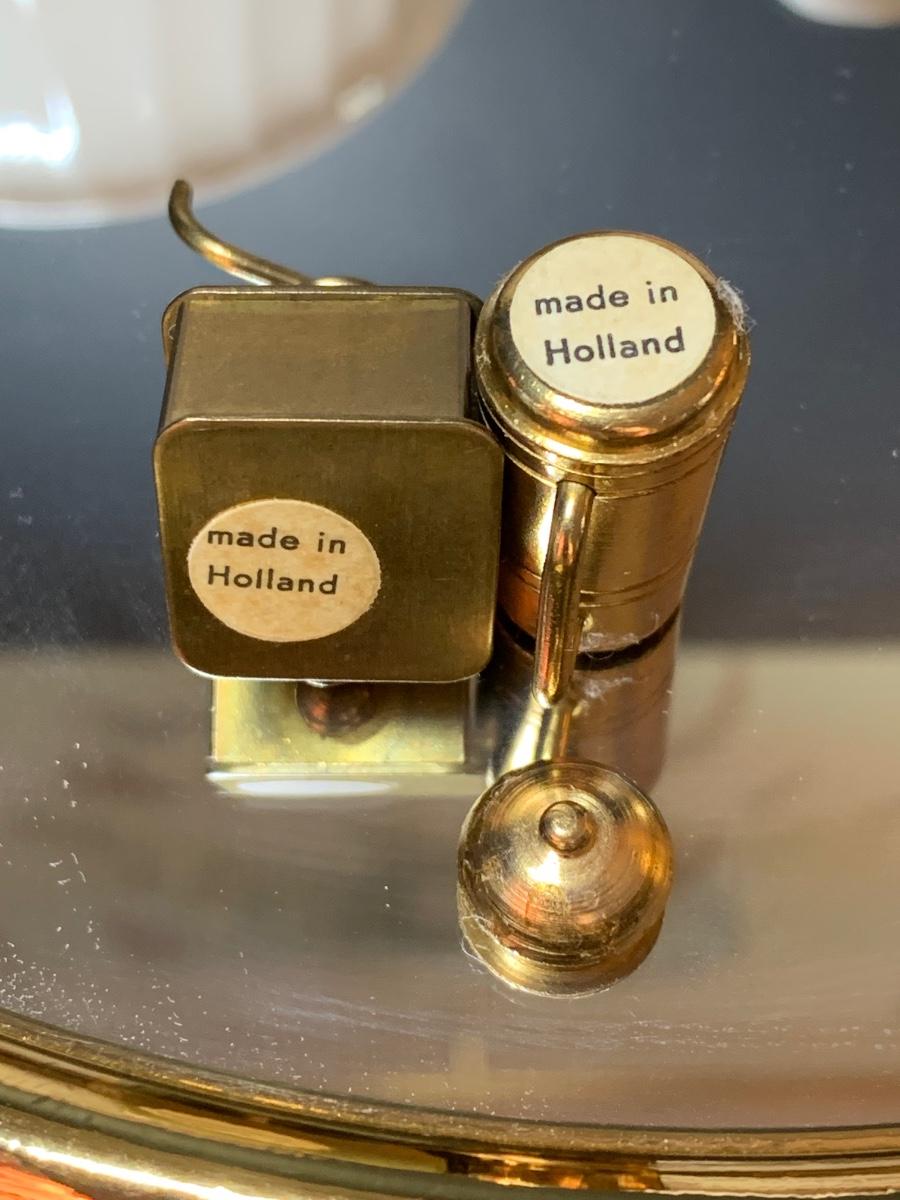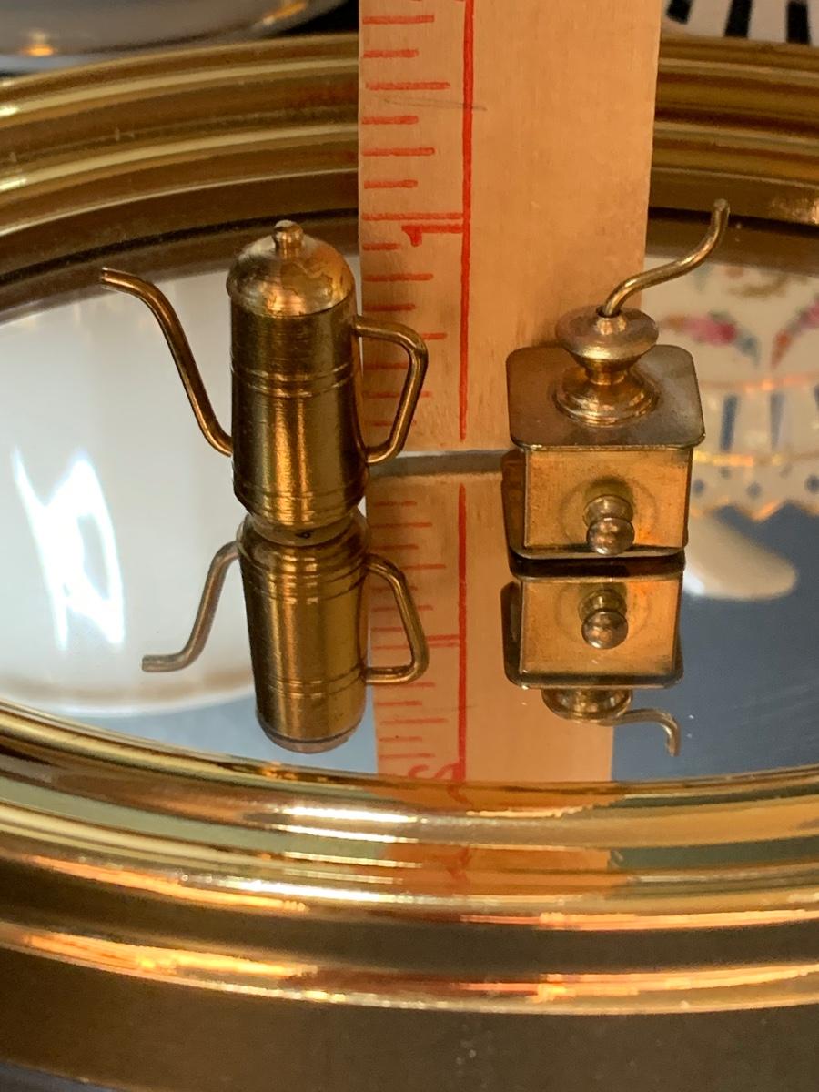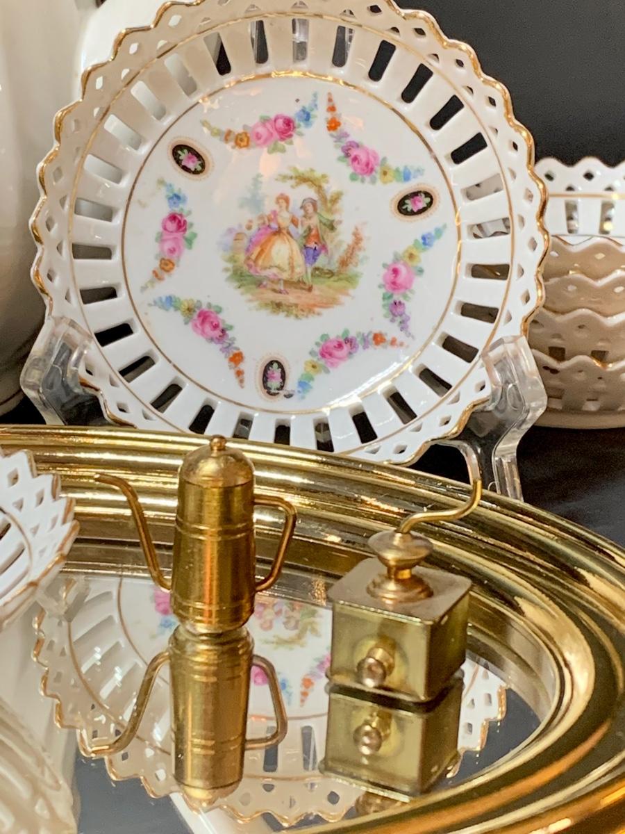 Vintage collectibles: Made in Holland brass coffee mill & teapot, Bavaria trinket dishes, oval mirror (can be uses as a tray or wall hanging)
