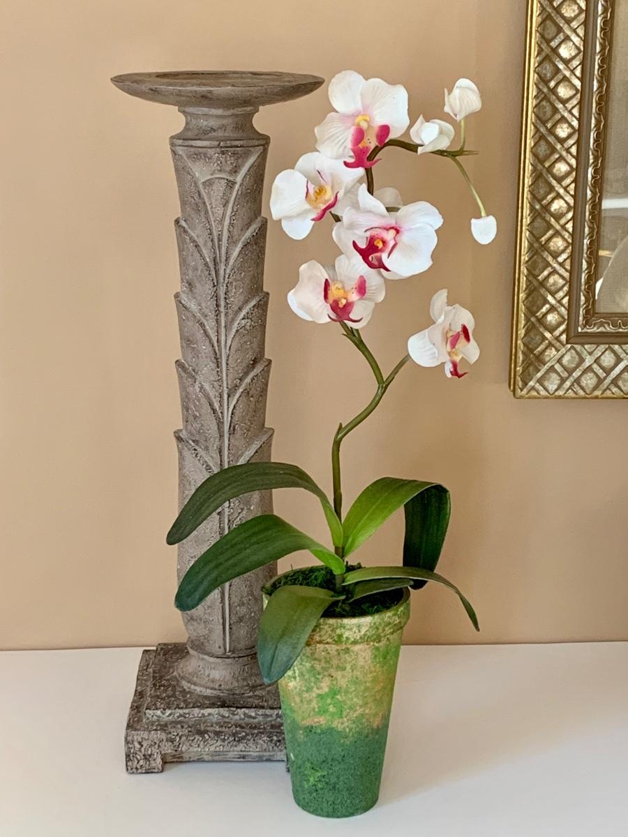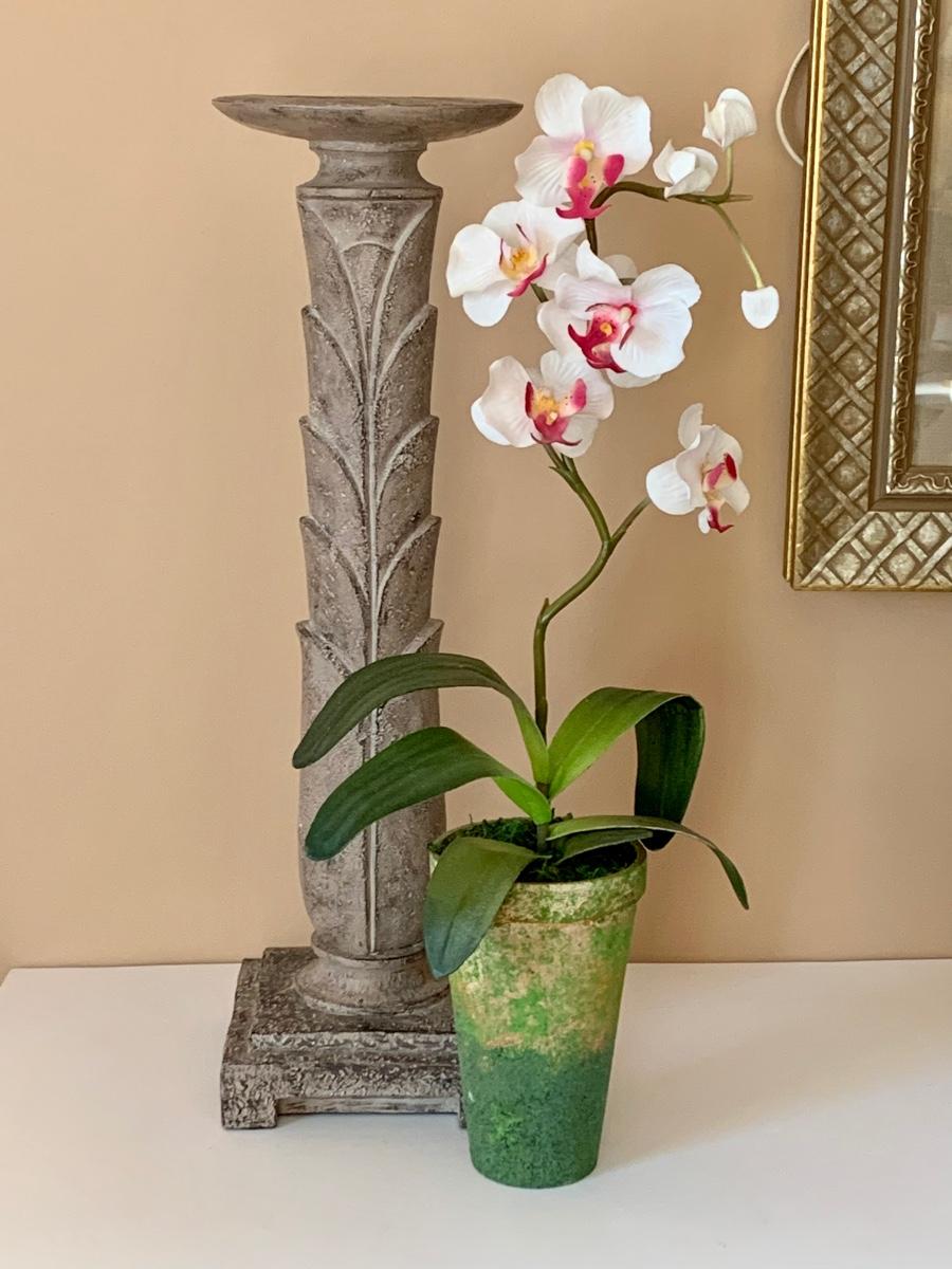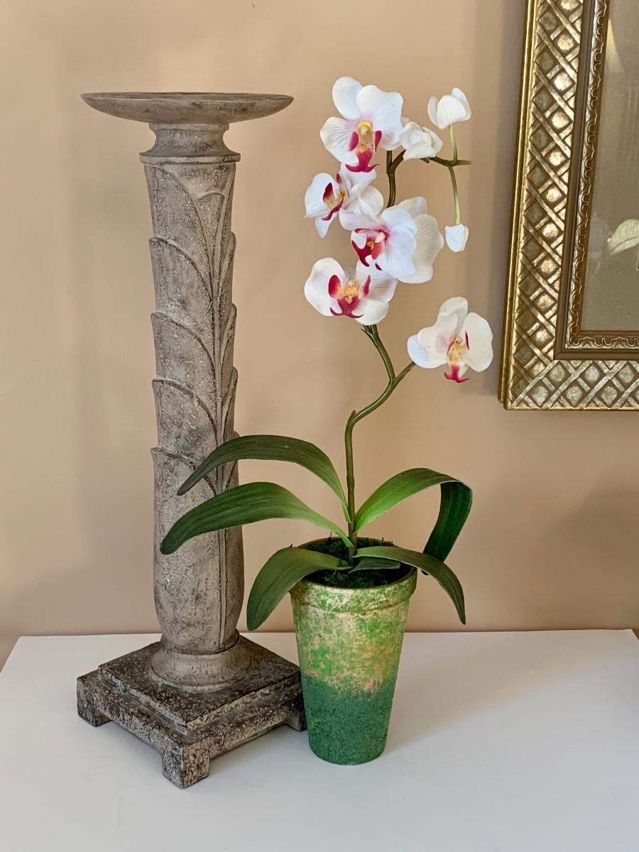 Candlestick or plant stand with a palm leaf pattern and a lovely faux orchid. The candle is heavy but not metal.