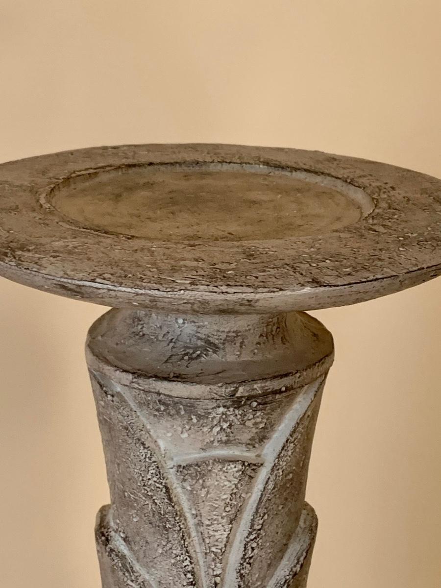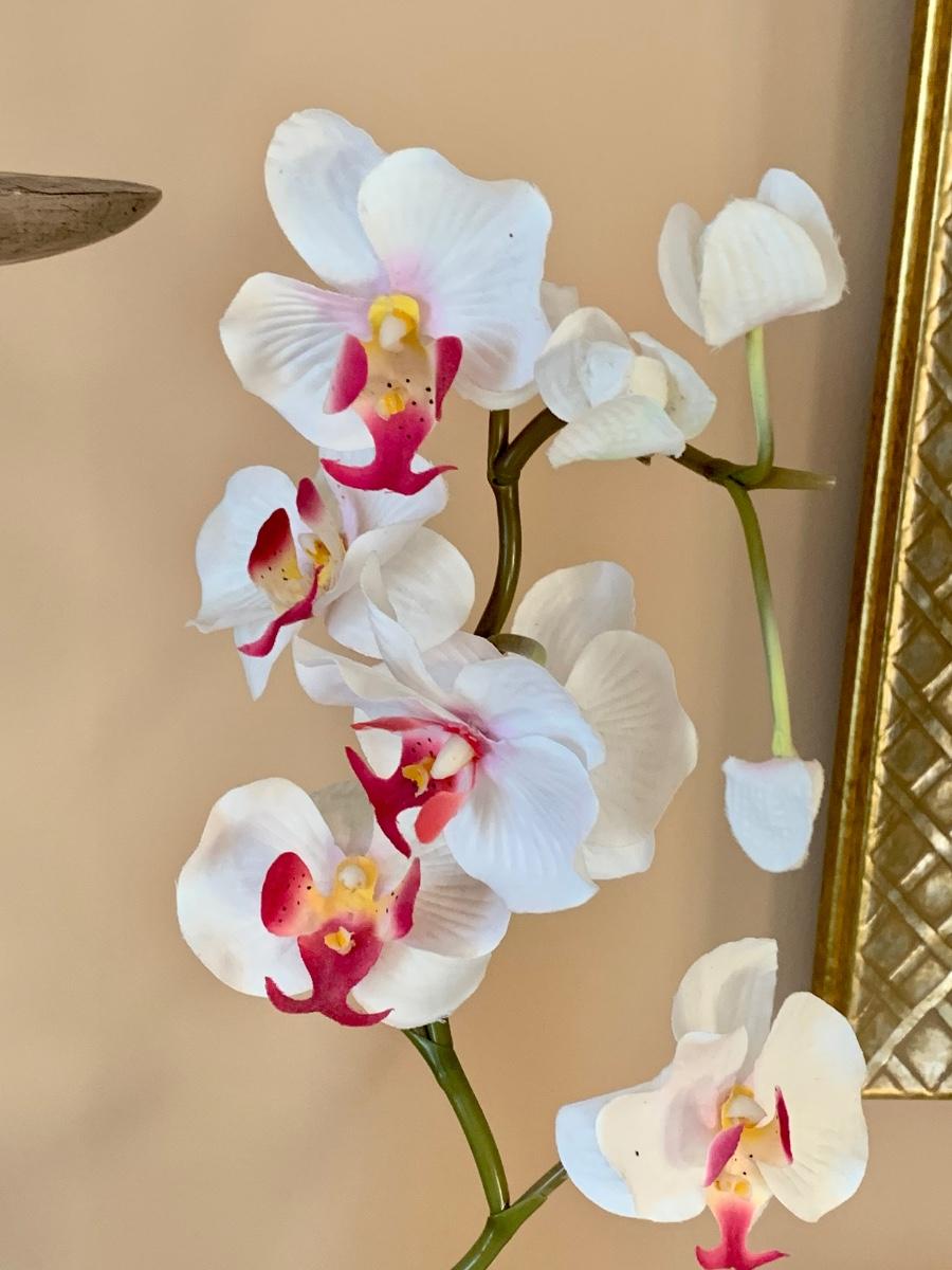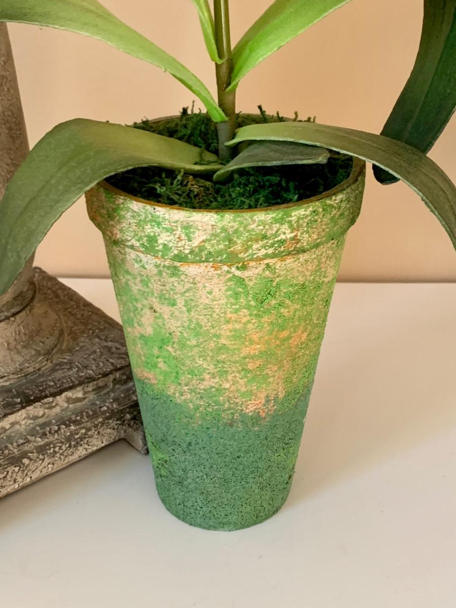 Candlestick or plant stand with a palm leaf pattern and a lovely faux orchid. The candle is heavy but not metal.