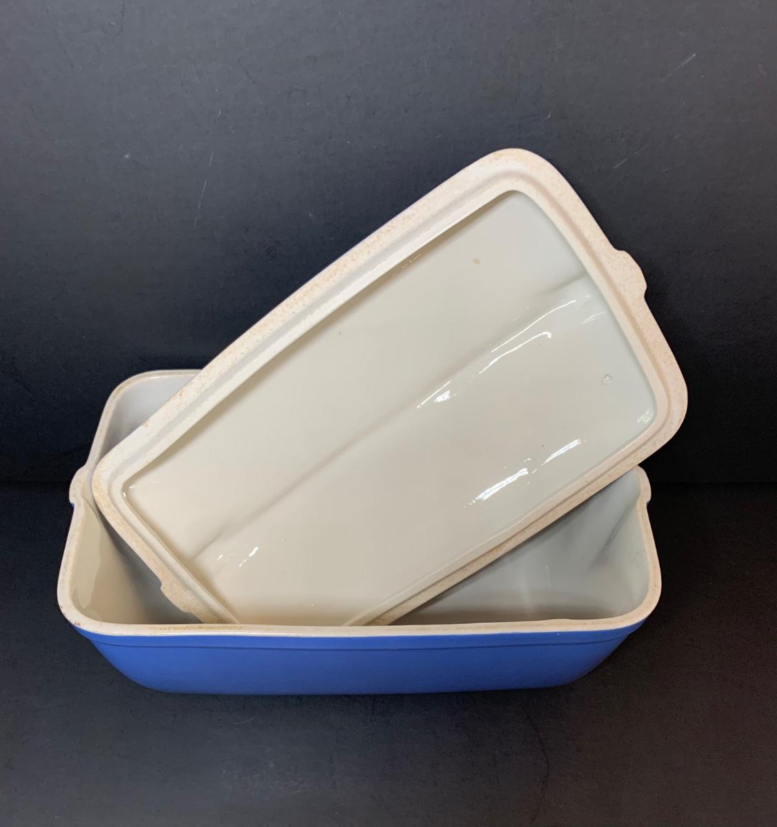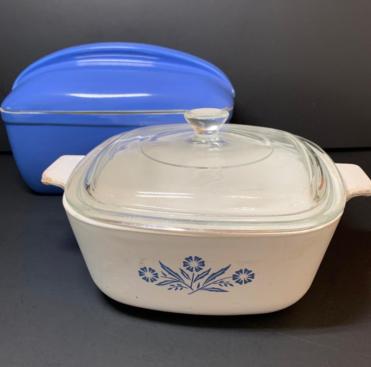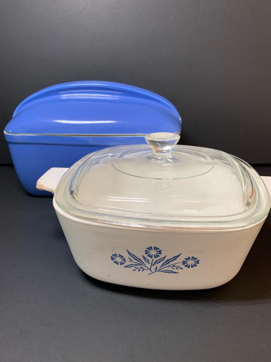 Vintage Hall for Westinghouse blue ceramic loaf pan With lid along with Corning Ware casserole cover dish - this is a great kitchen collection!