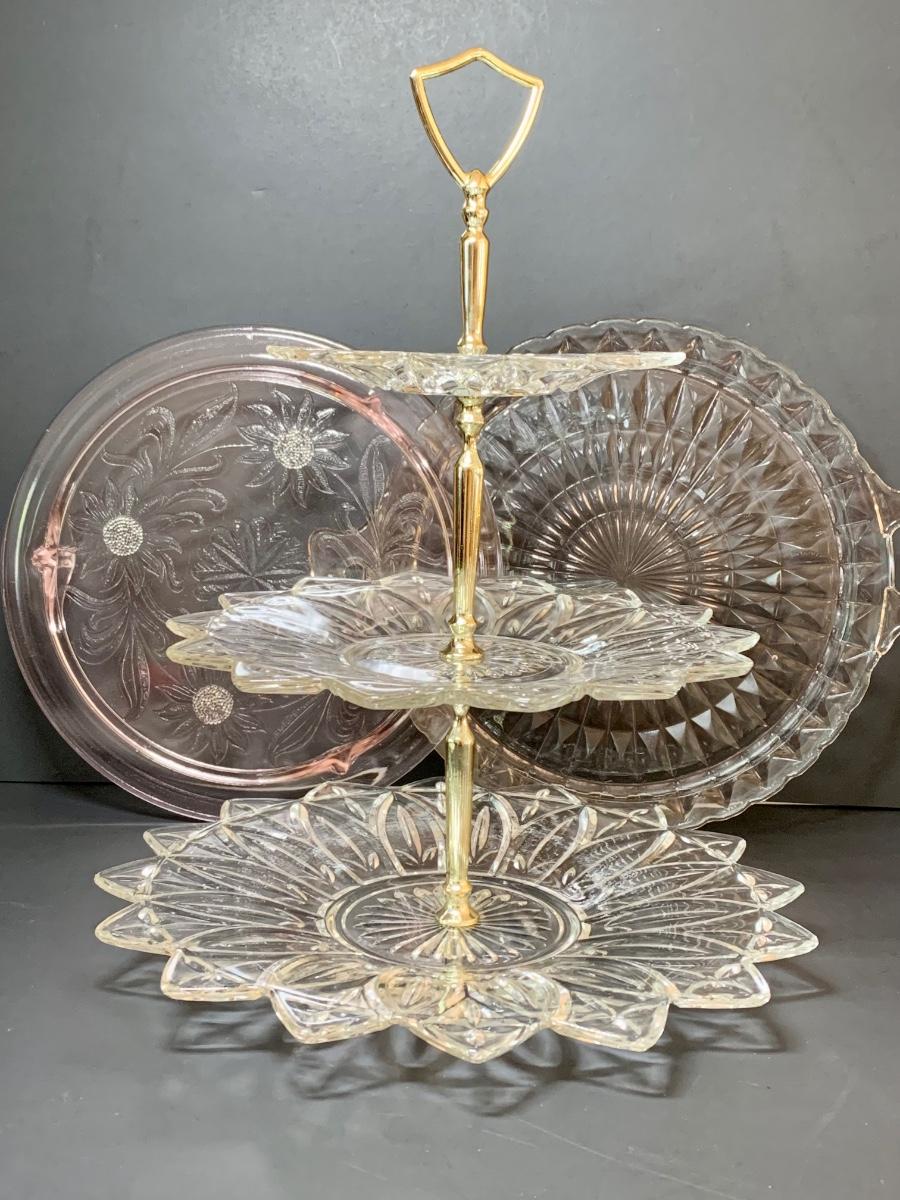 Lot 218R: Pink Depression Glass Cake Plates & Federal Glass Tiered Tidbit Stand
