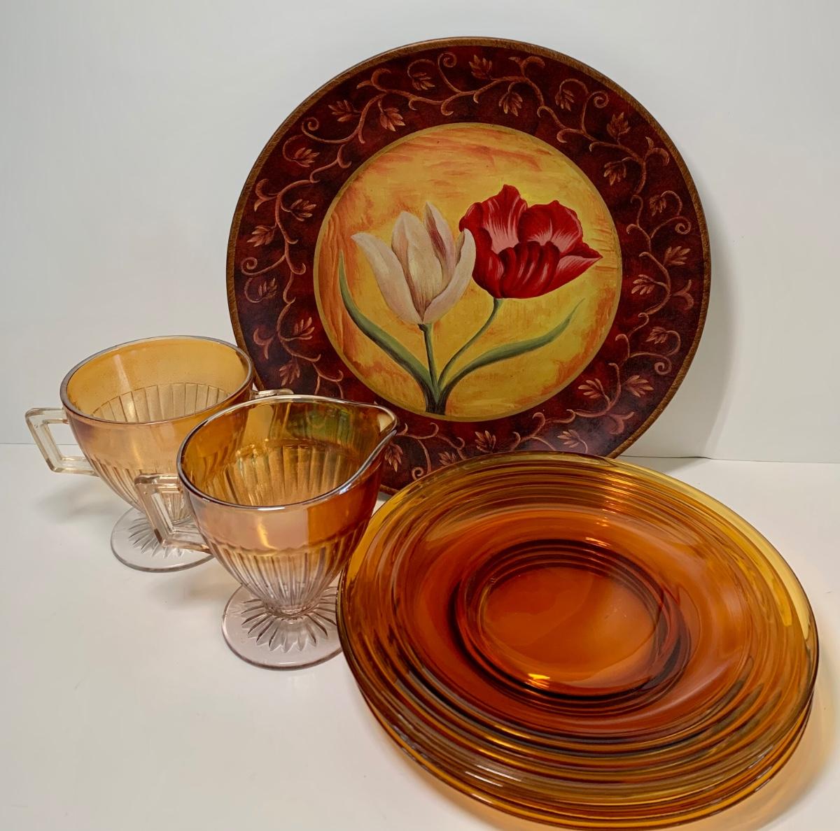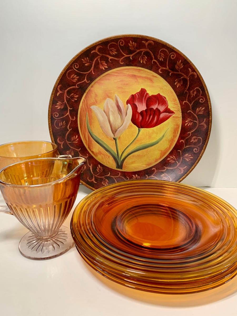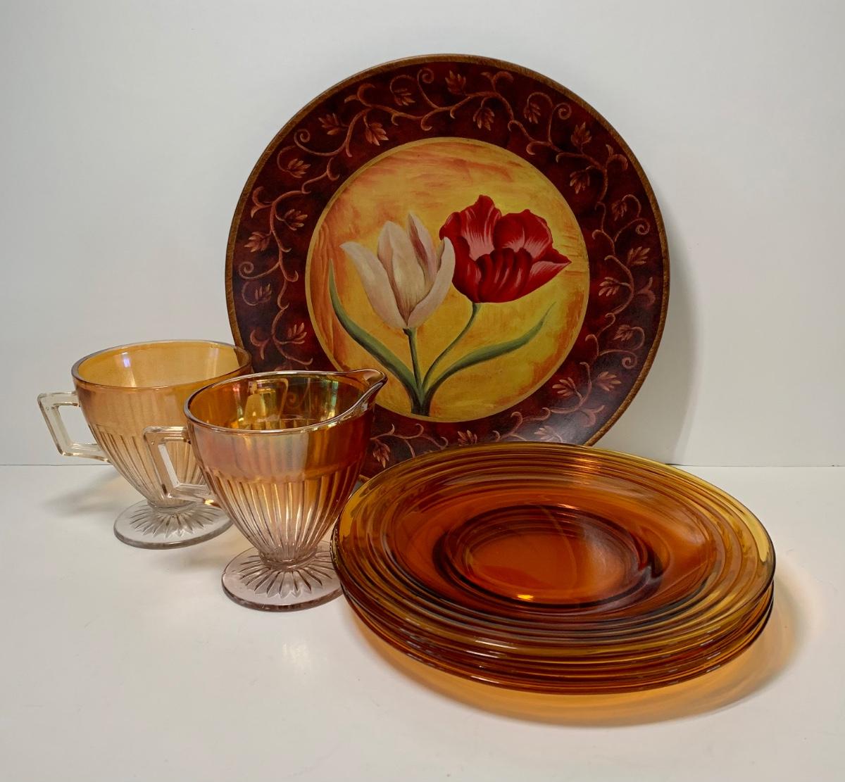 Collections includes a set of four 8 inch amber plates, amber carnival glass creamer & sugar set and a floral decorative plate.