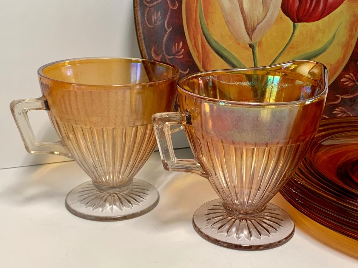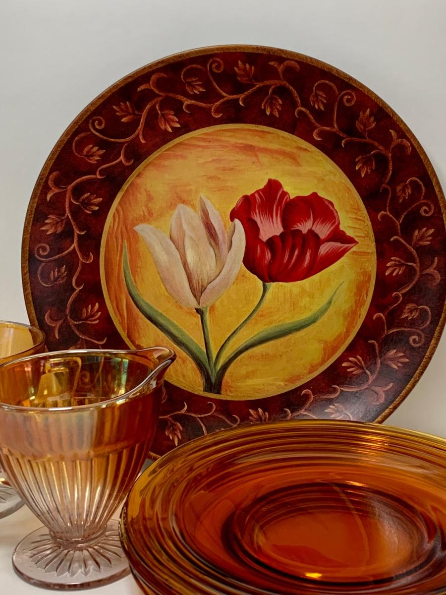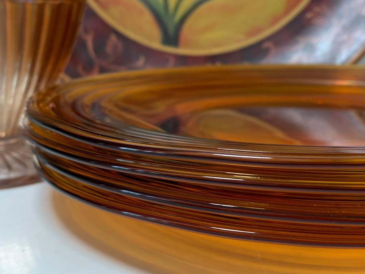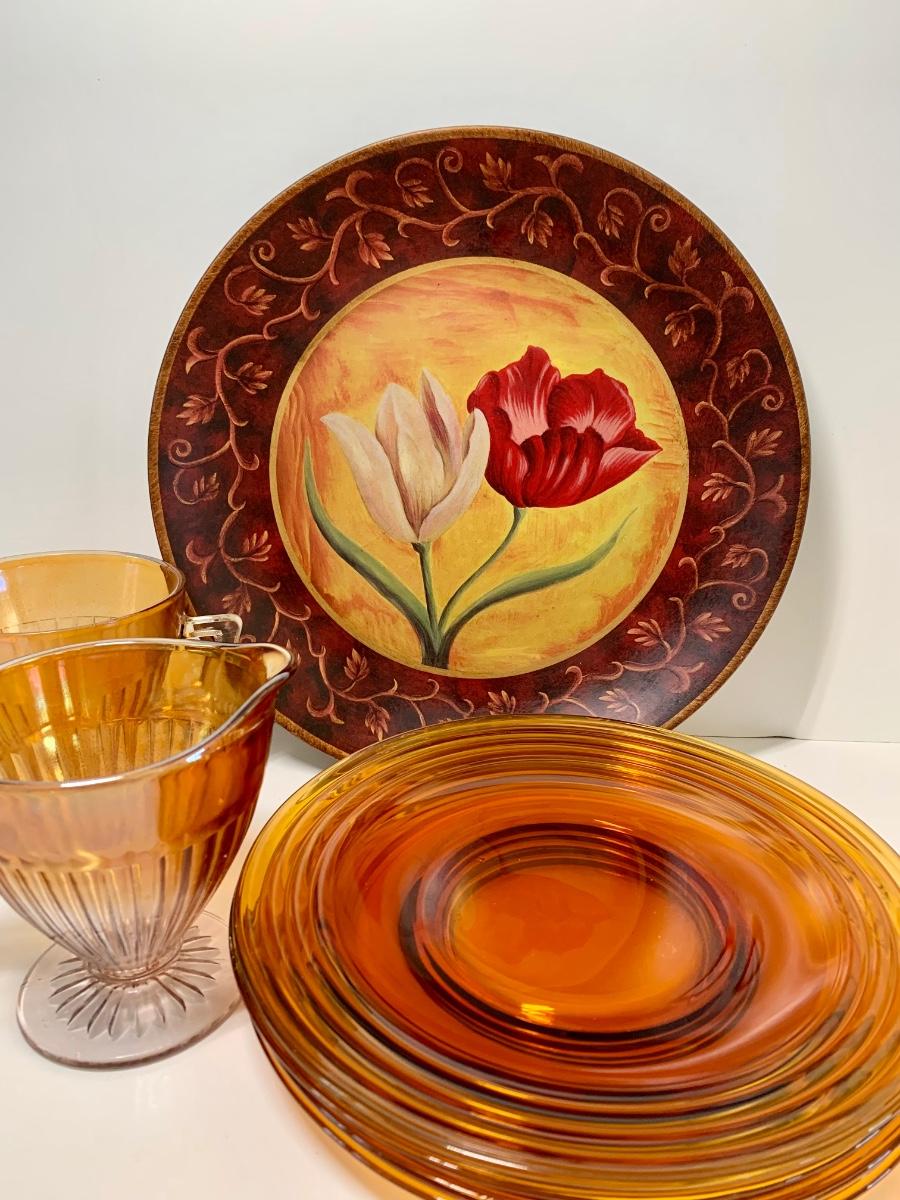 Collections includes a set of four 8 inch amber plates, amber carnival glass creamer & sugar set and a floral decorative plate.