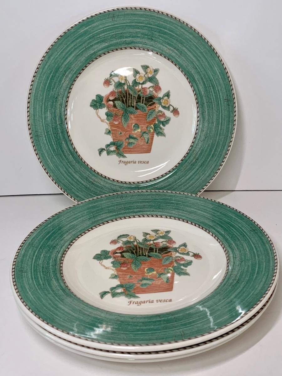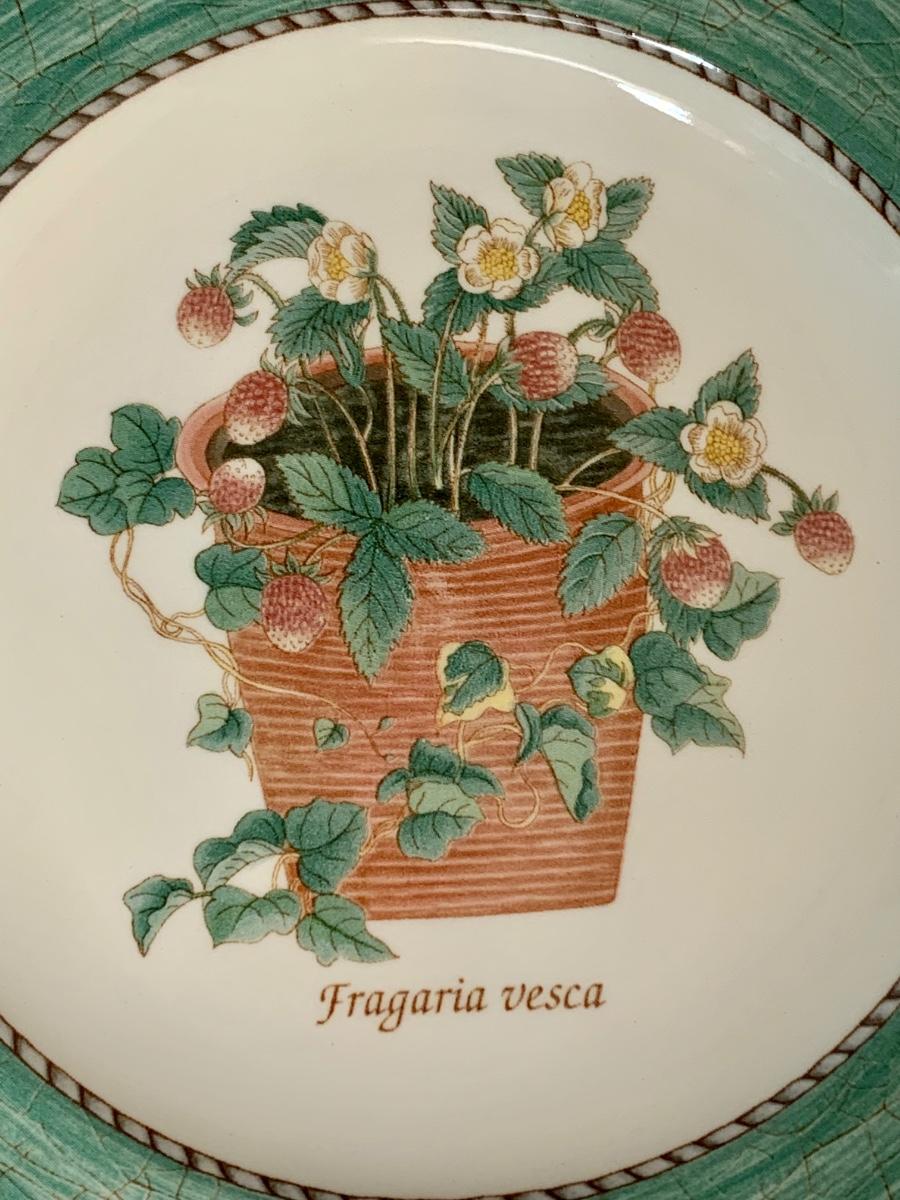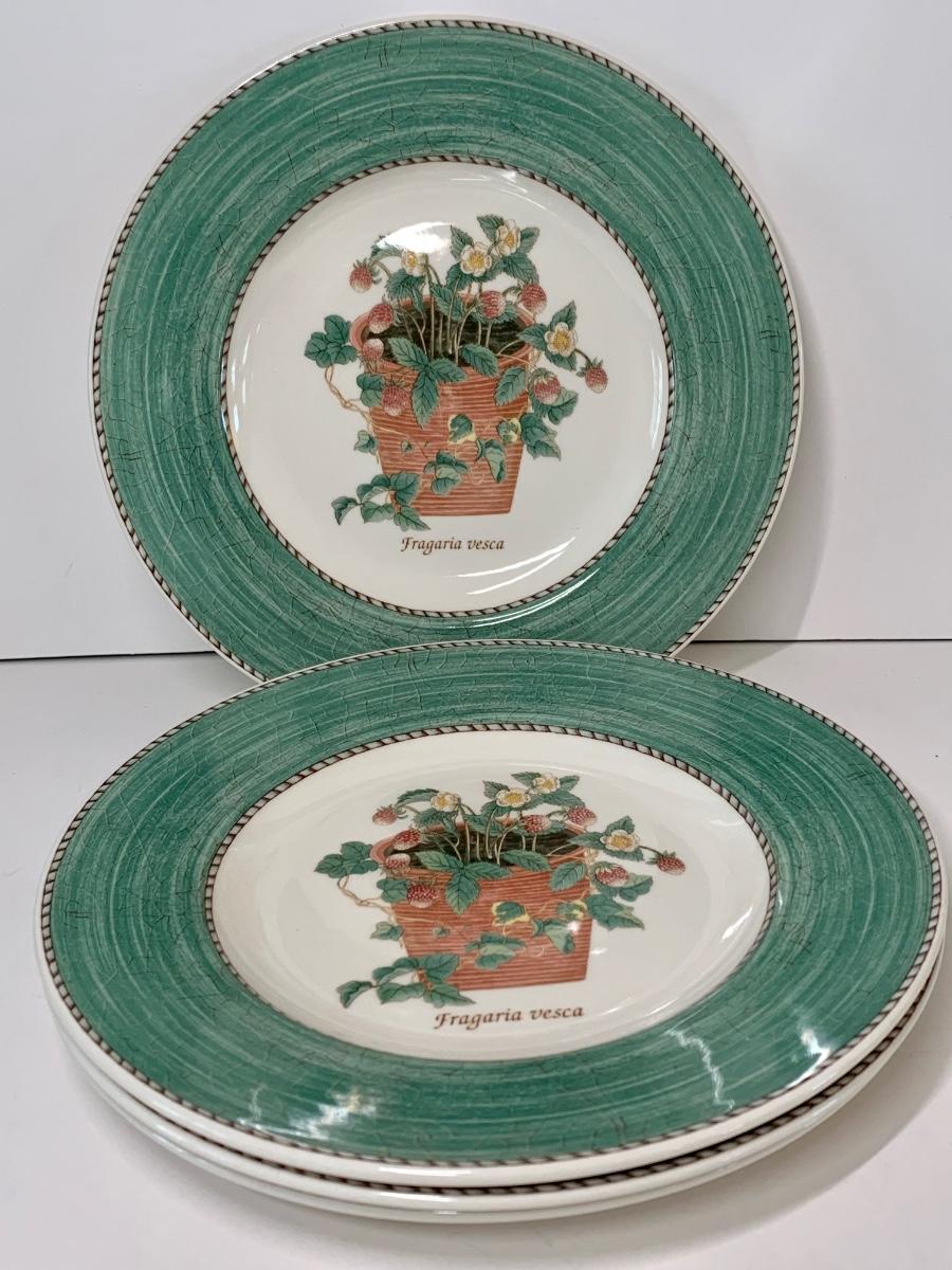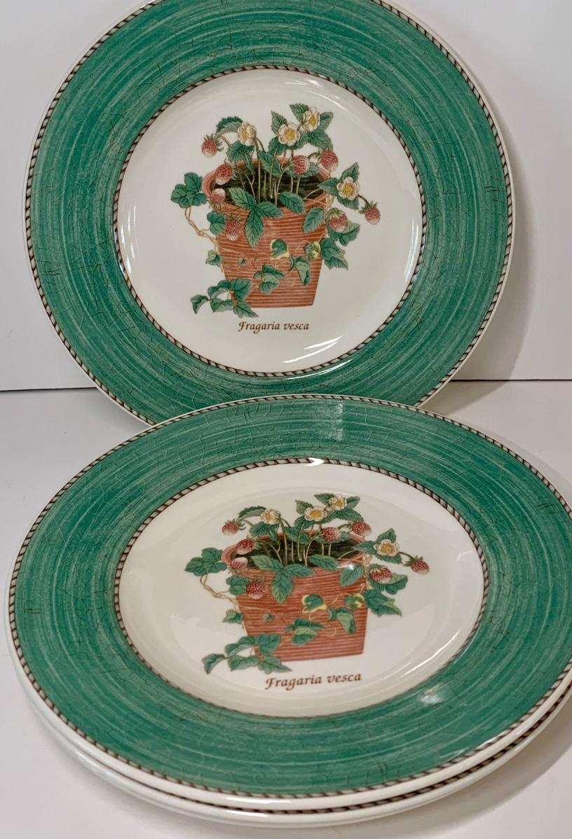 Perfect for a light lunch gathering! Set of 4 Wedgwood Sarah's Garden, Queens Ware, Salad Plate They are lovely with a potted strawberry plant and the words "Fragaria vesca" in the middle of the plate. The edges of the plate are green with a brown and gray trim.