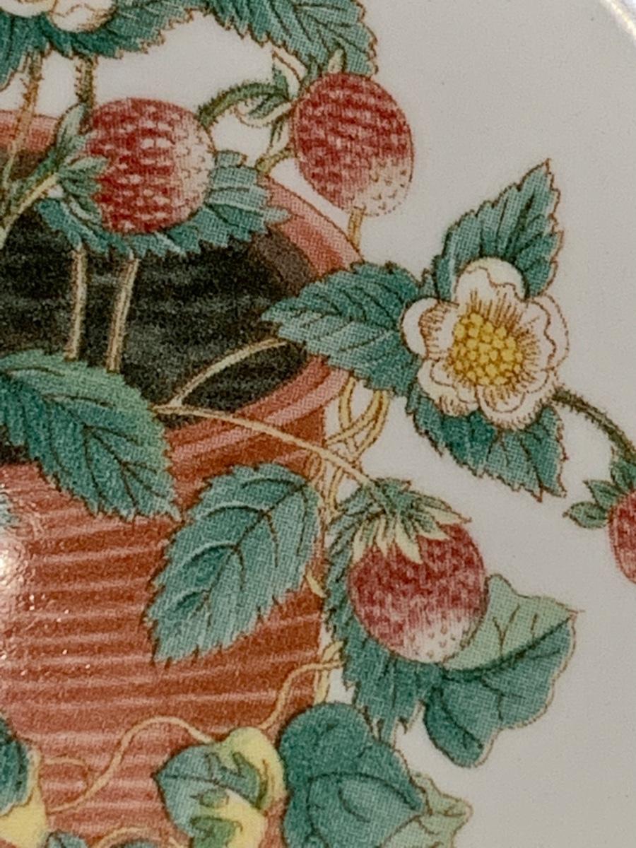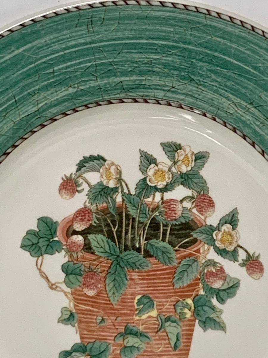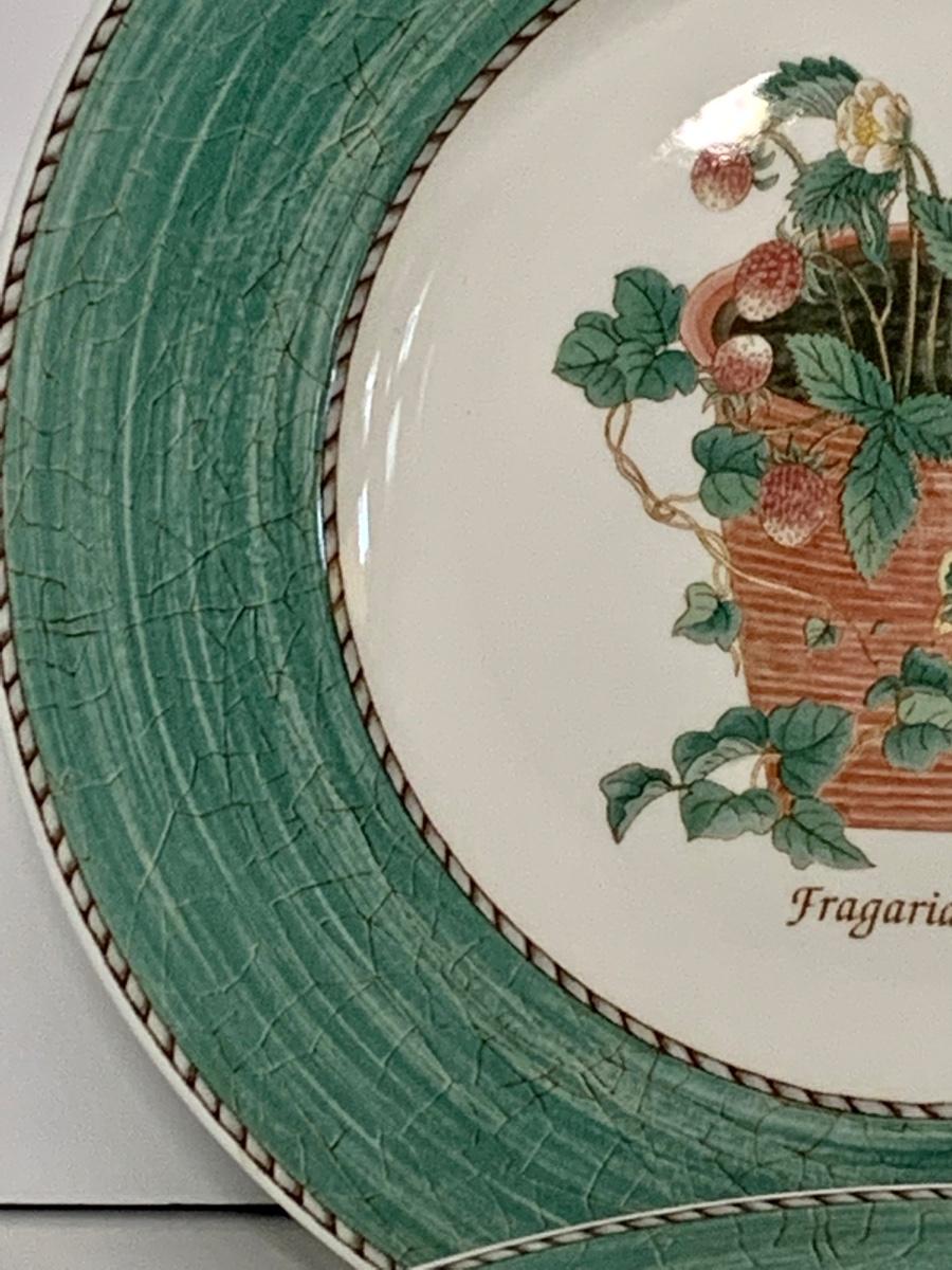 Perfect for a light lunch gathering! Set of 4 Wedgwood Sarah's Garden, Queens Ware, Salad Plate They are lovely with a potted strawberry plant and the words "Fragaria vesca" in the middle of the plate. The edges of the plate are green with a brown and gray trim.