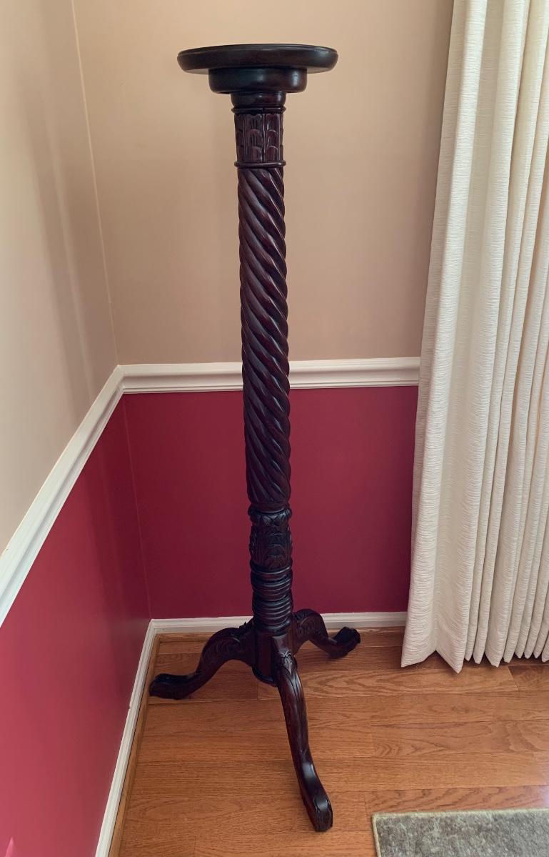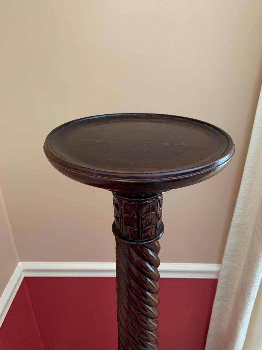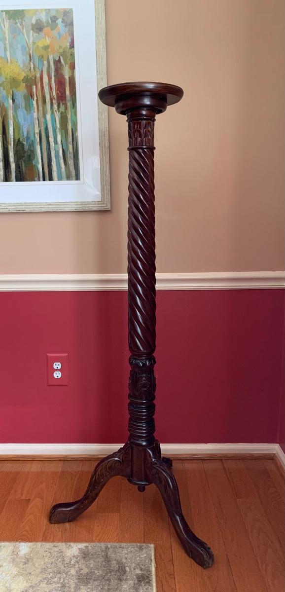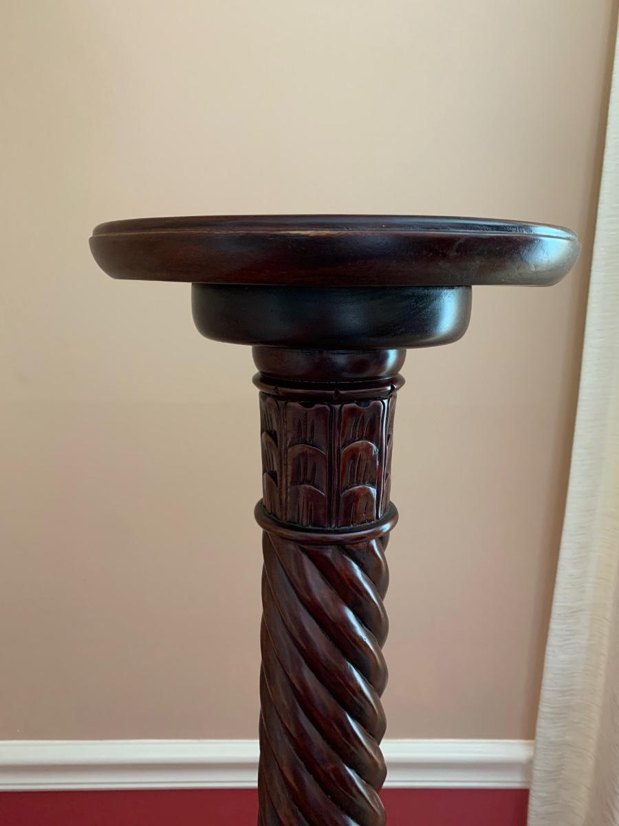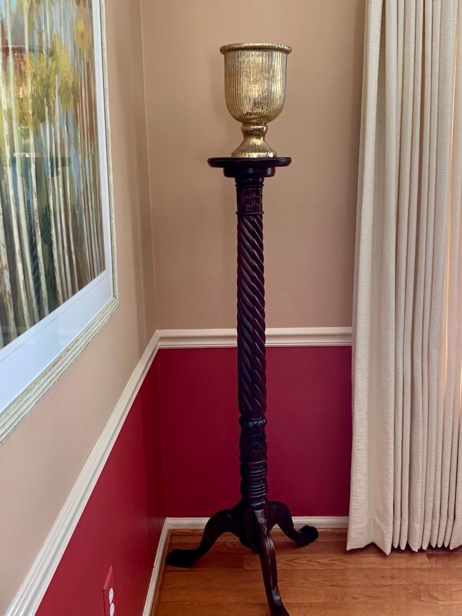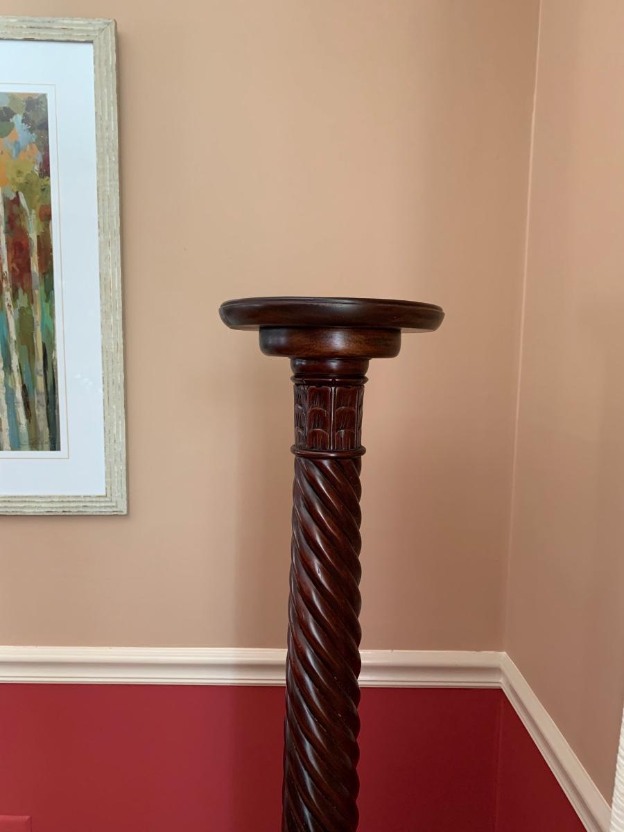 Gorgeous tall barley twist pedestal/stand with a nice, dark, rich stain. It can be used to showcase ginger jars, plants, bronzes etc. Looks great in a corner. Also included is a glass vase with a mercury glass finish.
