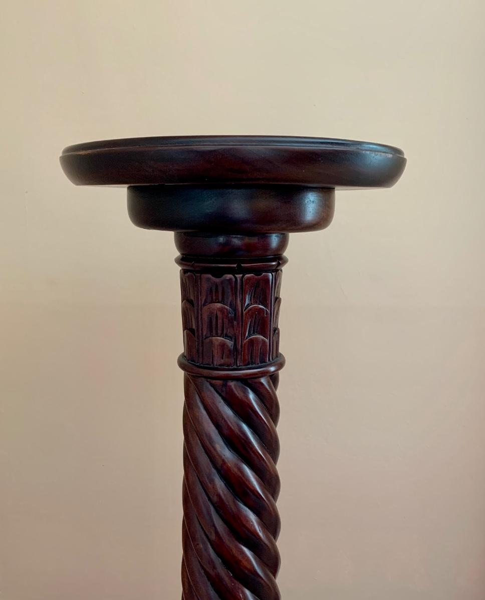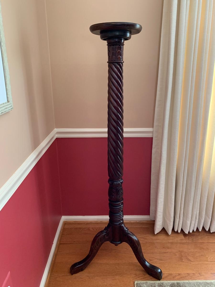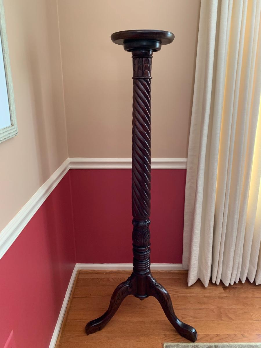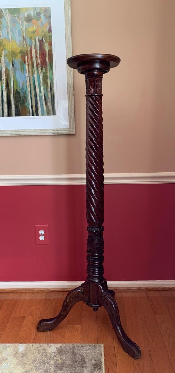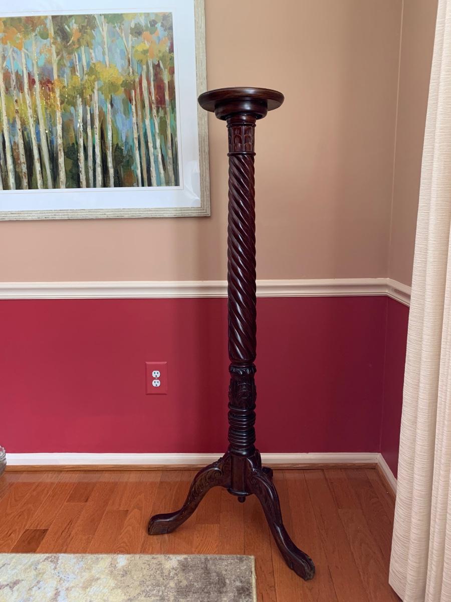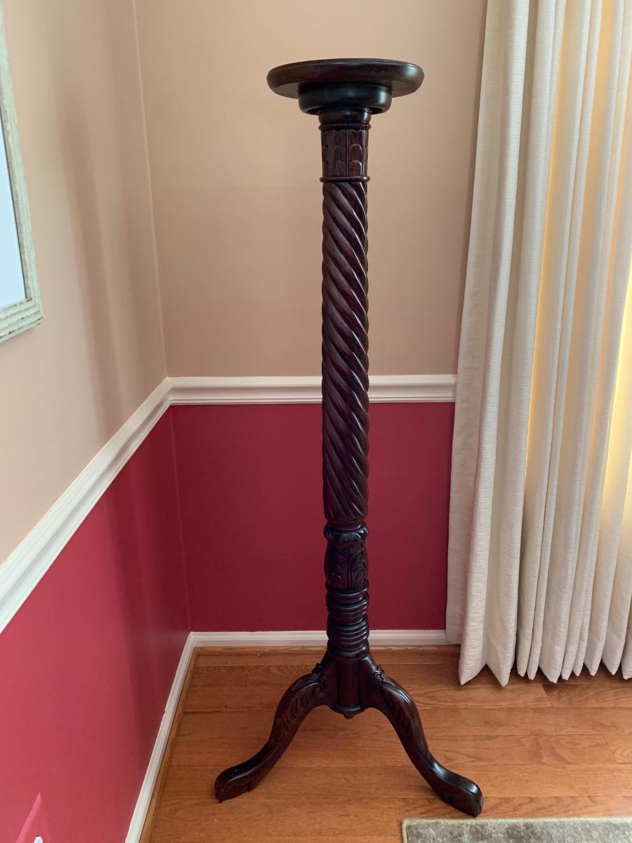 Gorgeous tall barley twist pedestal/stand with a nice, dark, rich stain. It can be used to showcase ginger jars, plants, bronzes etc. Looks great in a corner. Also included is a glass vase with a mercury glass finish.