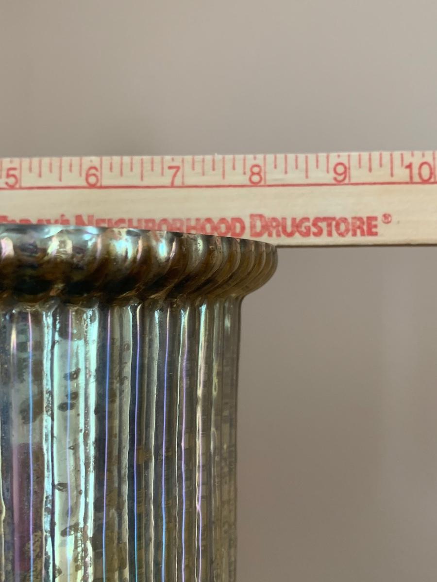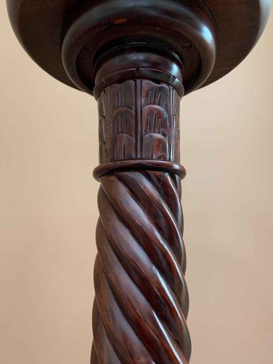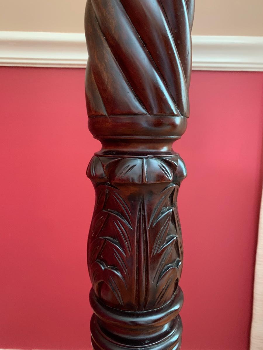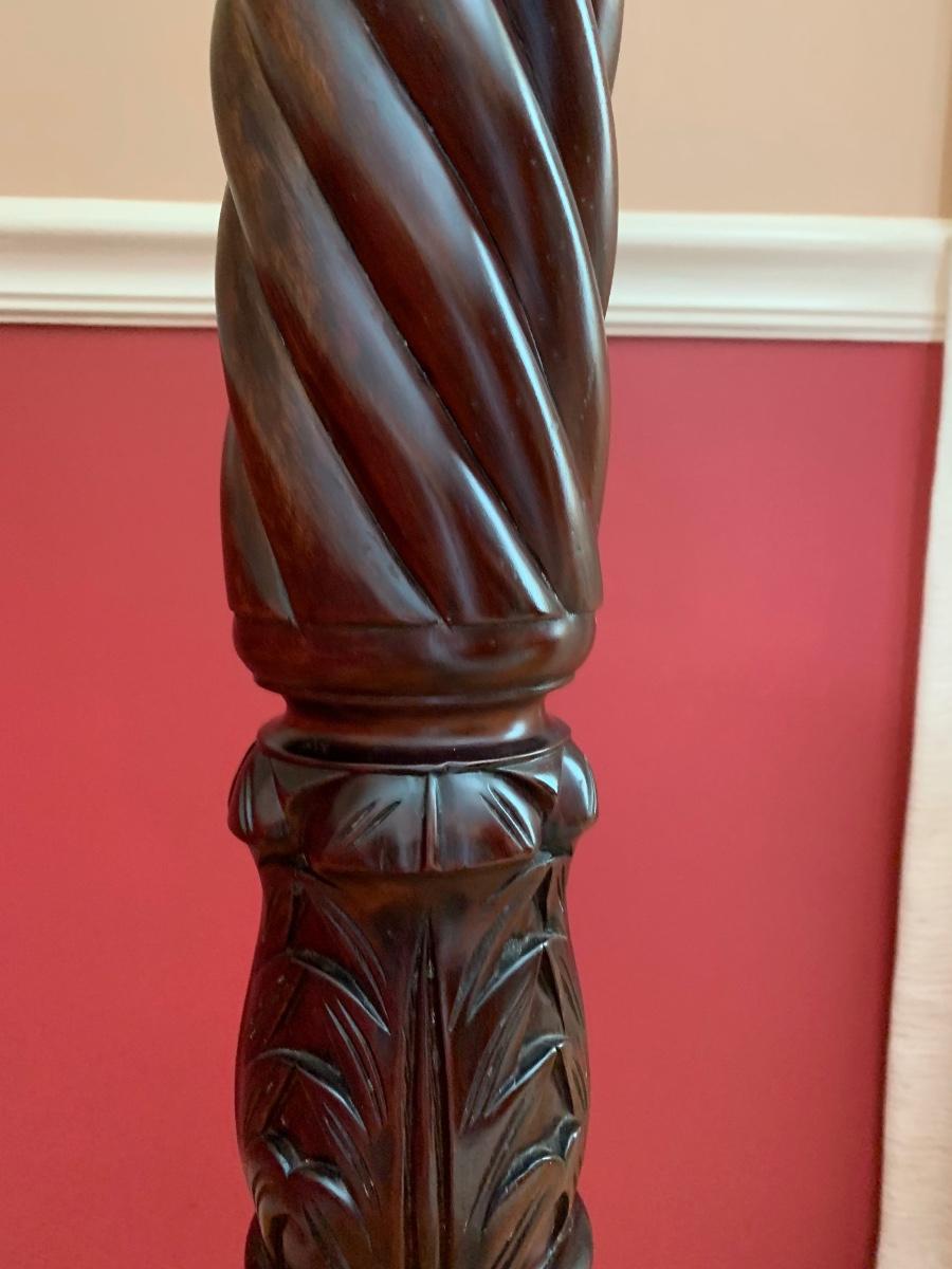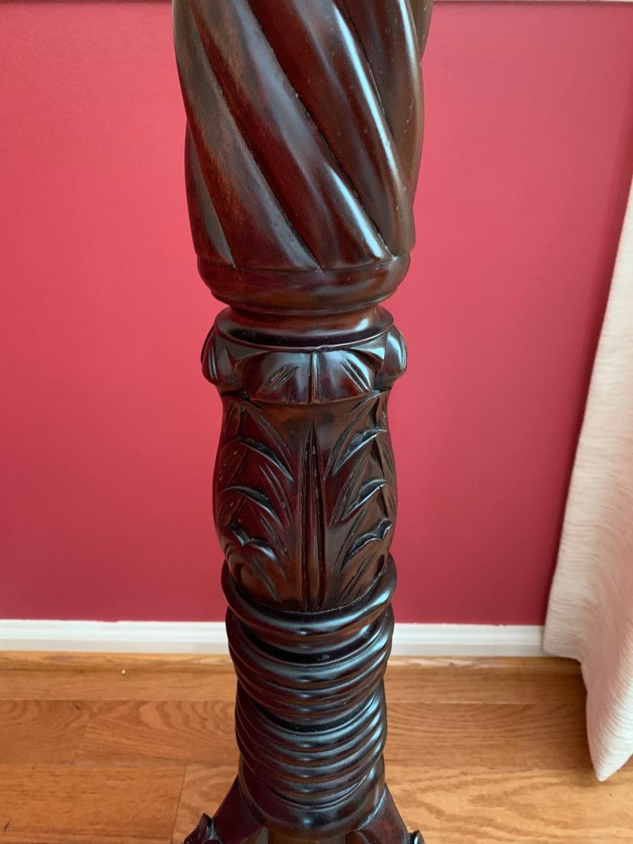 Gorgeous tall barley twist pedestal/stand with a nice, dark, rich stain. It can be used to showcase ginger jars, plants, bronzes etc. Looks great in a corner. Also included is a glass vase with a mercury glass finish.