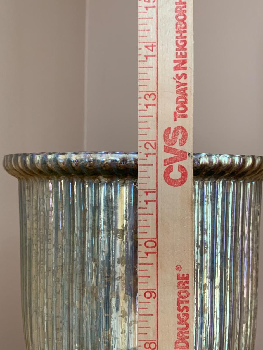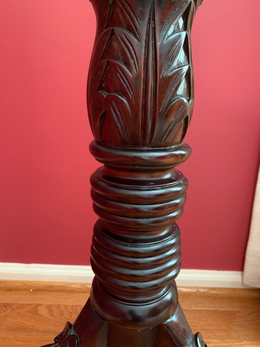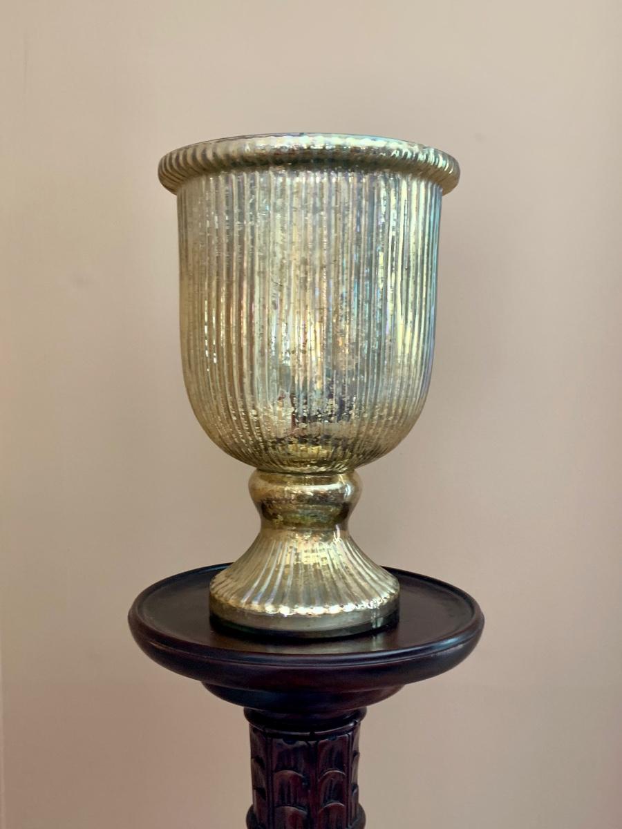 Lot 204R: Tall Wood Spindle Leg Plant Stand with Carved Accents & Mercury Glass Vase