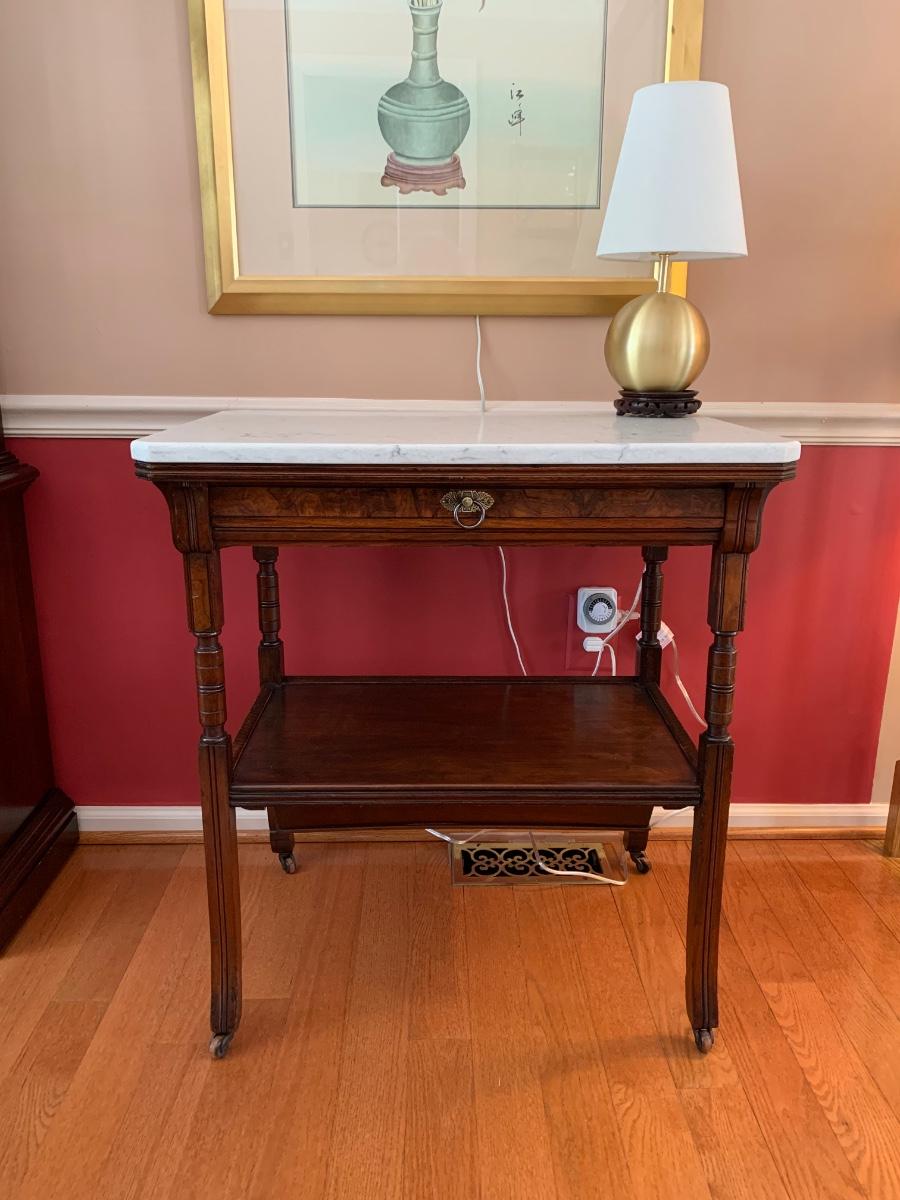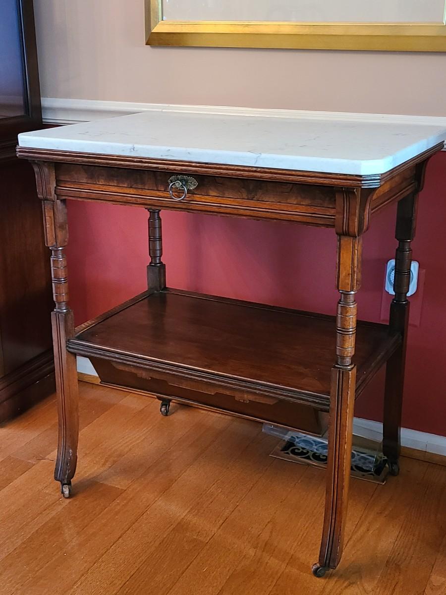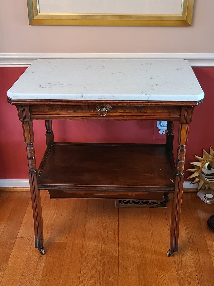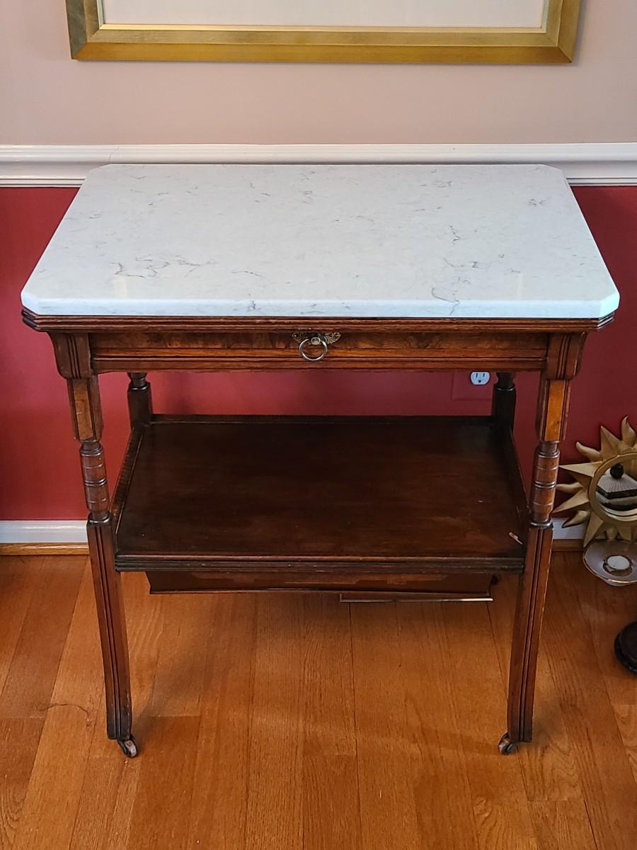 Lot 201R: Antique  Marble Top Table with 2 Drawers (One Hidden)