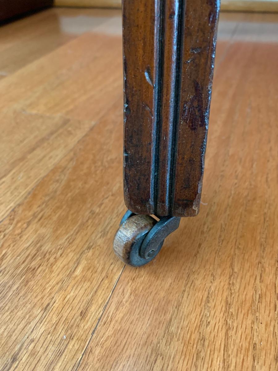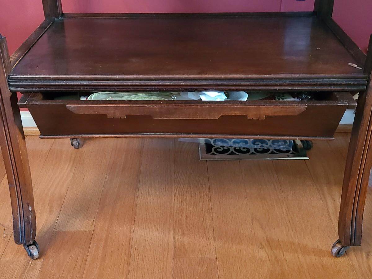 This collection include the table only. Beautiful accent table with a removable marble top, a small hidden drawer in the bottom and wooden wheels.