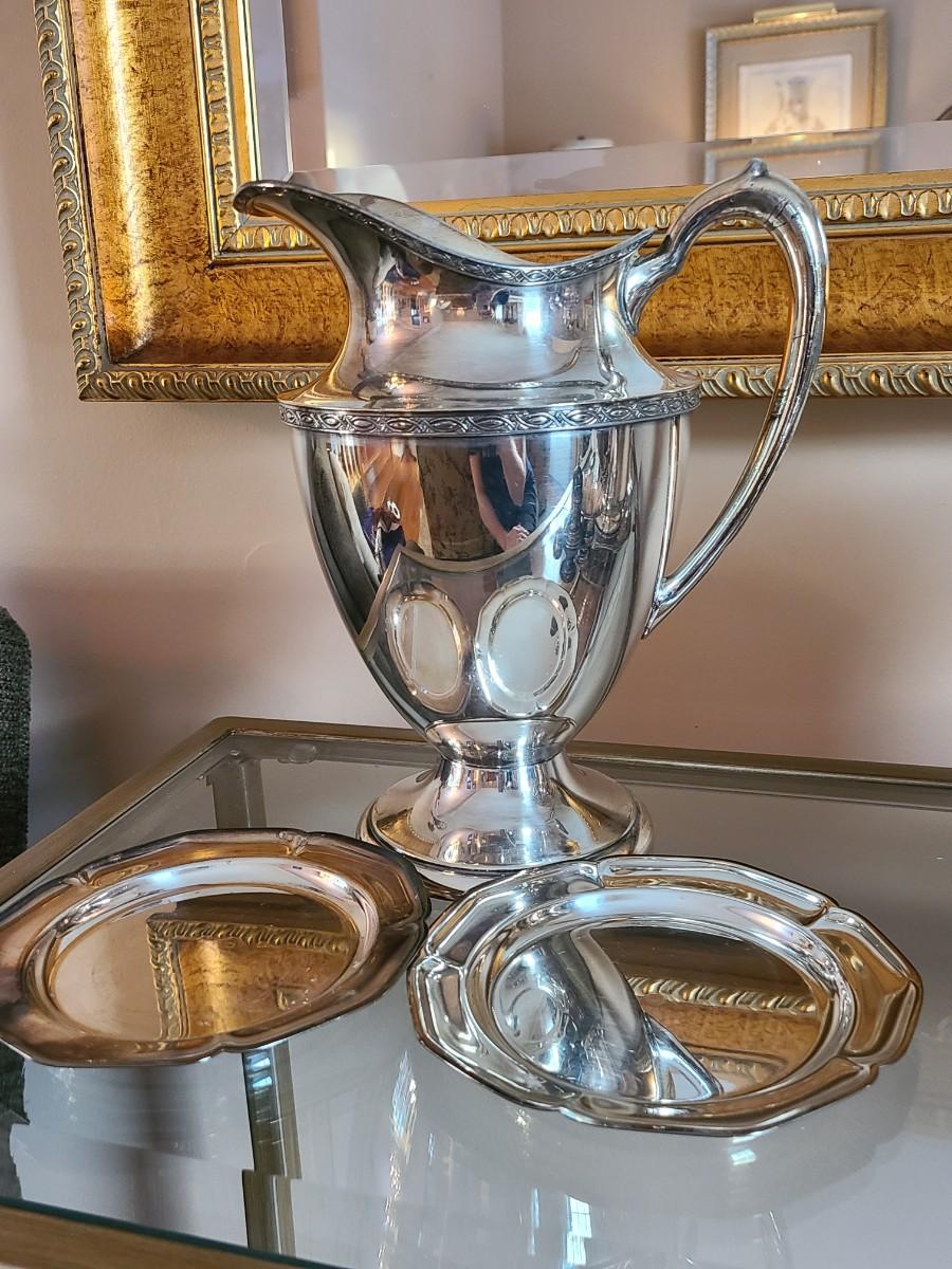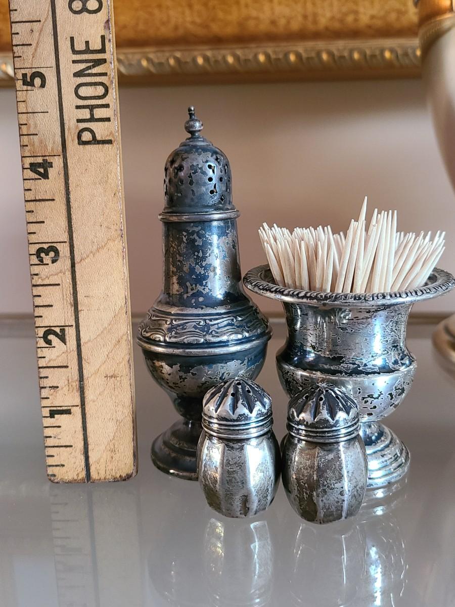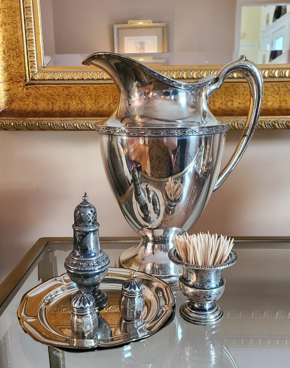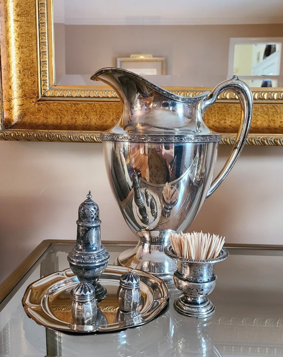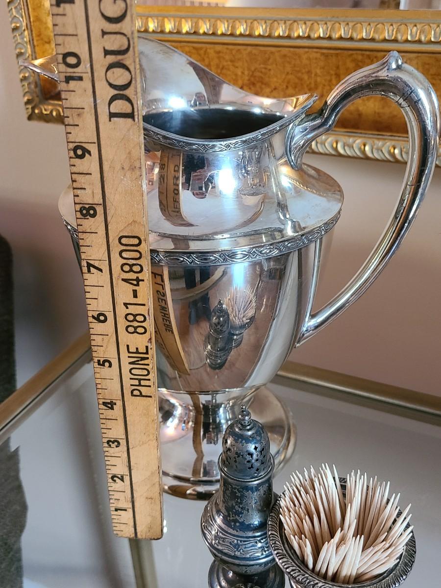 Sterling Plated Wallace pitcher and small trays. The small mutineer, salt/pepper and toothpick holder are all vintage, pre-owned pieces of marked sterling. Please see all pictures as they are the best representation of the items. The pictures show condition, measurements if taken, and what is included in the lot. Due to the large amount that we photograph and the time frame, we are not always able to take measurements. All items unless noted, are pre-owned and have been used. If you purchased furniture, you must bring help. We do not allow one person to carry large furniture out on their own. Bring help, tools and a truck for the safety of our client’s homes, and your personal safety. Any damages that result to the property including walls, and floors due to moving of the furniture will be charged to the buyer. Company policy. Thank you.
