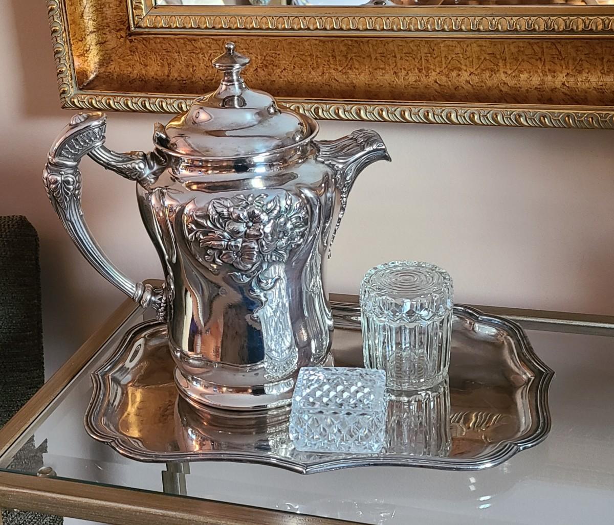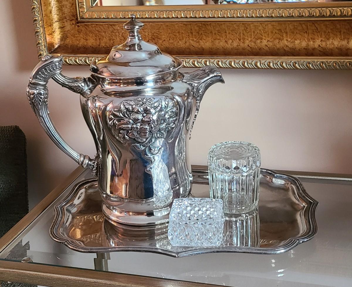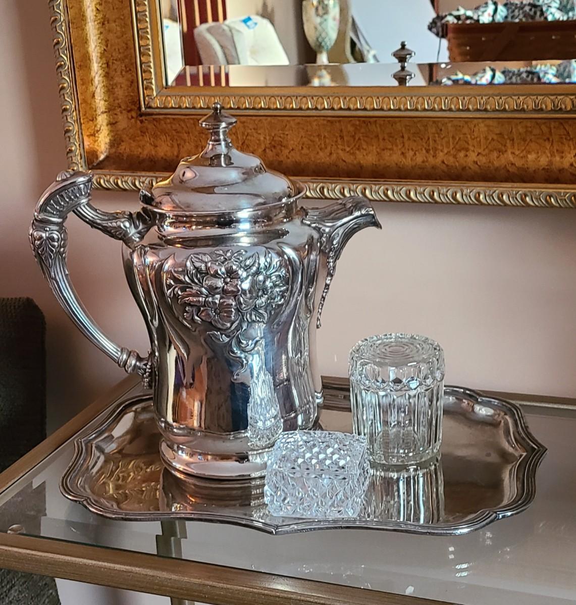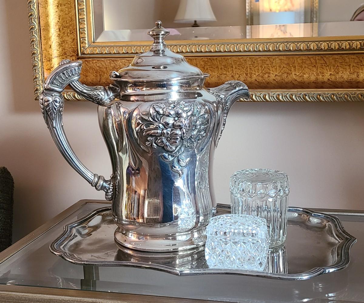 Gorgeous, and I do mean gorgeous water pitcher by Forbes, it is quadruple plated and has been kept in a curio cabinet and looks stunning, So much detail! There is also a silver-plate heavy tray that comes with this and two glass trinket boxes. Looks lovely as display or for function! Please see all pictures as they are the best representation of the items. The pictures show condition, measurements if taken, and what is included in the lot. Due to the large amount that we photograph and the time frame, we are not always able to take measurements. All items unless noted, are pre-owned and have been used. If you purchased furniture, you must bring help. We do not allow one person to carry large furniture out on their own. Bring help, tools and a truck for the safety of our client’s homes, and your personal safety. Any damages that result to the property including walls, and floors due to moving of the furniture will be charged to the buyer. Company policy. Thank you.