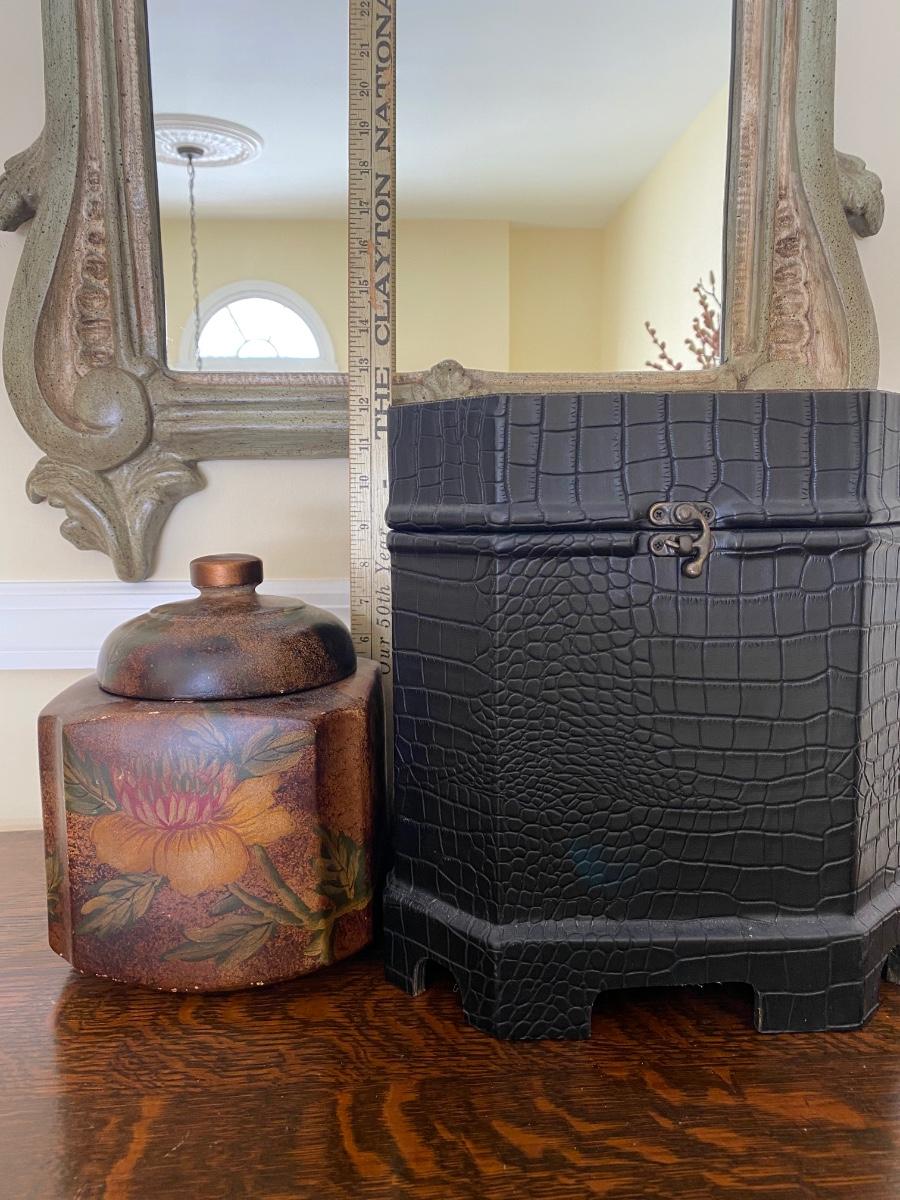 Decorative storage box and floral print ceramic trinket box w lid. Please see all pictures as they are the best representation of the items. The pictures show condition, measurements if taken, and what is included in the lot. Due to the large amount that we photograph and the time frame, we are not always able to take measurements. All items unless noted, are pre-owned and have been used. If you purchased furniture, you must bring help. We do not allow one person to carry large furniture out on their own. Bring help, tools and a truck for the safety of our client’s homes, and your personal safety. Any damages that result to the property including walls, and floors due to moving of the furniture will be charged to the buyer. Company policy. Thank you.