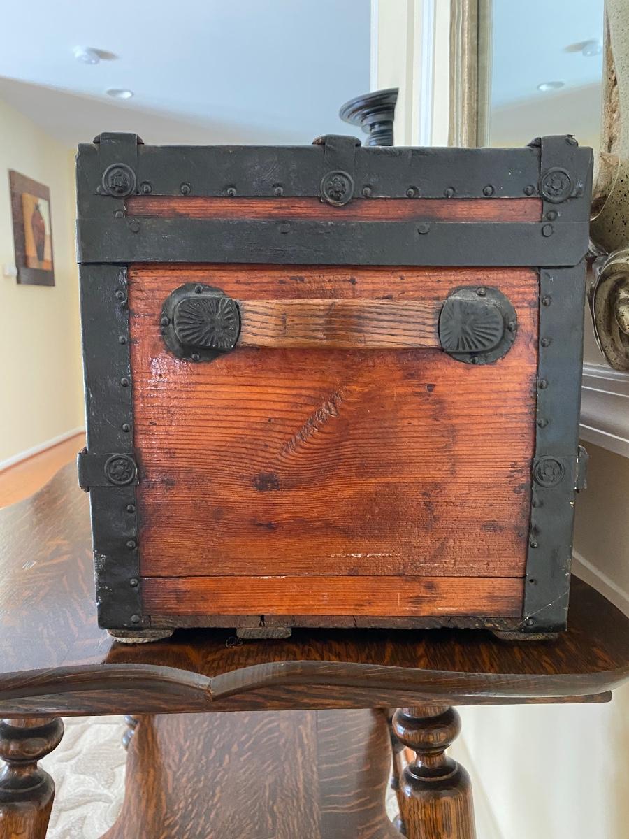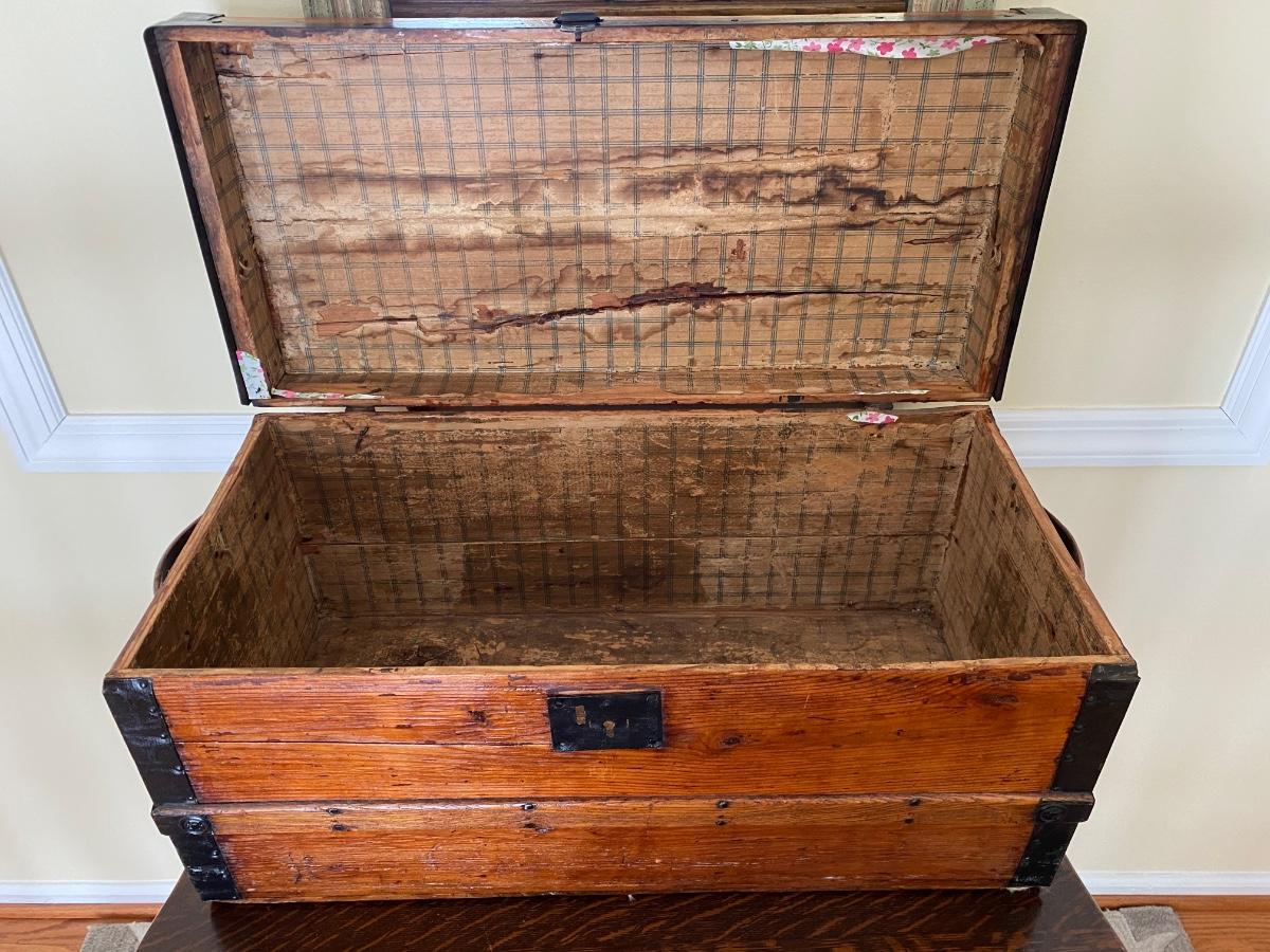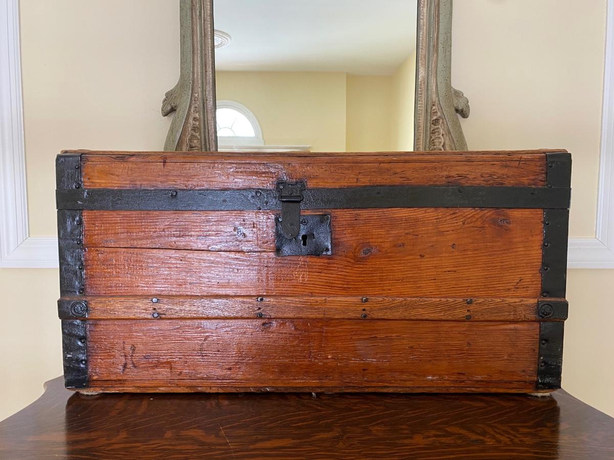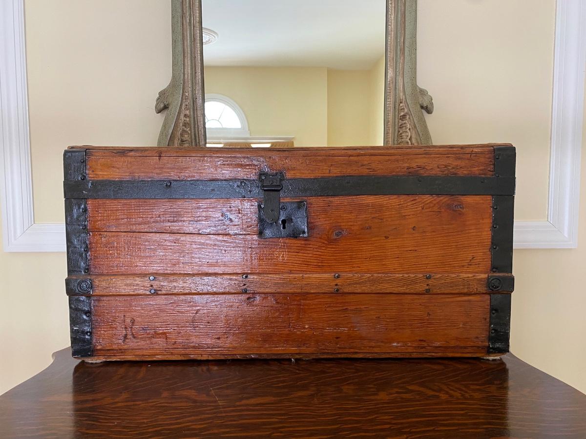 26x13x12 Antique trunk. Perfect size for smaller storage or stacking. Lock has been removed. This was used as an accent piece in a room. Please see all pictures as they are the best representation of the items. The pictures show condition, measurements if taken, and what is included in the lot. Due to the large amount that we photograph and the time frame, we are not always able to take measurements. All items unless noted, are pre-owned and have been used. If you purchased furniture, you must bring help. We do not allow one person to carry large furniture out on their own. Bring help, tools and a truck for the safety of our client’s homes, and your personal safety. Any damages that result to the property including walls, and floors due to moving of the furniture will be charged to the buyer. Company policy. Thank you.